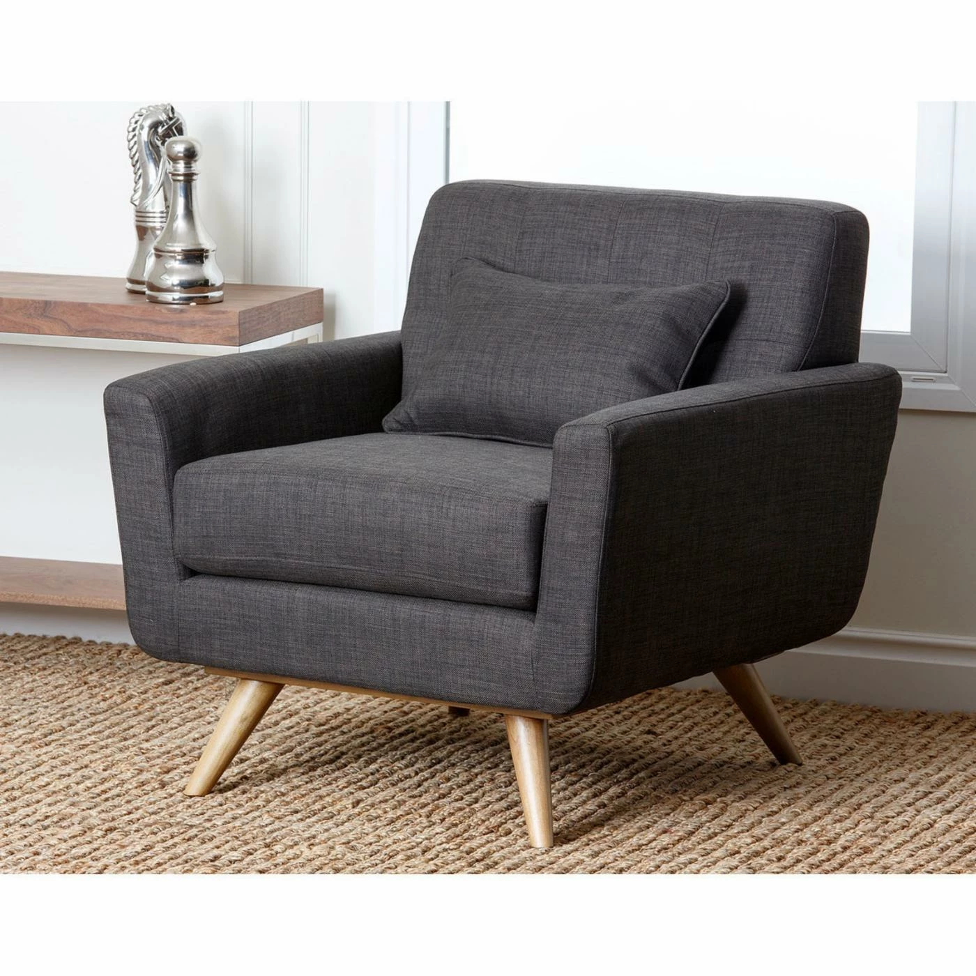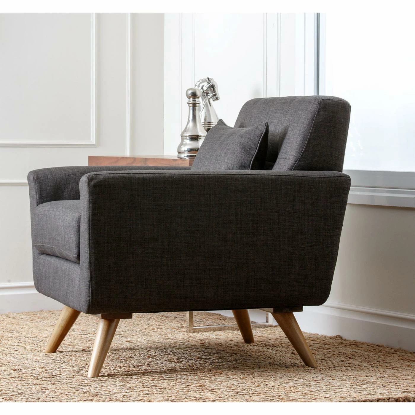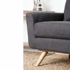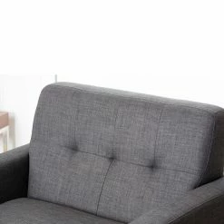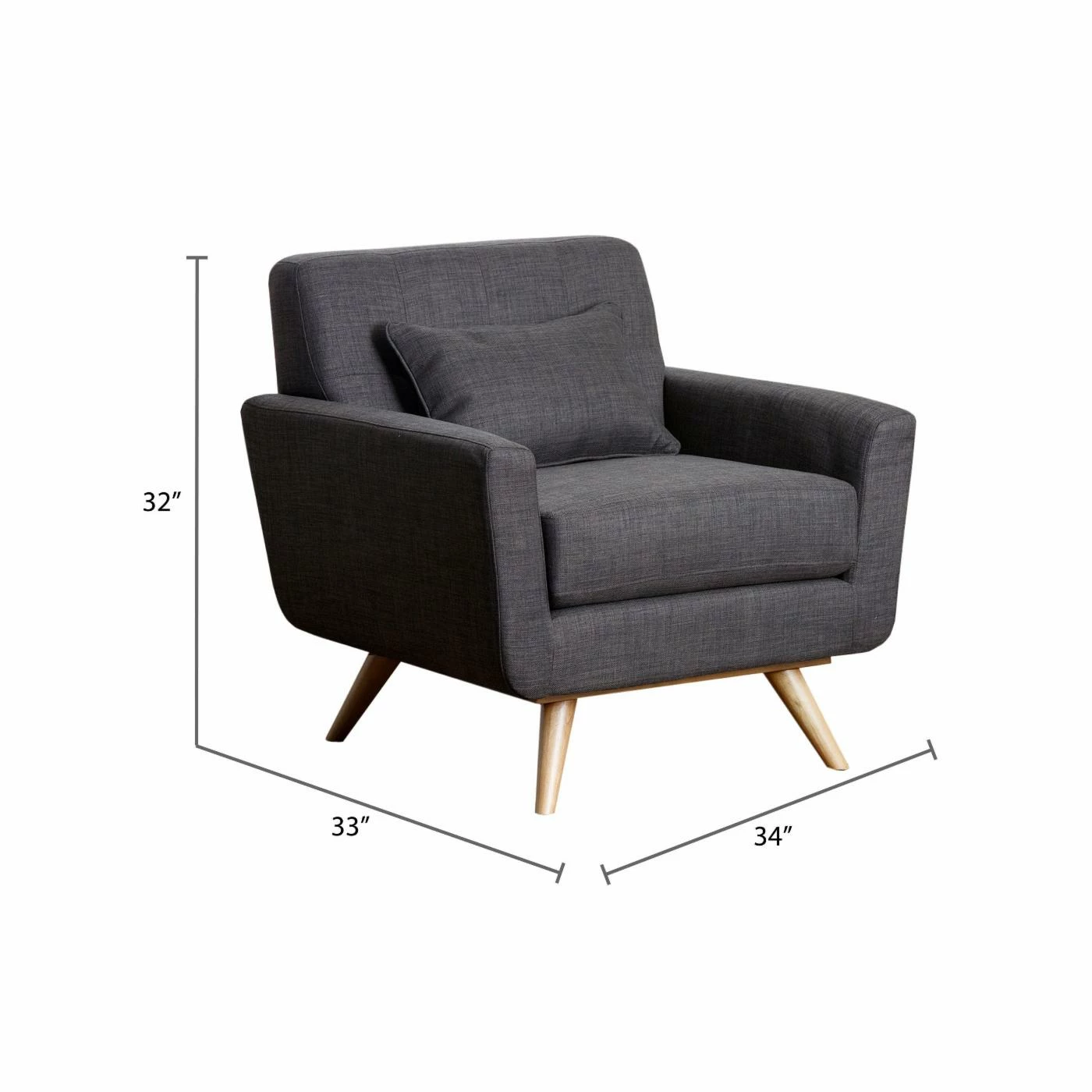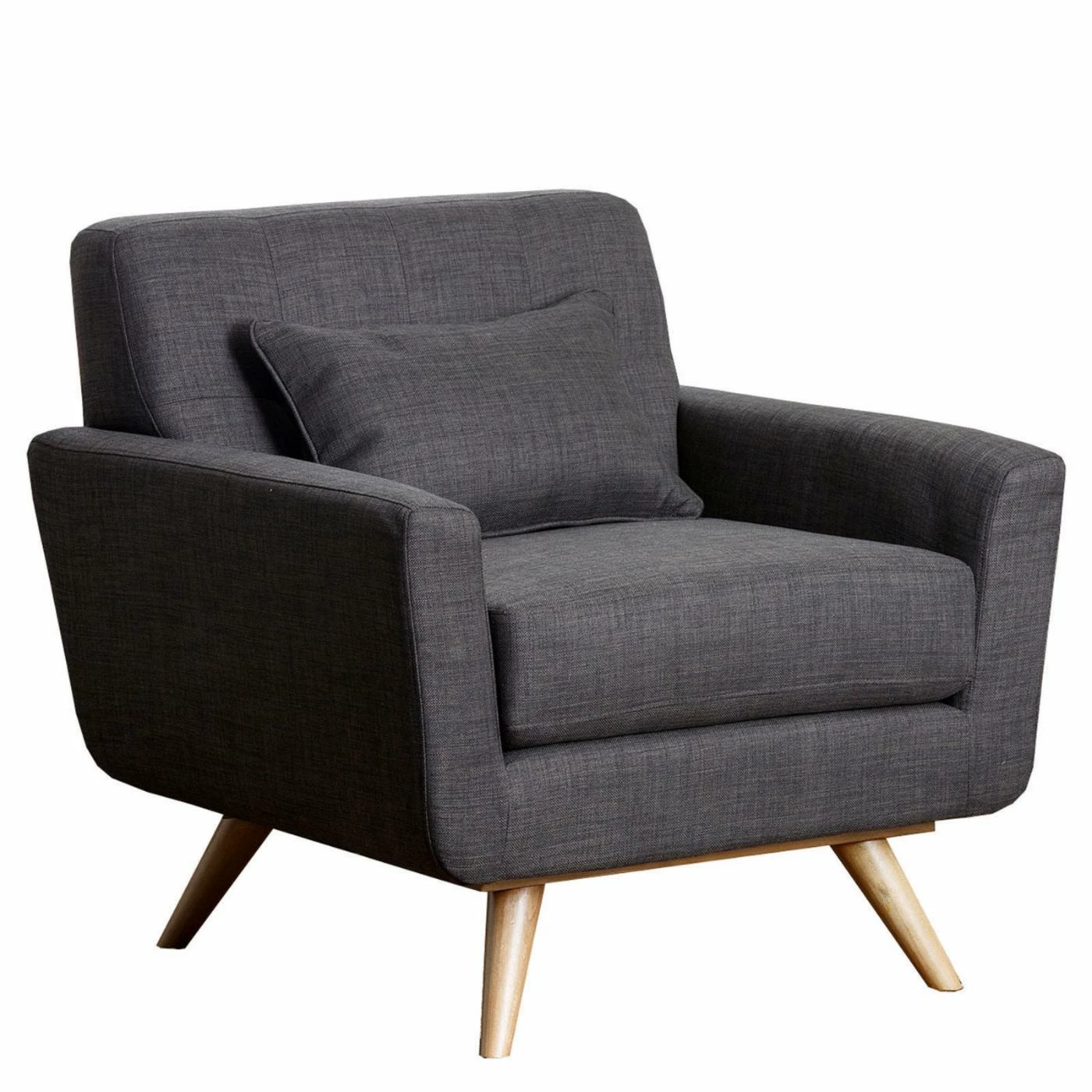 Don’t make too many plans, because once you bring home the Kline Tufted Fabric Armchair – Gray, you may not be too eager to leave. The contemporary flair of this chair starts with the deep seat and angular body, but the real comfort comes from the thick, 2.0-density foam cushioning in the seat cushion, angled back and those straight but rolled arms. The distinctive feet of solid wood give it a mid-century flavor, and the matching pillow adds a casual style to this desirable chair.