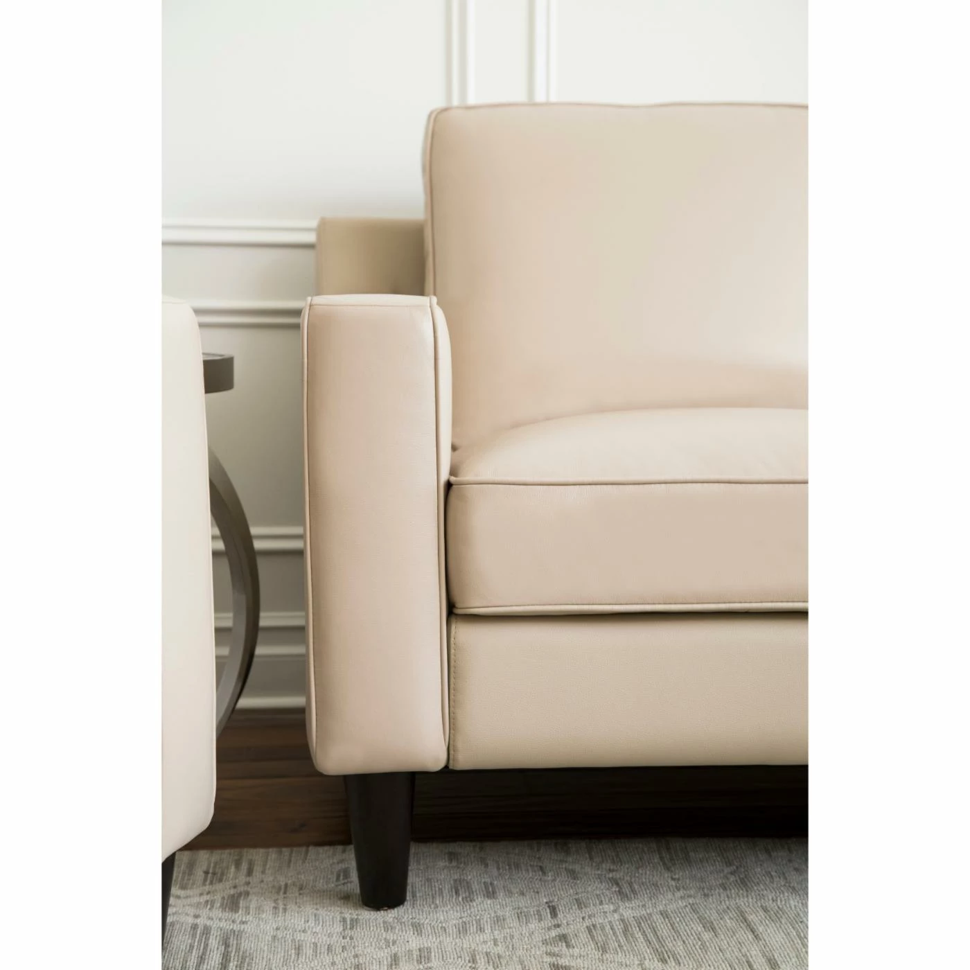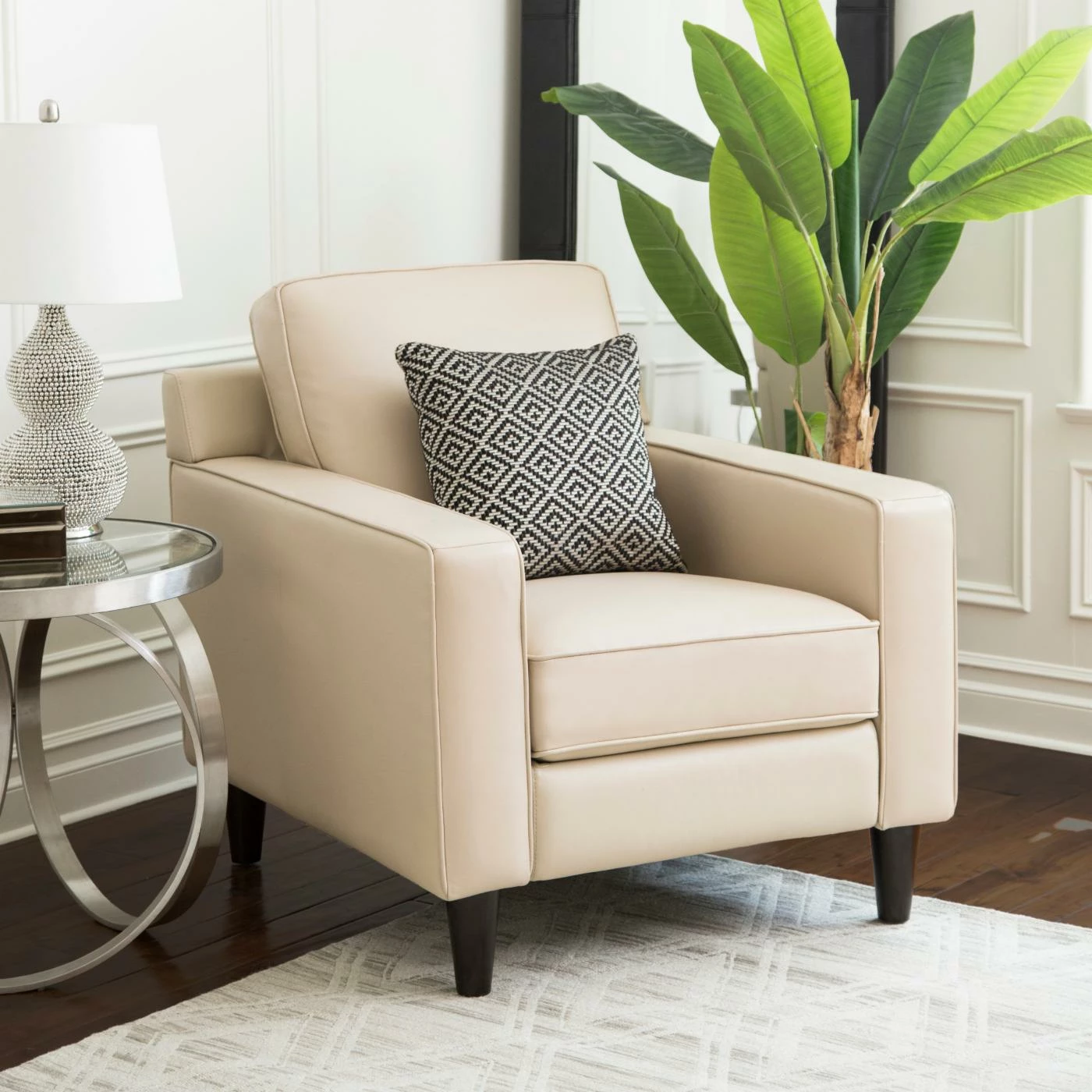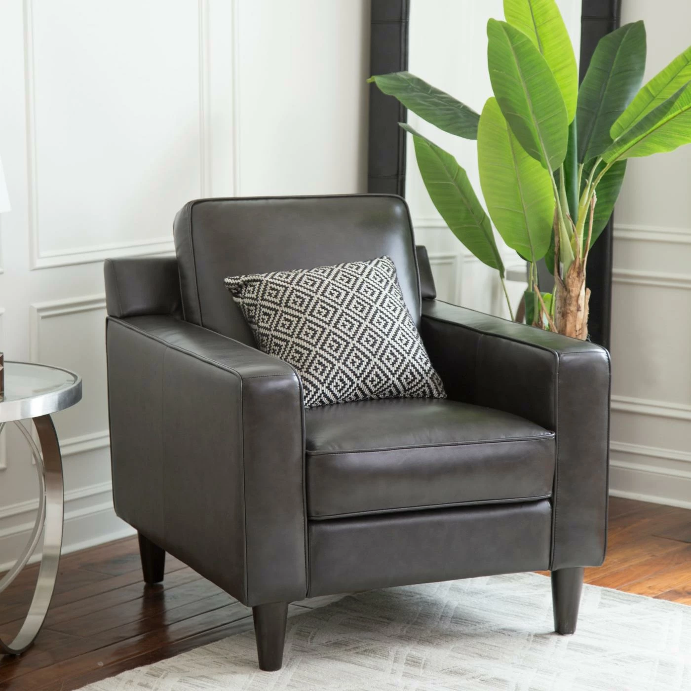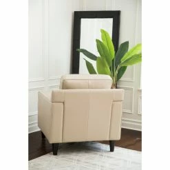 Update your home’s dรฉcor starting with a comfy chair for yourself with the Abbyson Cleo Top Grain Leather Armchair. This armchair is built with durable wood, featuring round legs and straight lines. The box cushions and frame are all stuffed with dense, soft foam. Genuine top-grain leather upholsters the piece, accented with welted seams. Choose from the available color options.