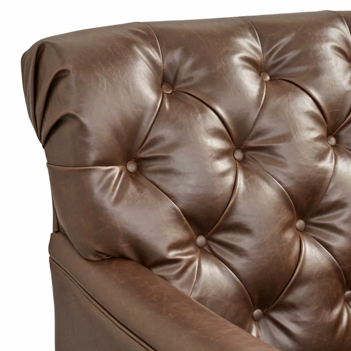 Expand your living room’s seating options without sacrificing your sophisticated foundation, thanks to the Martin Club Chair. This club chair looks like it was reclaimed from a high-class parlor, but you needn’t wear a jacket and tie to enjoy its cushy depths. Thick wood constructs the frame, which is perched on curved block rear legs and turned forelegs with brass-finished metal caster feet. Layers of dense foam pad the piece, which is upholstered in rich dark brown faux leather. The backrest is adorned with a classic diamond-tufted design.