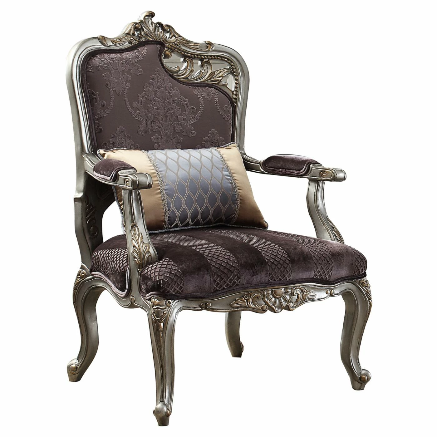 A hand-applied antique platinum and gold accent finish enhances each carved detail on the Acme Furniture Picardy Velvet Accent Chair With Pillow. Sumptuous purple velvet upholstery in a mix of detailed textures brings a luxuriously modern twist to this classically baroque accent chair. A dual-toned lumbar accent pillow adds a posh finishing touch. Complete your living room set-up by looking for other pieces in the Picardy collection.