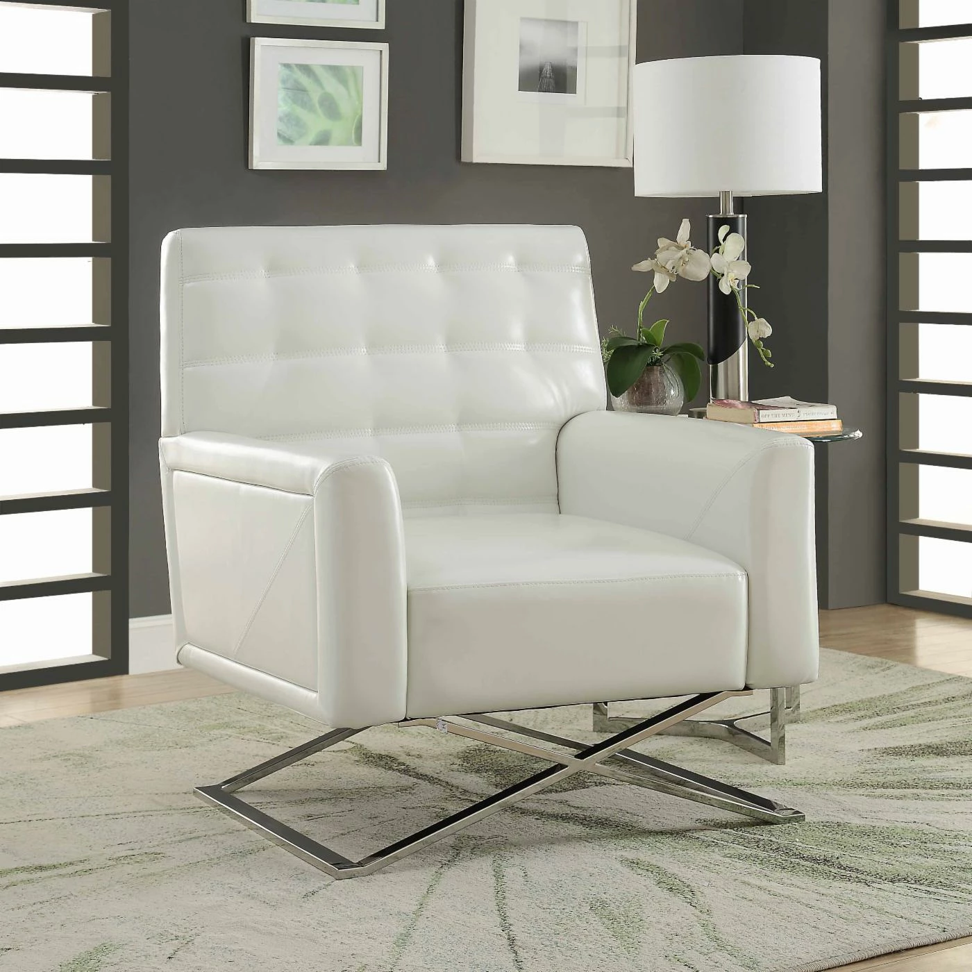 Update your home dΓ©cor with the Acme Furniture Rafael Accent Chair – White and Stainless Steel. The generous seat and back are comfortably cushioned and upholstered in white faux leather. It is supported by an X-style frame with a sleek stainless steel finish. Subtle tufting and adds detail to the backrest.