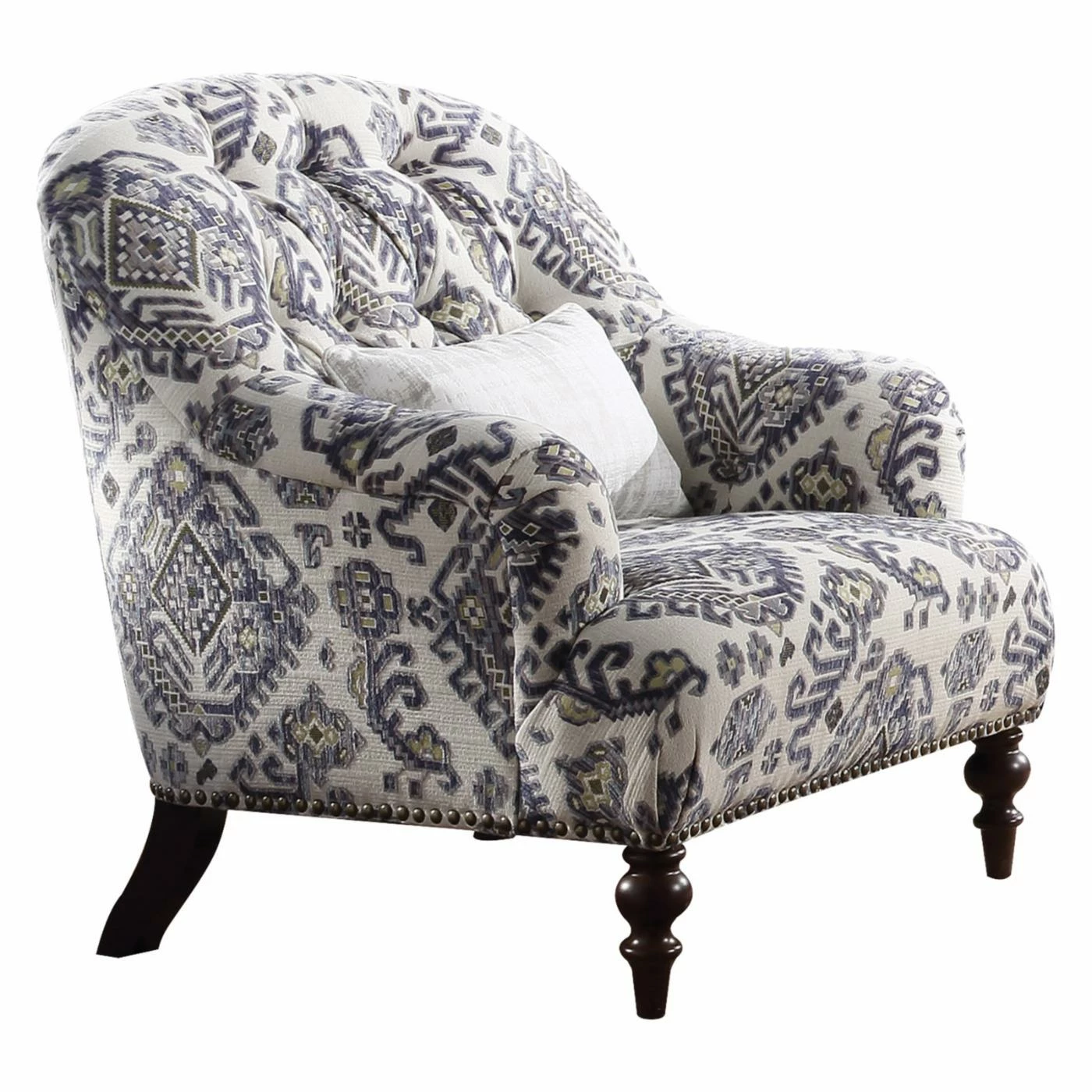 Give your home an air of vintage elegance with the Acme Furniture Saira Chair. Featuring blue and gray damask upholstery, nailhead trim, and button tufting, this chair adds classic style to any room. Its plush seat cushion is filled with down feathers and foam to provide excellent comfort, while the durable wood frame ensures this chair will last. The accent pillow is included to complete the look.