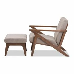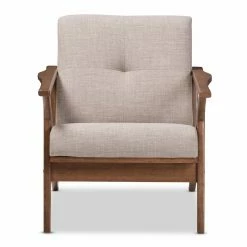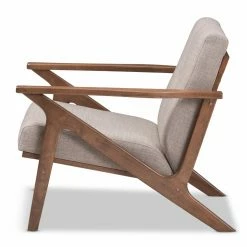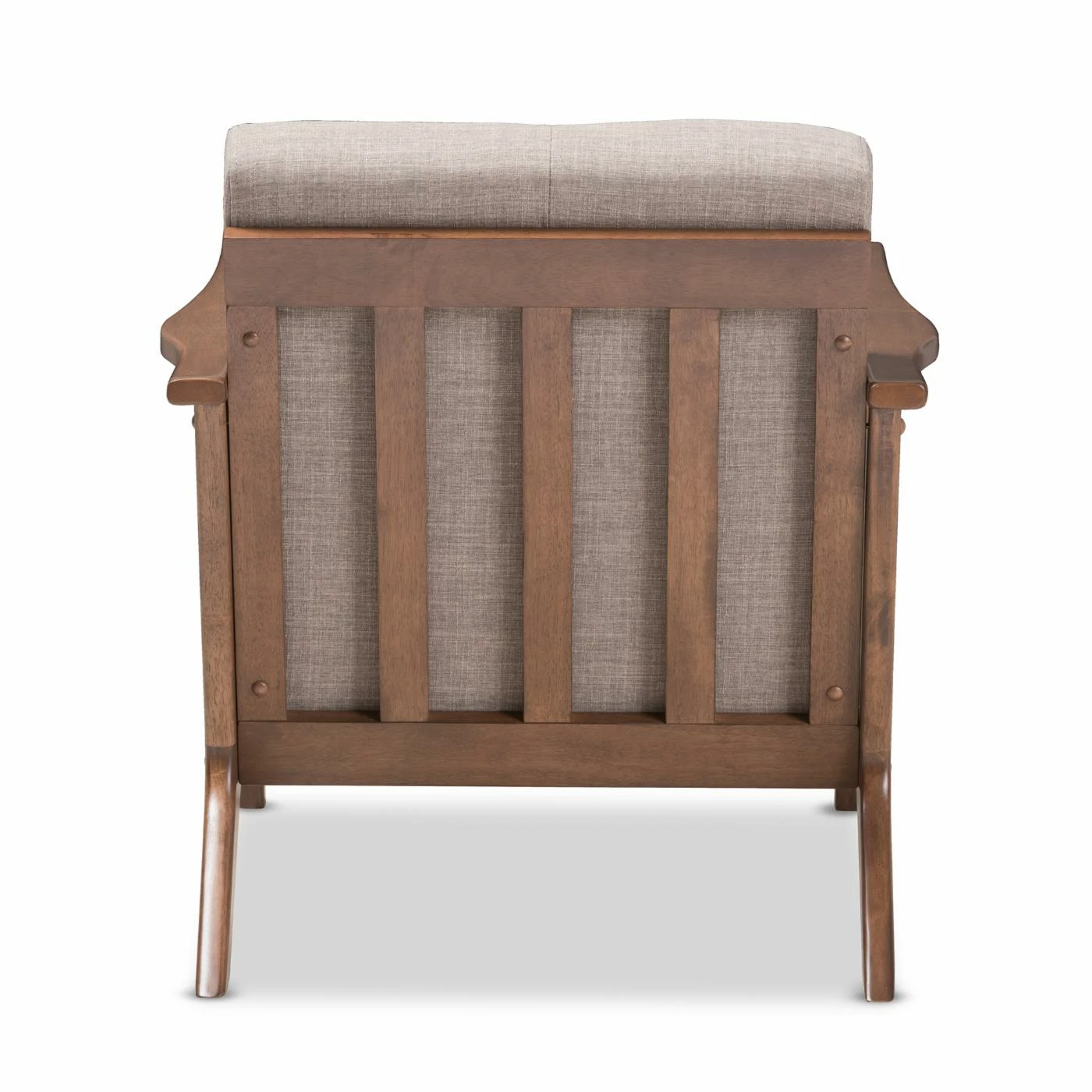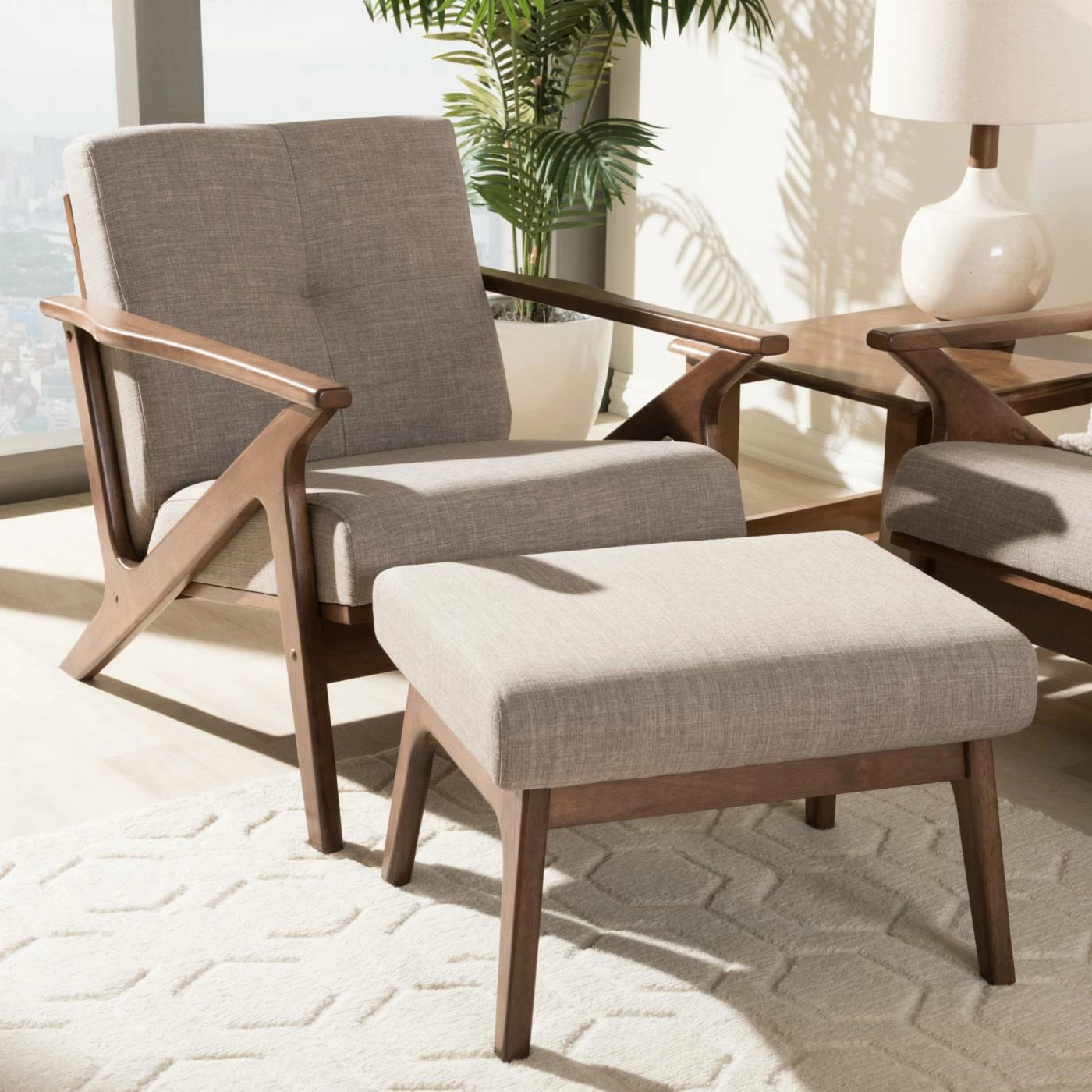 Plan a laid-back, minimalist side area for your living room or office with the Baxton Studio Bianca Fabric Tufted Lounge Chair. This charming lounge chair is a perfect place to kick back after a long day, featuring plumply-padded seat and back cushions and an angled frame with straight armrests. The frame is built from rubberwood solids and finished in walnut brown. The cushions are upholstered in a light gray polyester fabric with a tufted center. An optional matching ottoman is offered (as available; dimensions: 22.64W x 18.5D x 15.35H in.)