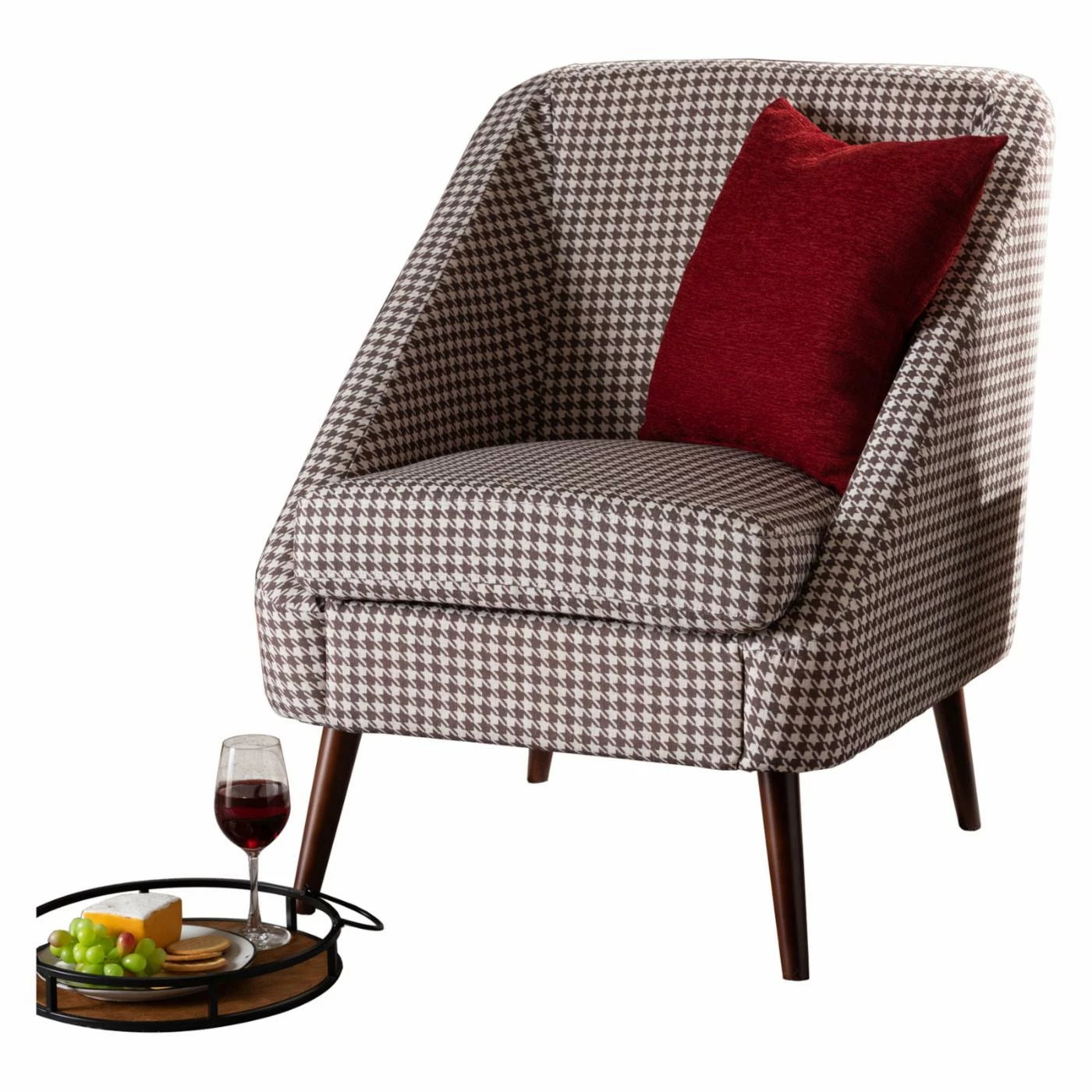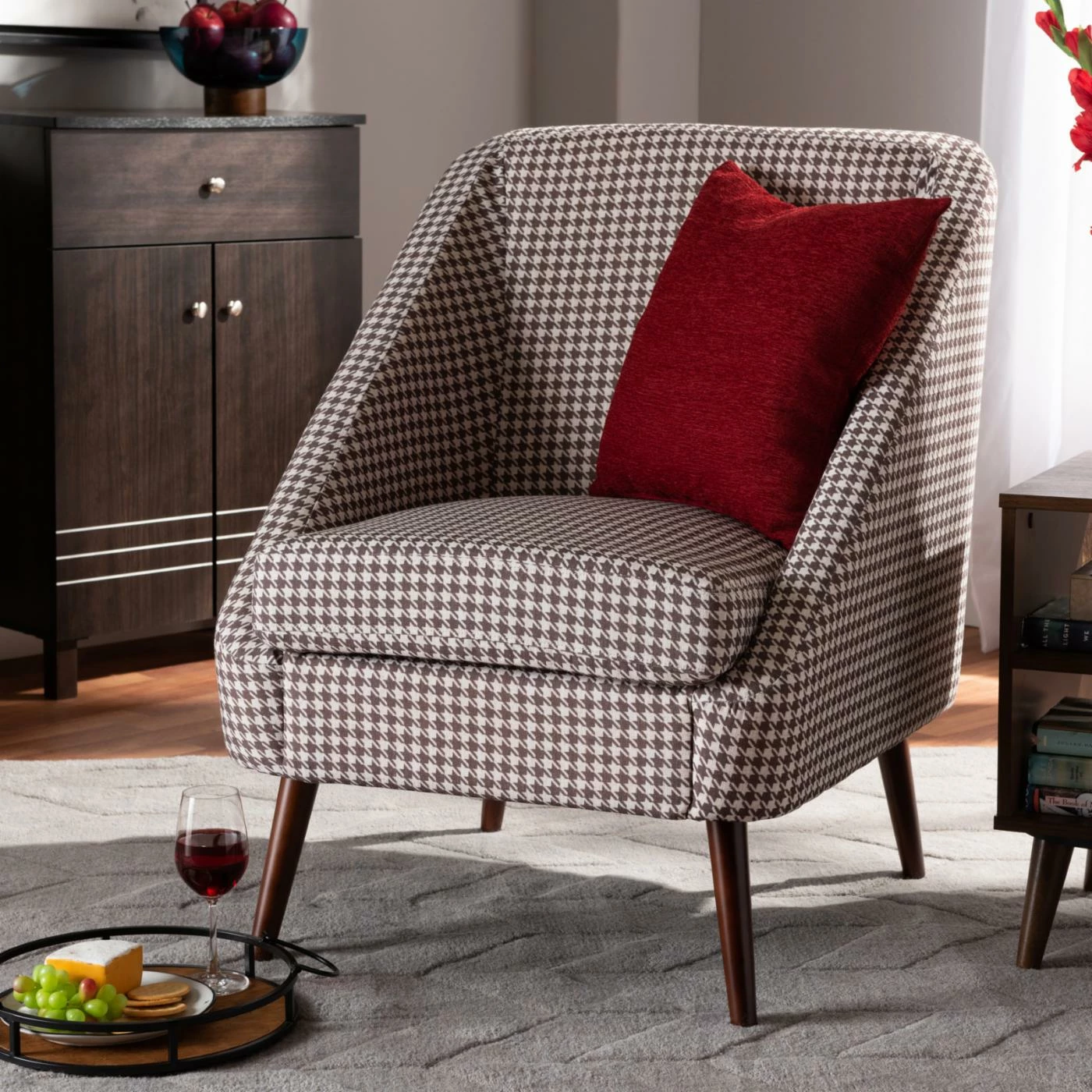 The Baxton Studio Gia Houndstooth Accent Chair makes sinking in and chilling easy. It features an ultra-plush cushioned-seat, as well as soft fabric for a relaxing feeling. Meanwhile, its houndstooth pattern ensures that this chair will be a bold, standout addition to your living room.