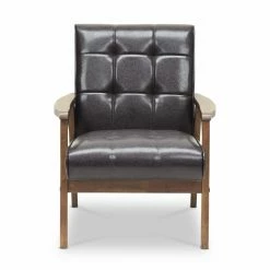 Long, lean mid-century lines updated to accommodate today’s homes, the Baxton Studio Mid-Century Masterpieces Club Chair – Brown is the best of both worlds. Inspired by the mid-century movement, this club chair stands on a solid rubberwood frame. Sleek legs and curved, wide arms ensure stylish comfort. A medium brown wood stain means this club chair will fit well in any setting. Plump, high-density polyurethane foam cushioning is upholstered in brown faux leather. Tufting and welted trim adds sophistication. Slick, sleek, and oh so chic.