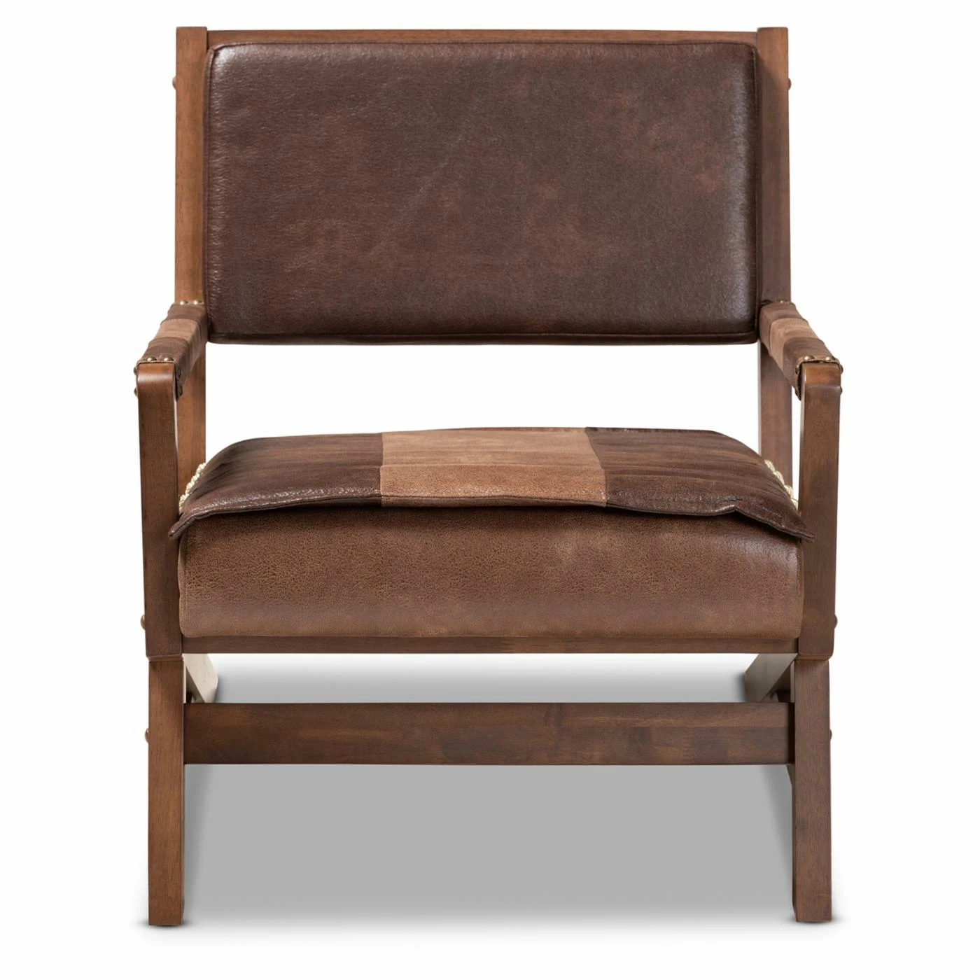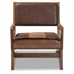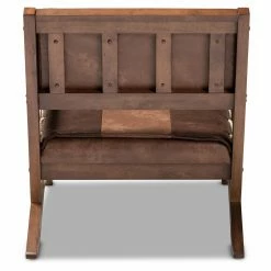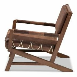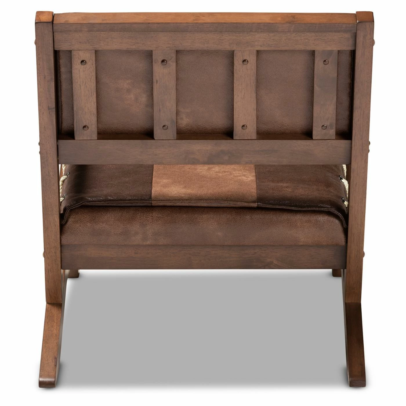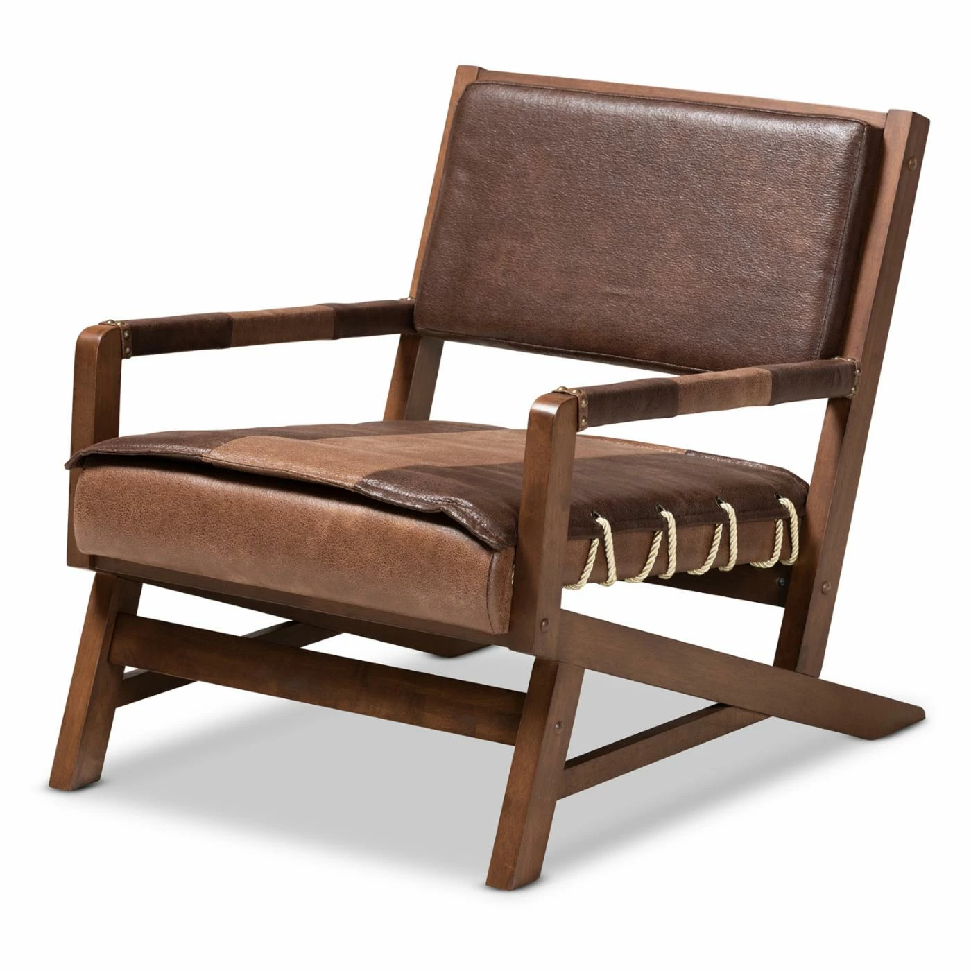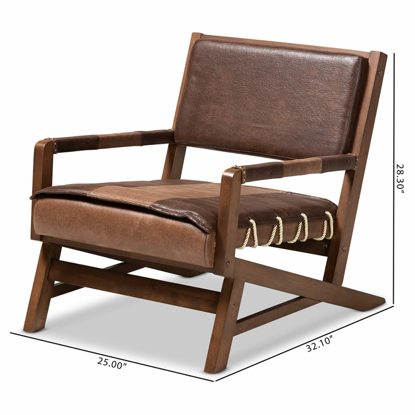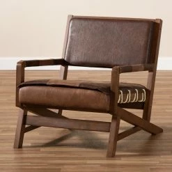 A rustic transitional look makes the Baxton Studio Rovelyn Upholstered Lounge Chair an attractive addition to your throwback, lounge-style room. The frame is built from solid rubberwood with a low seat and angled slats. Dark walnut brown finishes the wood. The back cushion and seat are each stuffed the plump, soft foam. Dark and light brown faux leather upholster the piece, accented with rope for a jaunty nautical look.