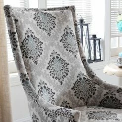 The Best Master Furniture Audrey Gray Damask Fabric Living Room Accent Chair is a cozy and sophisticated addition to your bedroom or living room. The smooth fabric upholstery boasts a striking floral damask print in blue, gray, and white. It’s complete with a high back and sloped arms. Nail head trim adds a bit of shine to this accent chair.
