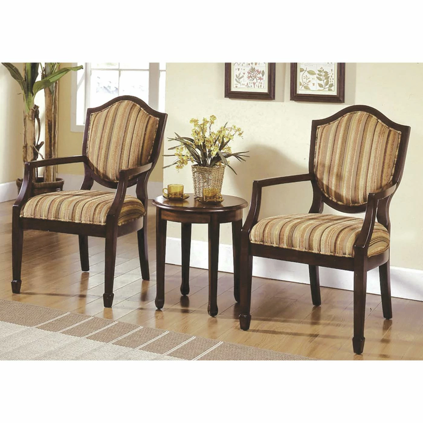 The Best Master Furniture Brandee 3 Piece Traditional Living Room Accent Chair and Table Set brings a timeless elegance to any corner of your home. Solid wood craftsmanship ensures this set will last. The padded backrests and seats are upholstered in smooth fabric in warm-toned stripe print. A dark finish covers the exquisite woodwork of this set.