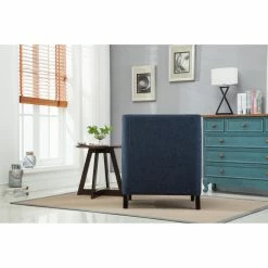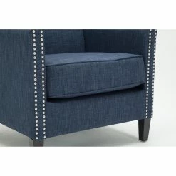 The Comfort Pointe Taslo Accent Chair features double rows of chrome nailhead trim for a distinctive look. The comforable club chair has a 6.5-inch-thick cushion that is reversible for even wear. The chair is covered in smooth fabric (100% polyester). The chair is crafted of wood and has an espresso finish. The seat height is 18.5 inches. The accent chair is available in your choice of solid color. Spot clean any spills or stains immediately. The chair does not requie any assembly.