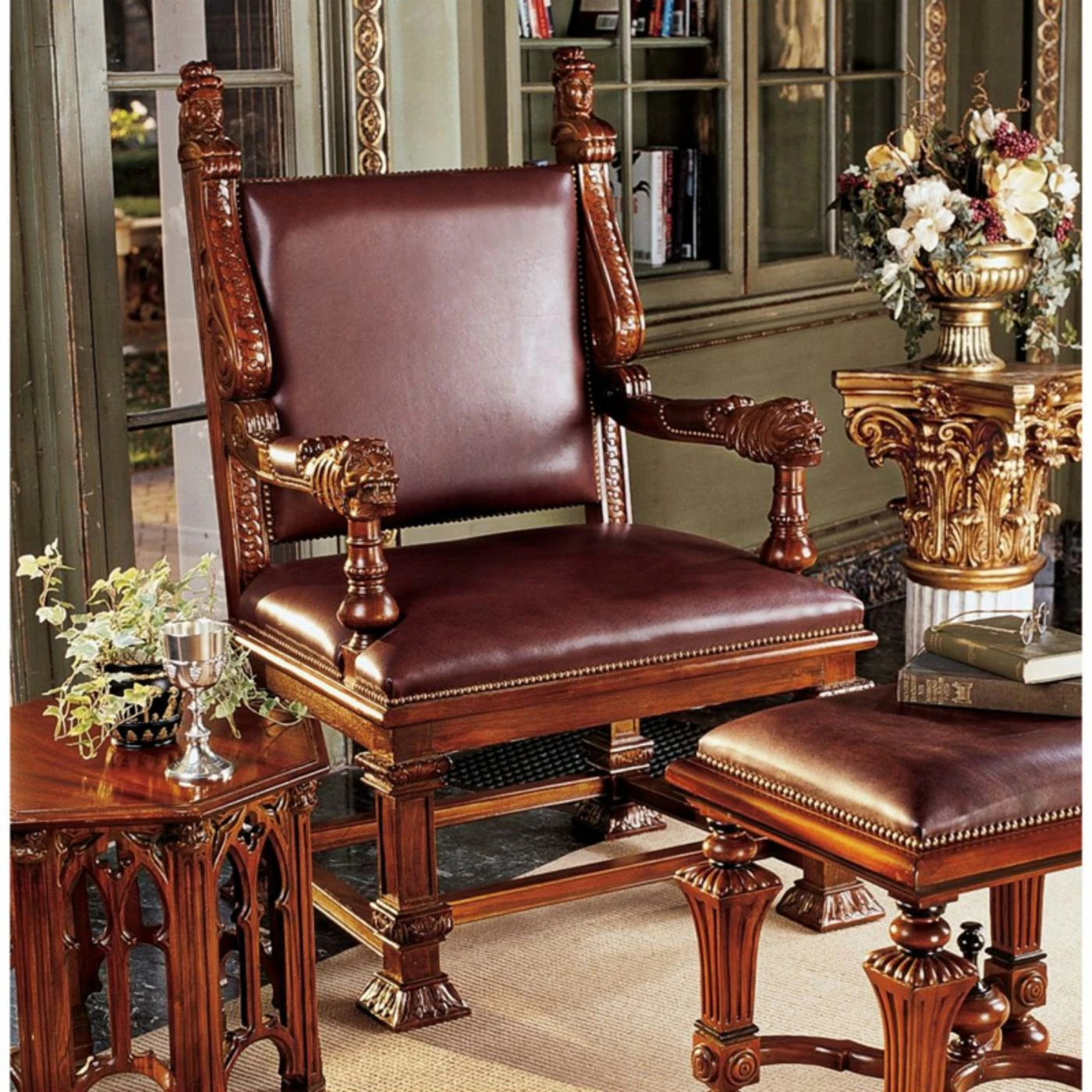 Feel like Georgian royalty with the Design Toscano Lord Cumberlands Throne Chair as part of your living room. This handsome chair is rendered from solid and robust hardwood with a deep mahogany brown finish. The frame is carved all over its surface with finial tops and carved lion-head armrest caps. The backrest and seat come padded with foam and upholstered in a deep red leather. Brass nailheads stud the fabric edge, lending an elegant touch. An optional matching footstool is offered (as available); Ottoman Dimensions: 22W x 18D x 21H in.