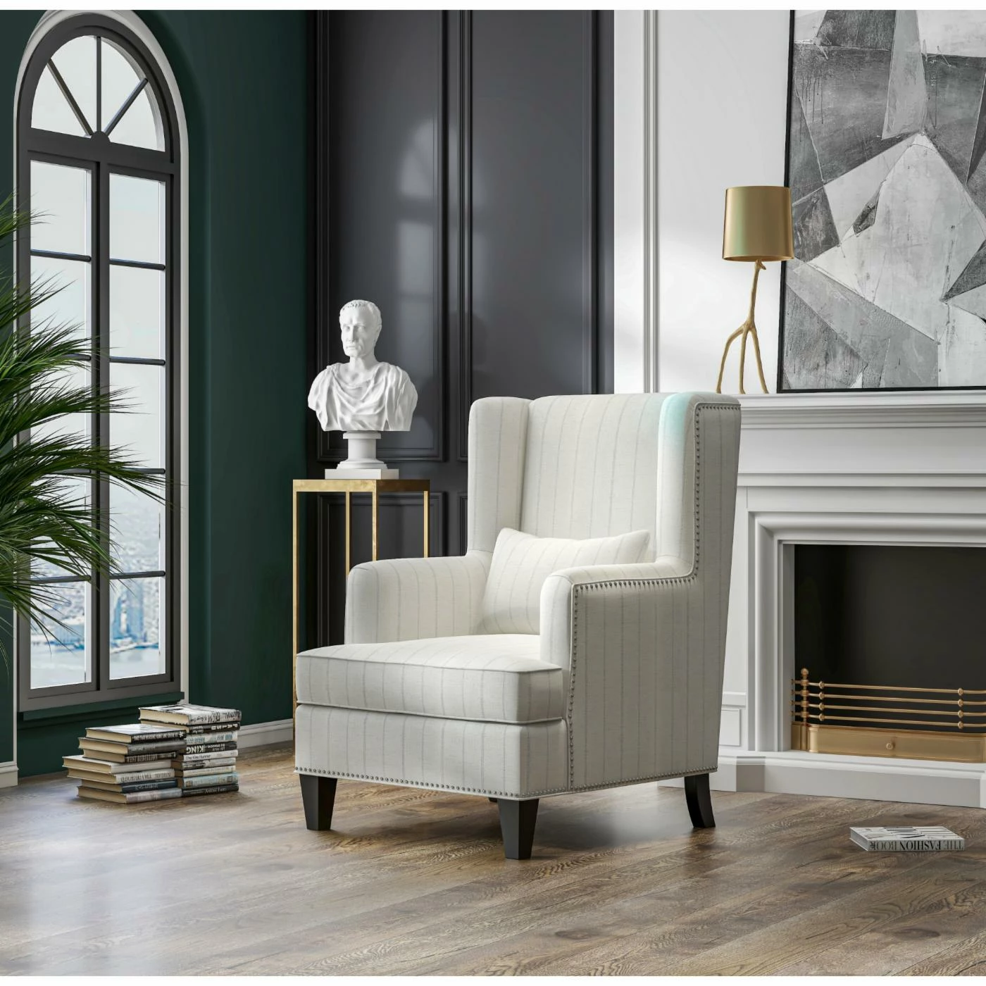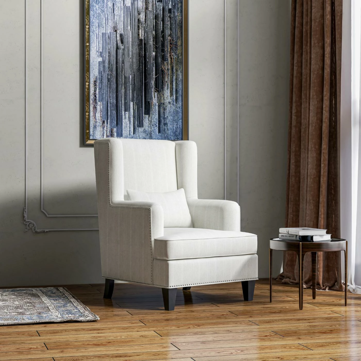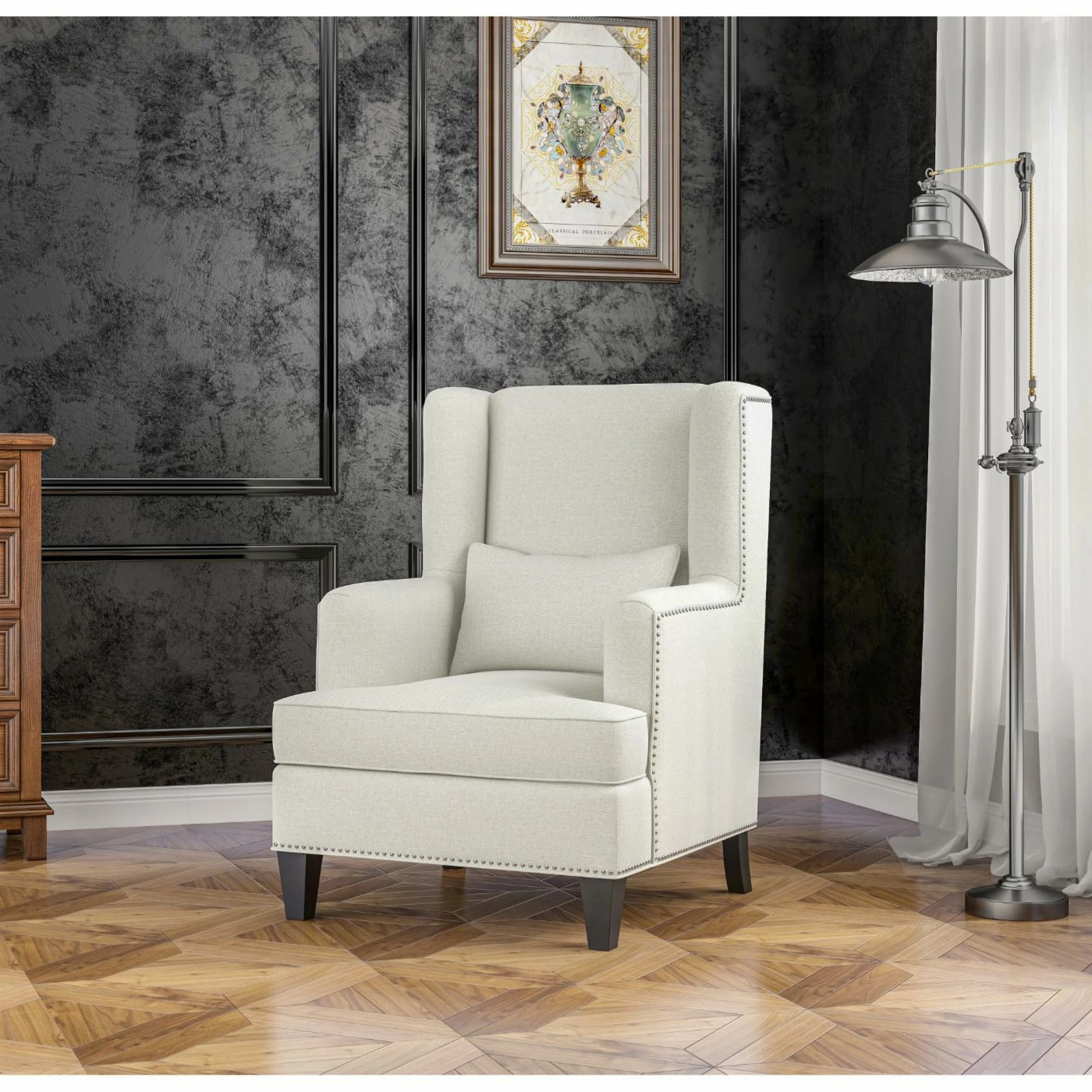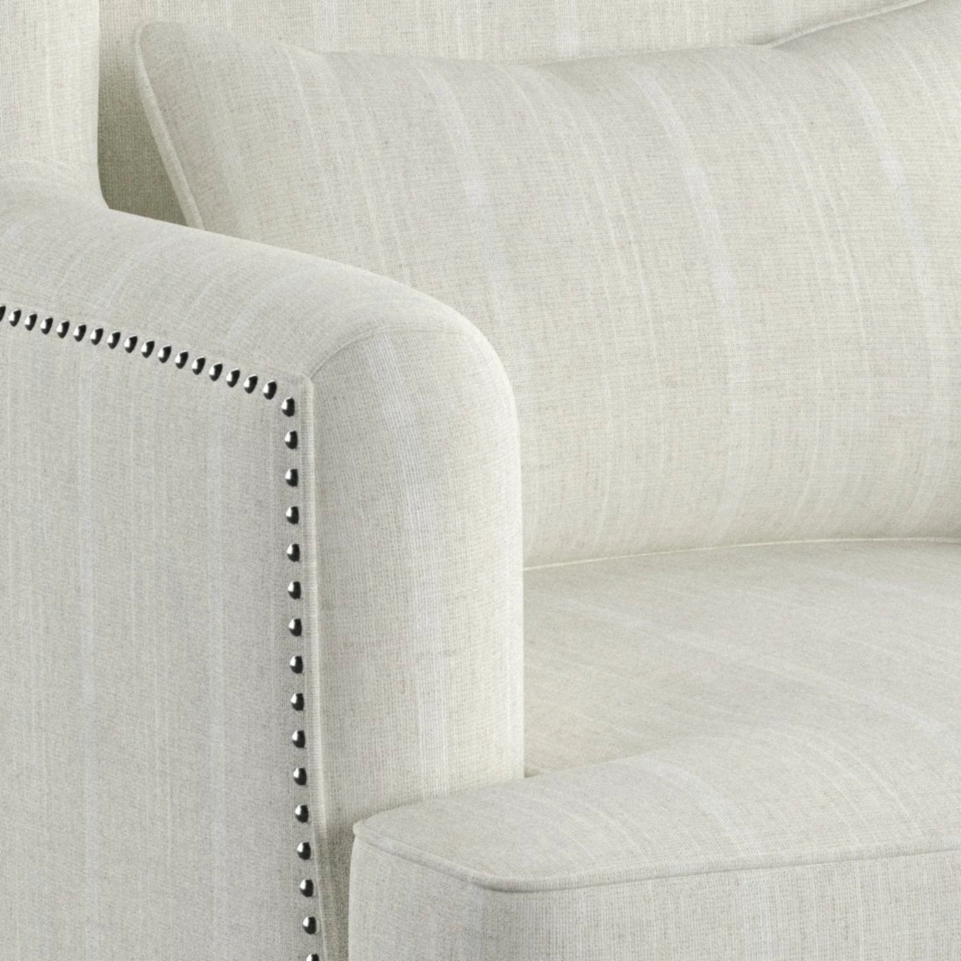 - Wingback design with nailhead trim