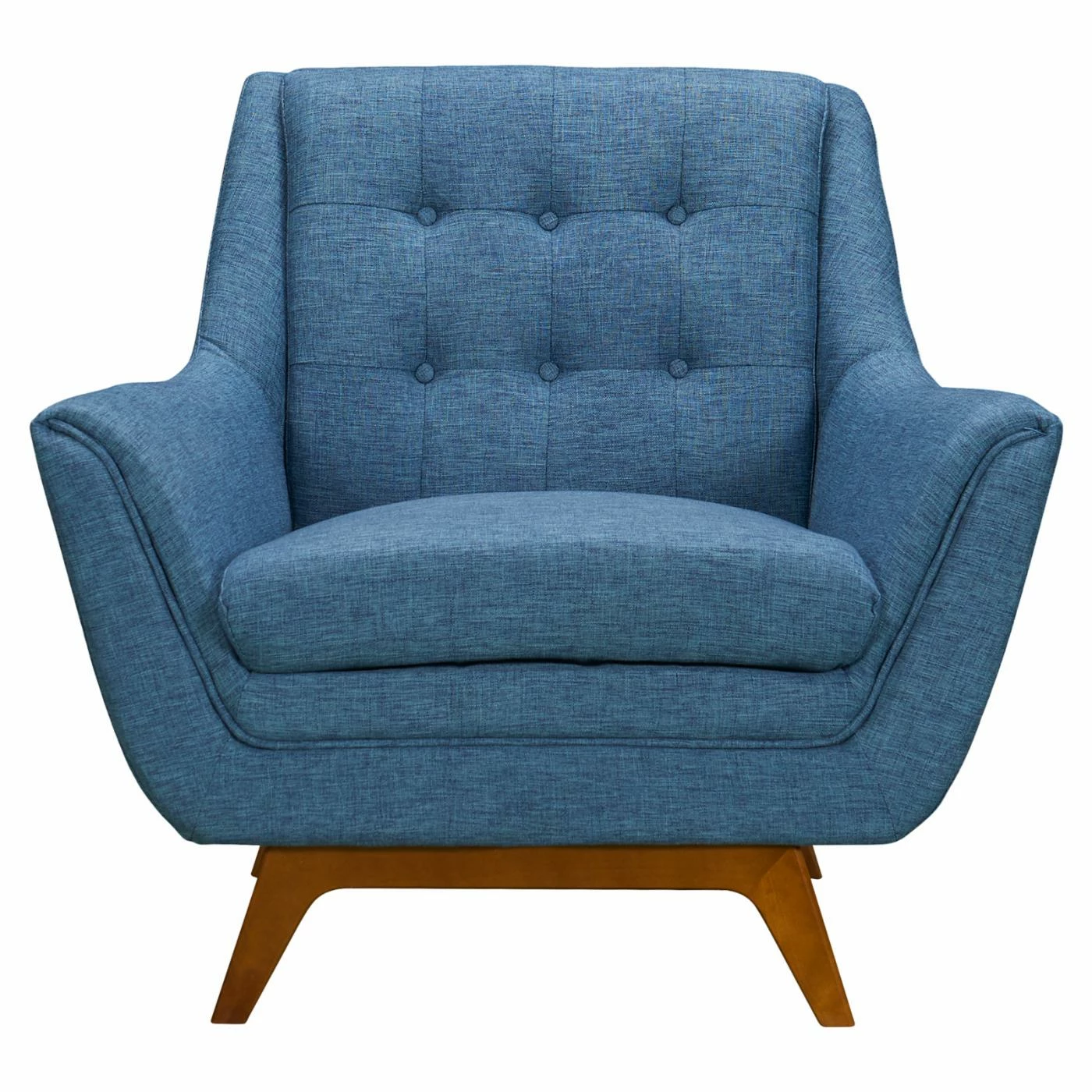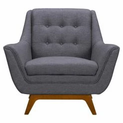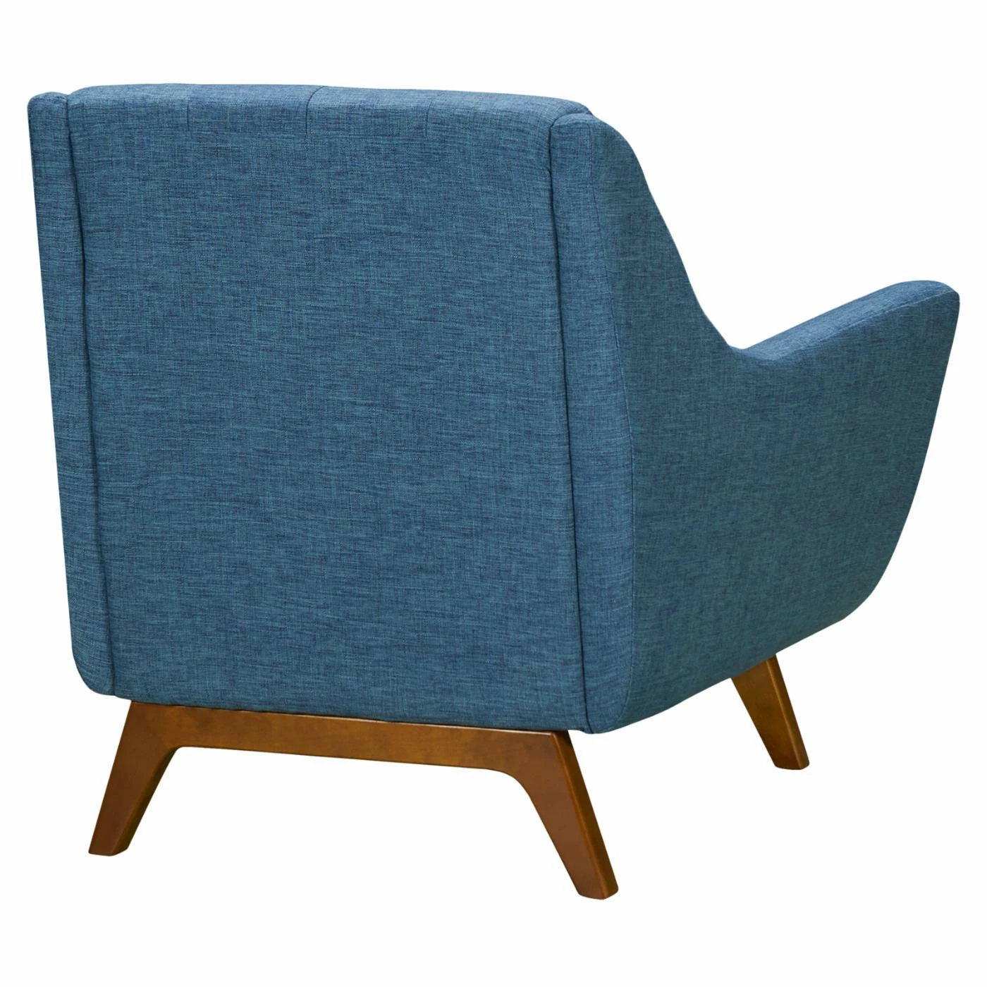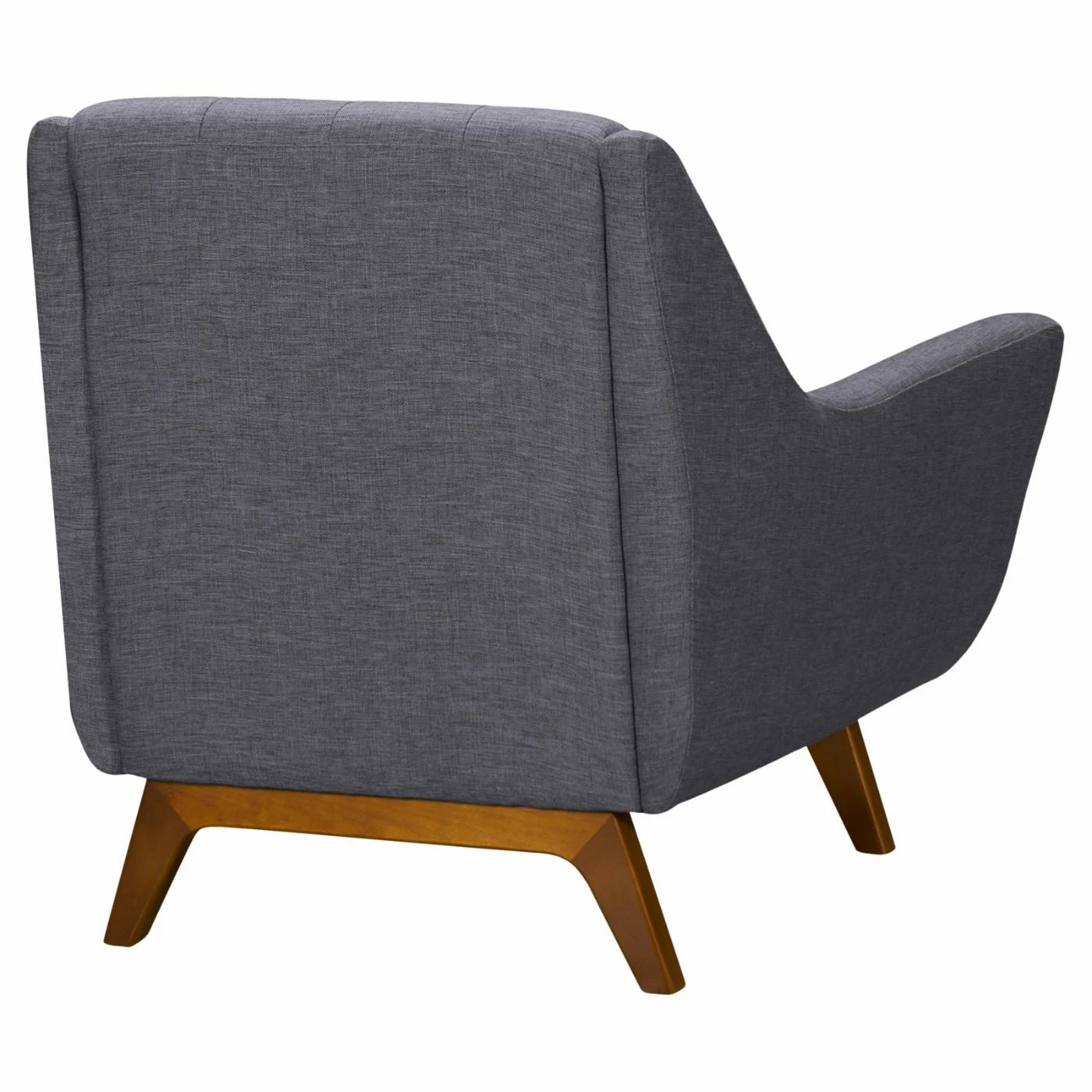 Add a little vintage-modern eclecticism amid leather and metal pieces. The Home Chic Lucca Mid-Century Sofa Chair is framed in durable rubberwood with a high back and coolly flared arms. The exposed wood base, finished in warm medium brown, spreads at a complementary angle. The seat is padded with foam for proper lumbar support, then upholstered in allover textured fabric; choose from the available color options. Welt trim and tonal button tufting are tailored details. Assembly is required.