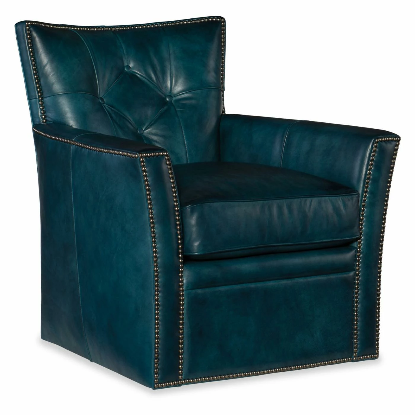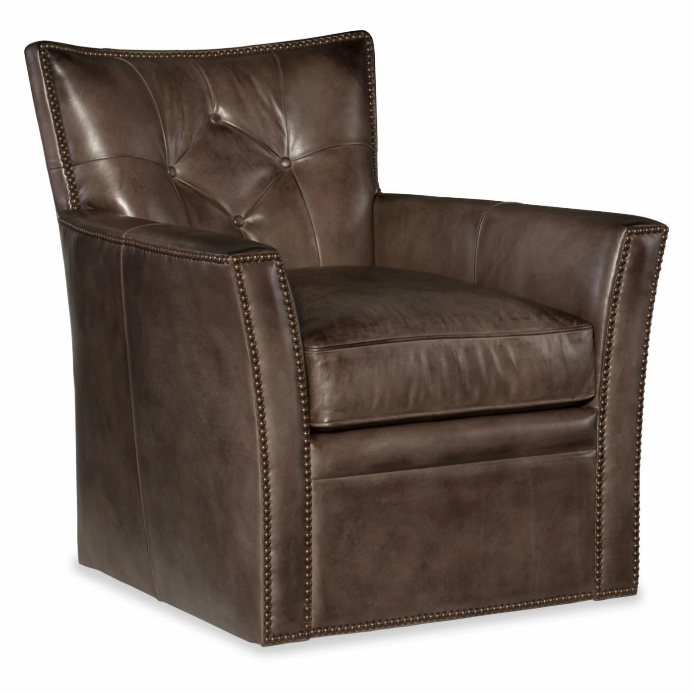 A tapering, square base and flared arms studded with nail heads make the Hooker Furniture Conner Swivel Club Chair an updated take on a classic. This club chair sits on a smooth swiveling base that makes it fun and comfortable. It’s well-built on a kiln-dried hardwood frame topped with premium cushioning. This swiveling club chair is upholstered in your choice of available leather color.
