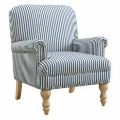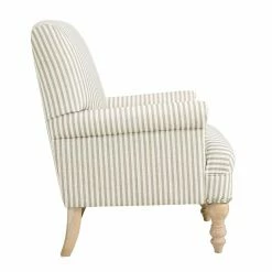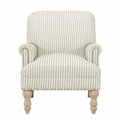 The beige HumbleNest Homestead Striped Accent Arm Chair features a striped pattern with silver nailhead detail along the front of the arms. The country-chic feel of this chair extends to the T-cushion seating on a tight seat, and solid wood turned feet with a natural finish. The clean lines and simple silhouette make for a classic piece for any dรฉcor.