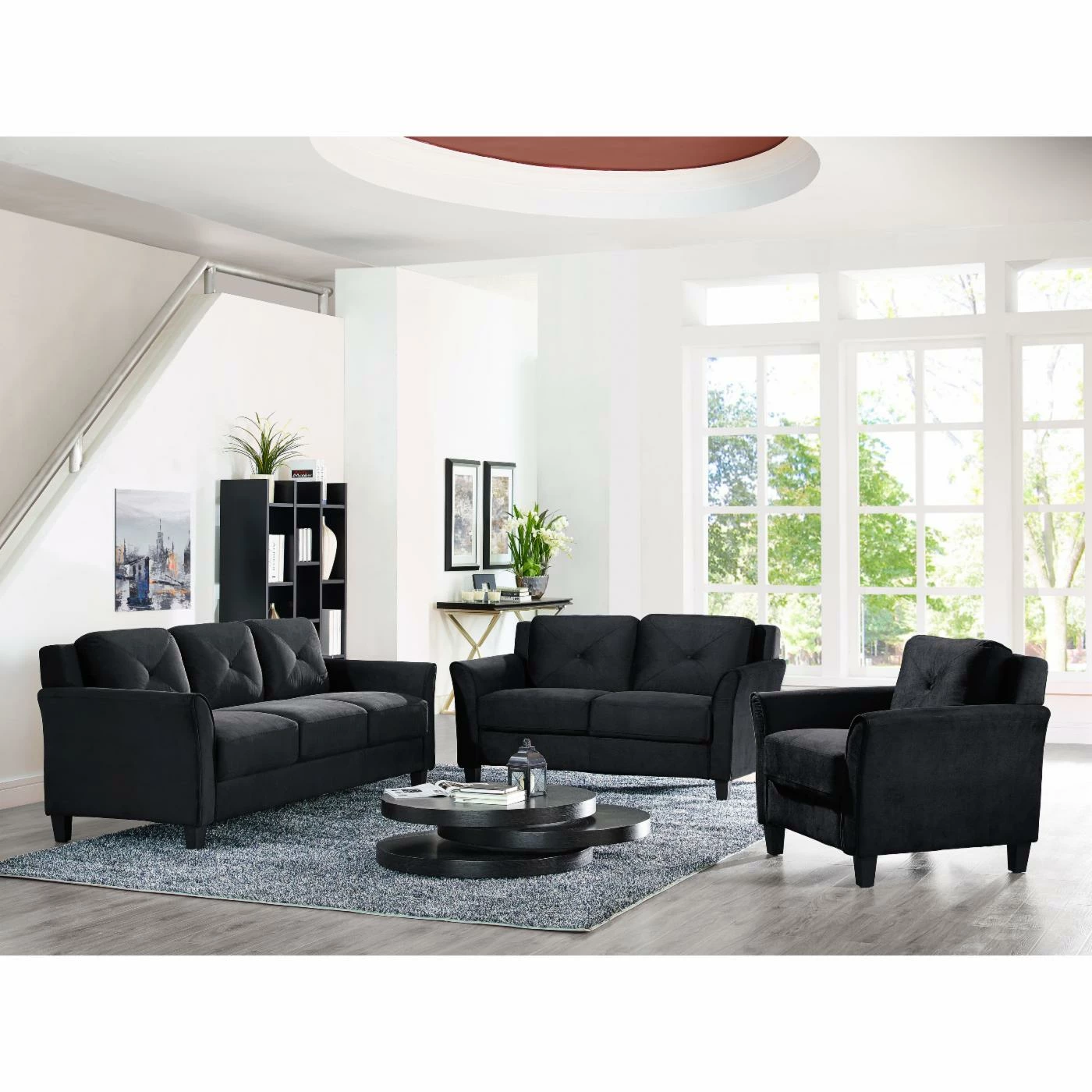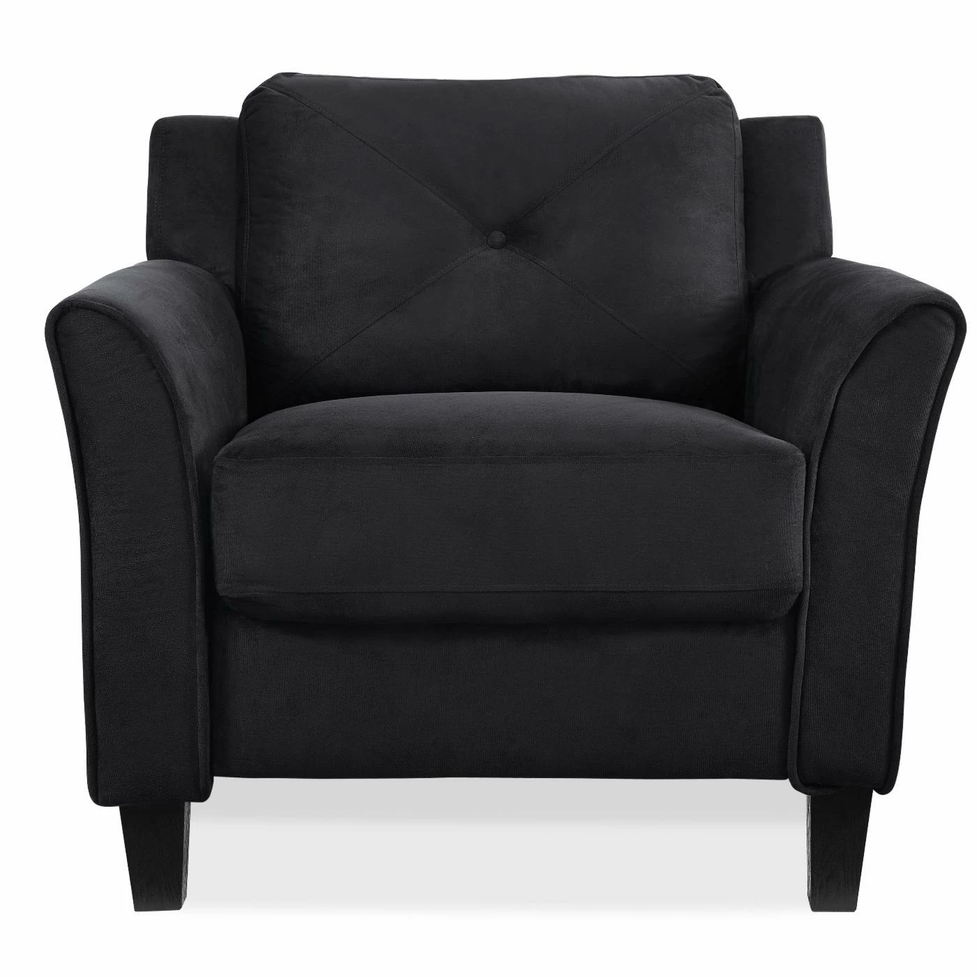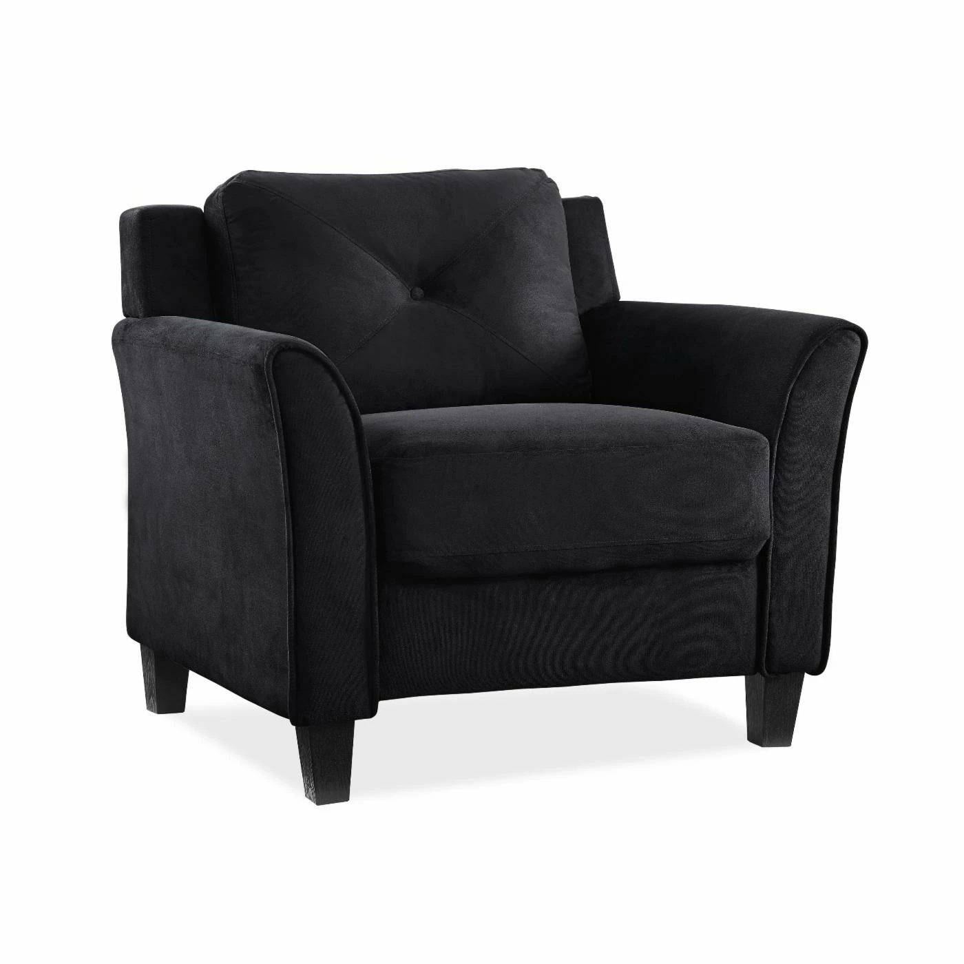 Comfort and style cross paths at the Lifestyle Solutions Harvard Armchair with Curved Arm. Part of the Harvard Collection, this armchair features generous cushioning, gently curved arms, and a single button tuft on the cushion back, resulting in simple, sophisticated style. Plush, black upholstery lends a chic look and delivers lasting durability for years of use. The sturdy eucalyptus frame and tapered legs provide extra support for this living room essential.