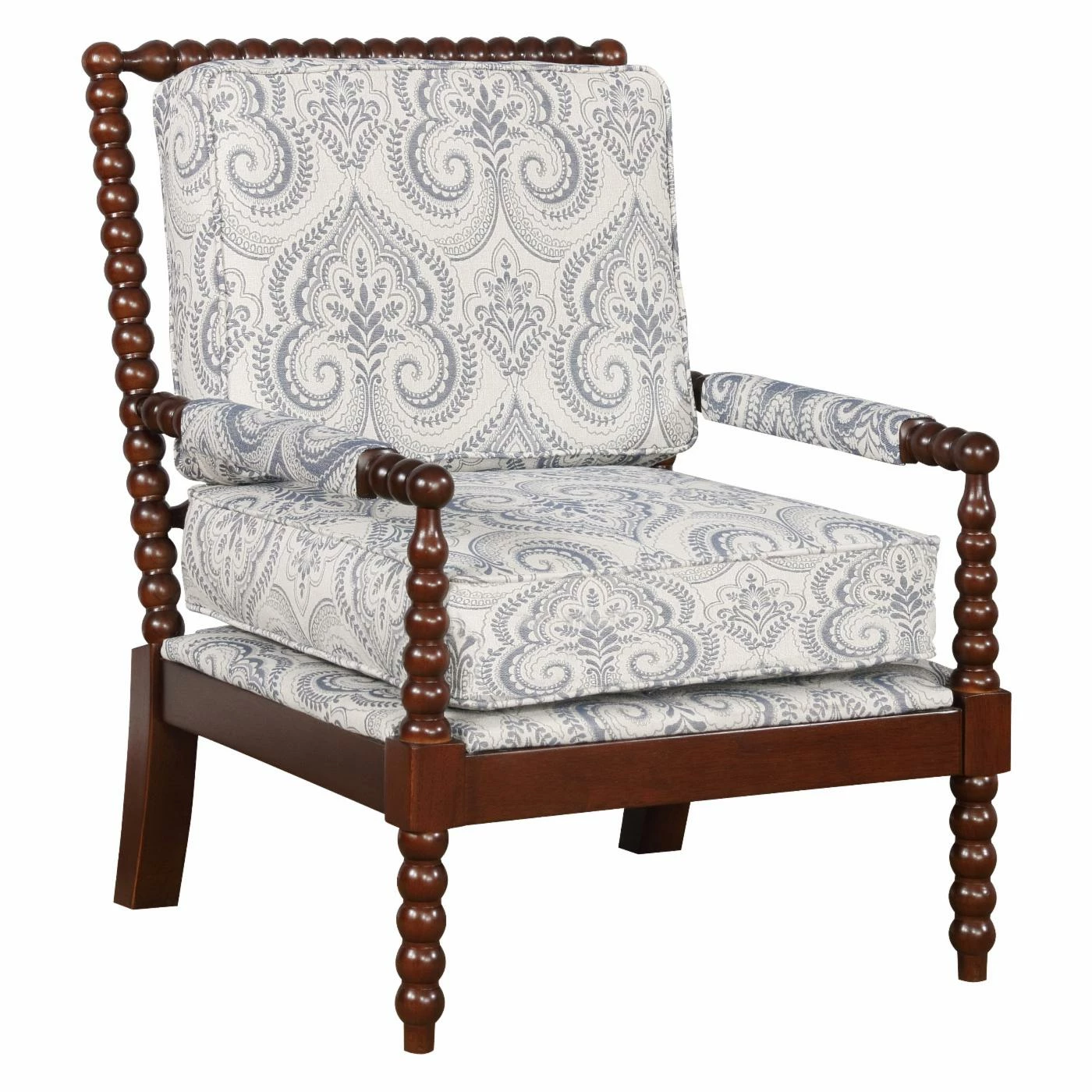 The Linon Sussex Spindle Wood Frame Accent Chair is a handsome complement for your transitional living room. This chair is made from thick wood with spindle-style accents. Dense foam is used to stuff the seat cushion, back cushion, and armrests, ensuring total comfort. A paisley fabric upholsters the piece. Choose your preferred finish and fabric color from the available options.