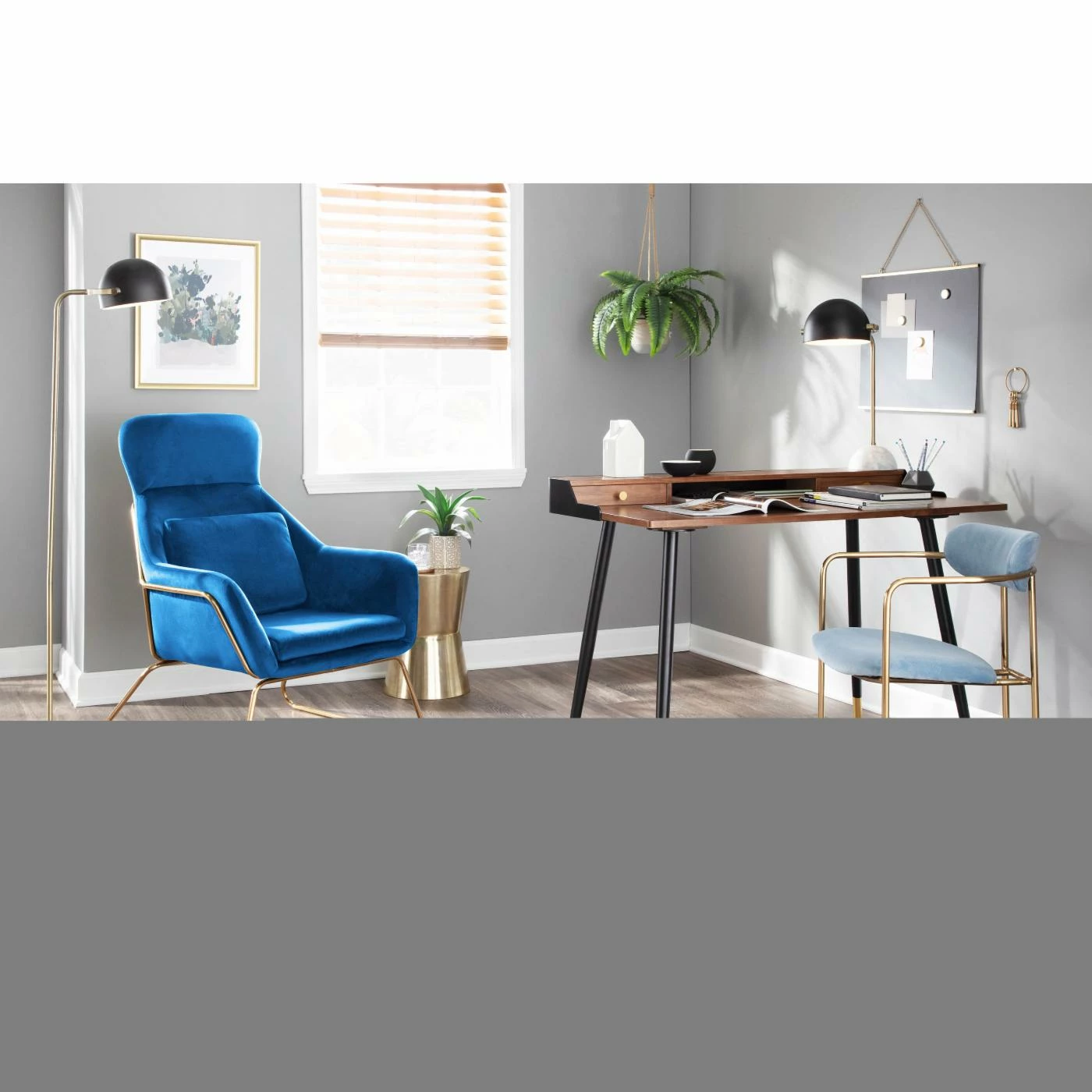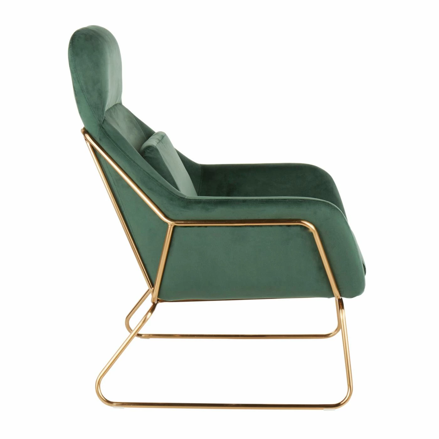 Relax in luxe style with the LumiSource Penelope Contemporary Accent Chair in your modern or mid-century living room or home office. The arms, seat and back cushions, and high back are all covered in lush velvet upholstery in your choice of available color. The wide, sleigh-style base and frame are metal with a slight recline and bright gold finish for added glam aesthetic.
