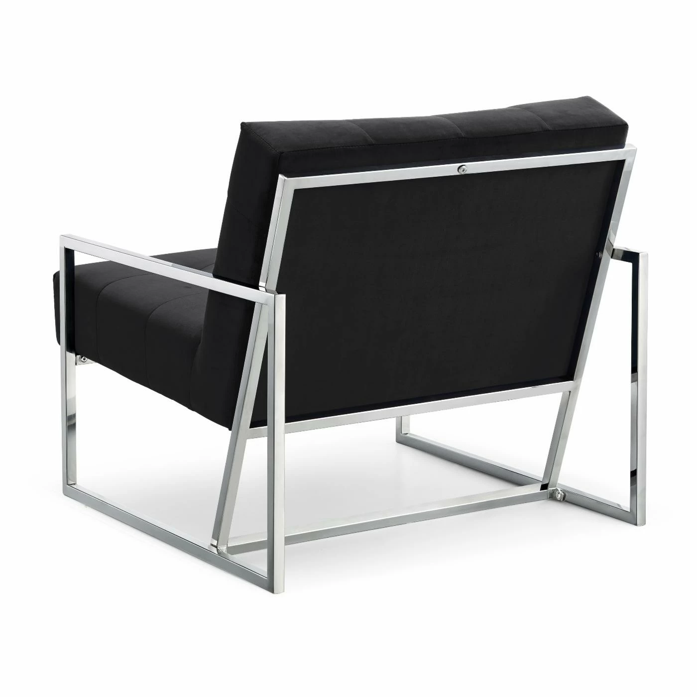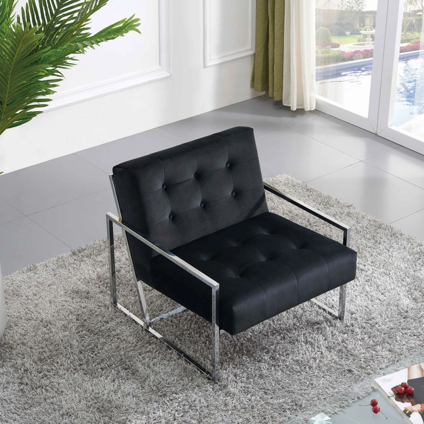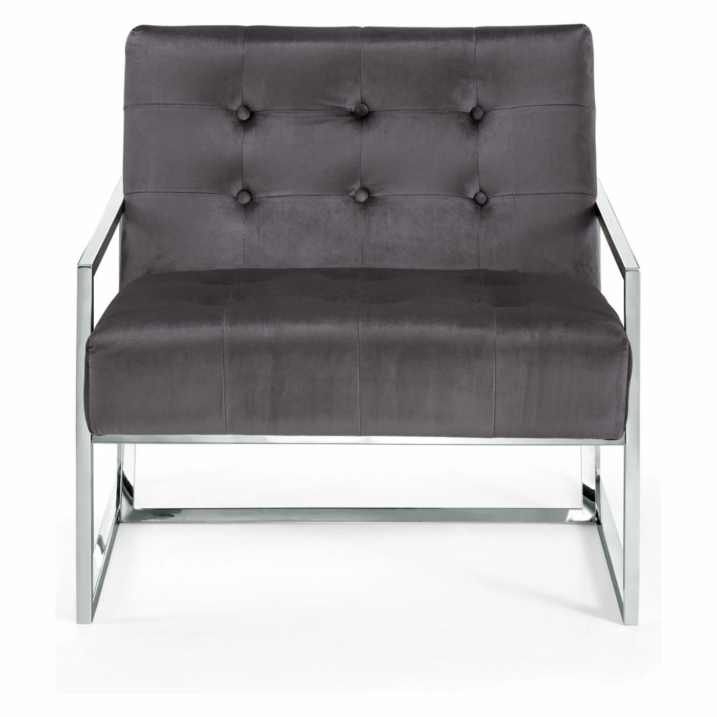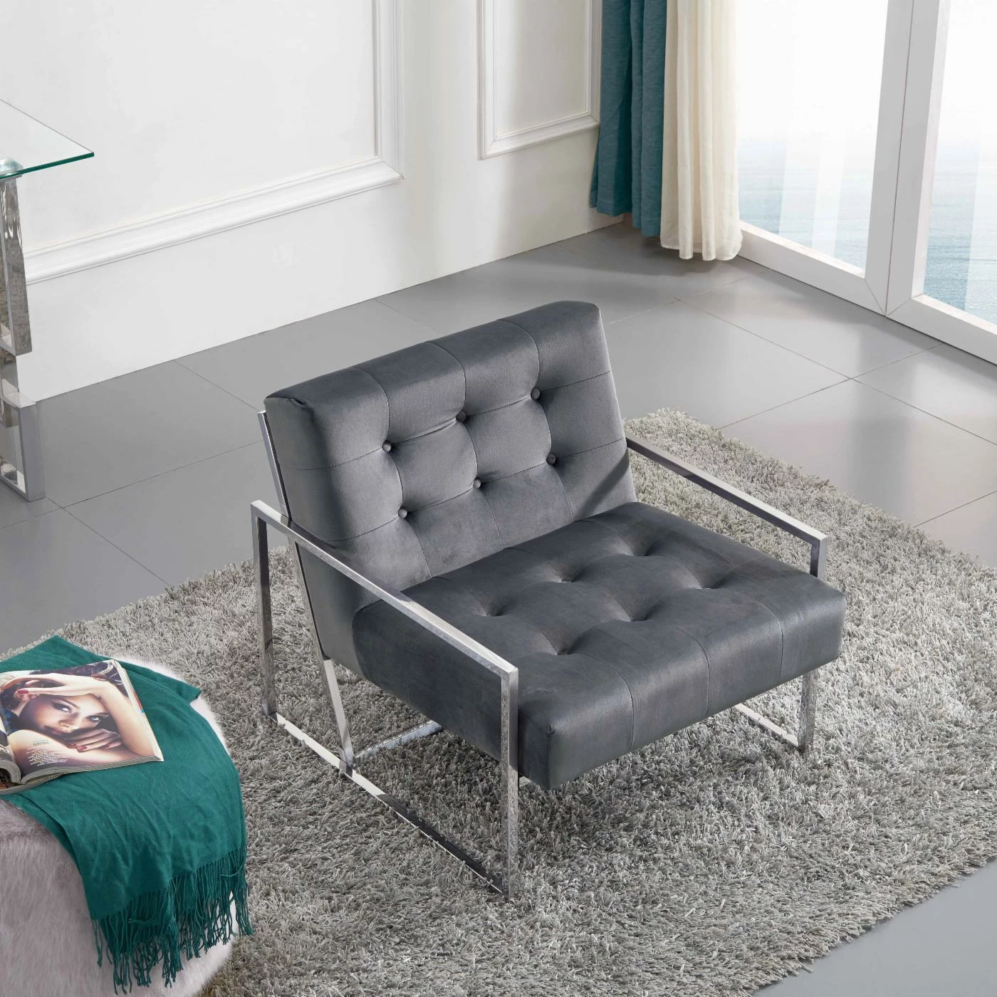 Give your home a decidedly modern air with the Meridian Furniture Inc Alexis Accent Chair. Great for reading, watching TV, and spending time with friends, this chair features thick foam cushions and soft, velvet upholstery to create the perfect place to relax. Stainless steel legs and arms are finished in a sleek chrome and the seat and back feature button tufting to add a retro flair youโll love. With your choice of available fabric colors, youโll have no trouble matching your existing style.