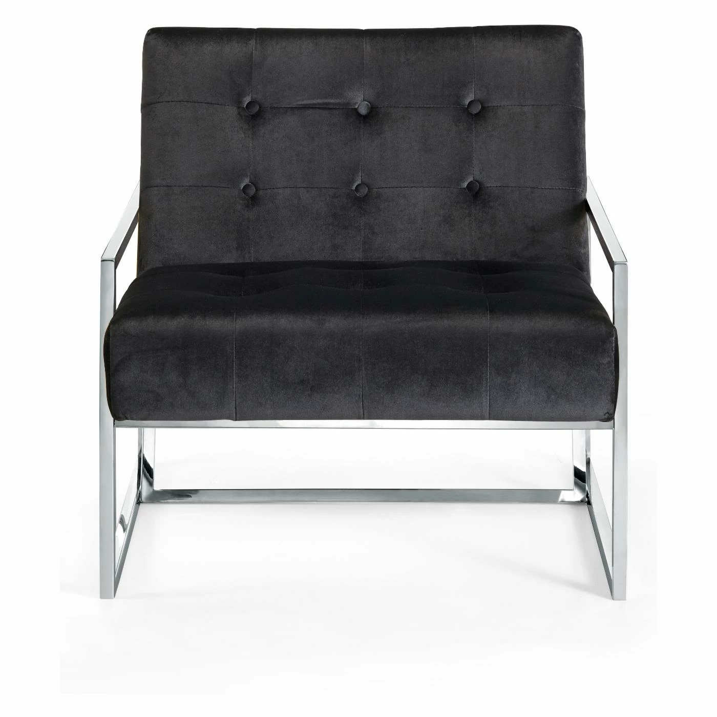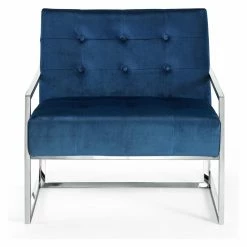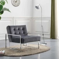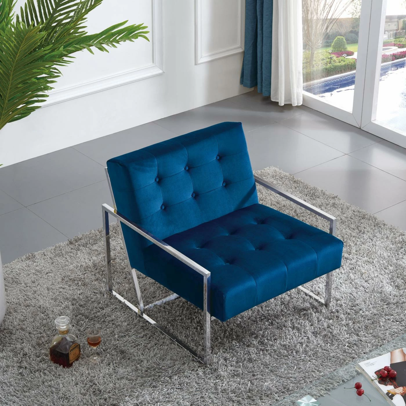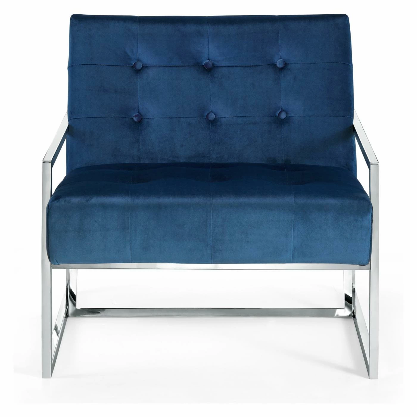 Give your home a decidedly modern air with the Meridian Furniture Inc Alexis Accent Chair. Great for reading, watching TV, and spending time with friends, this chair features thick foam cushions and soft, velvet upholstery to create the perfect place to relax. Stainless steel legs and arms are finished in a sleek chrome and the seat and back feature button tufting to add a retro flair youโll love. With your choice of available fabric colors, youโll have no trouble matching your existing style.