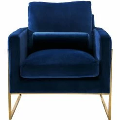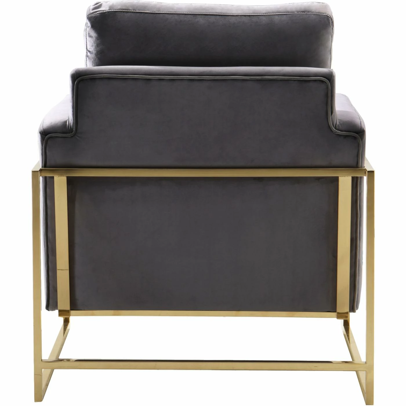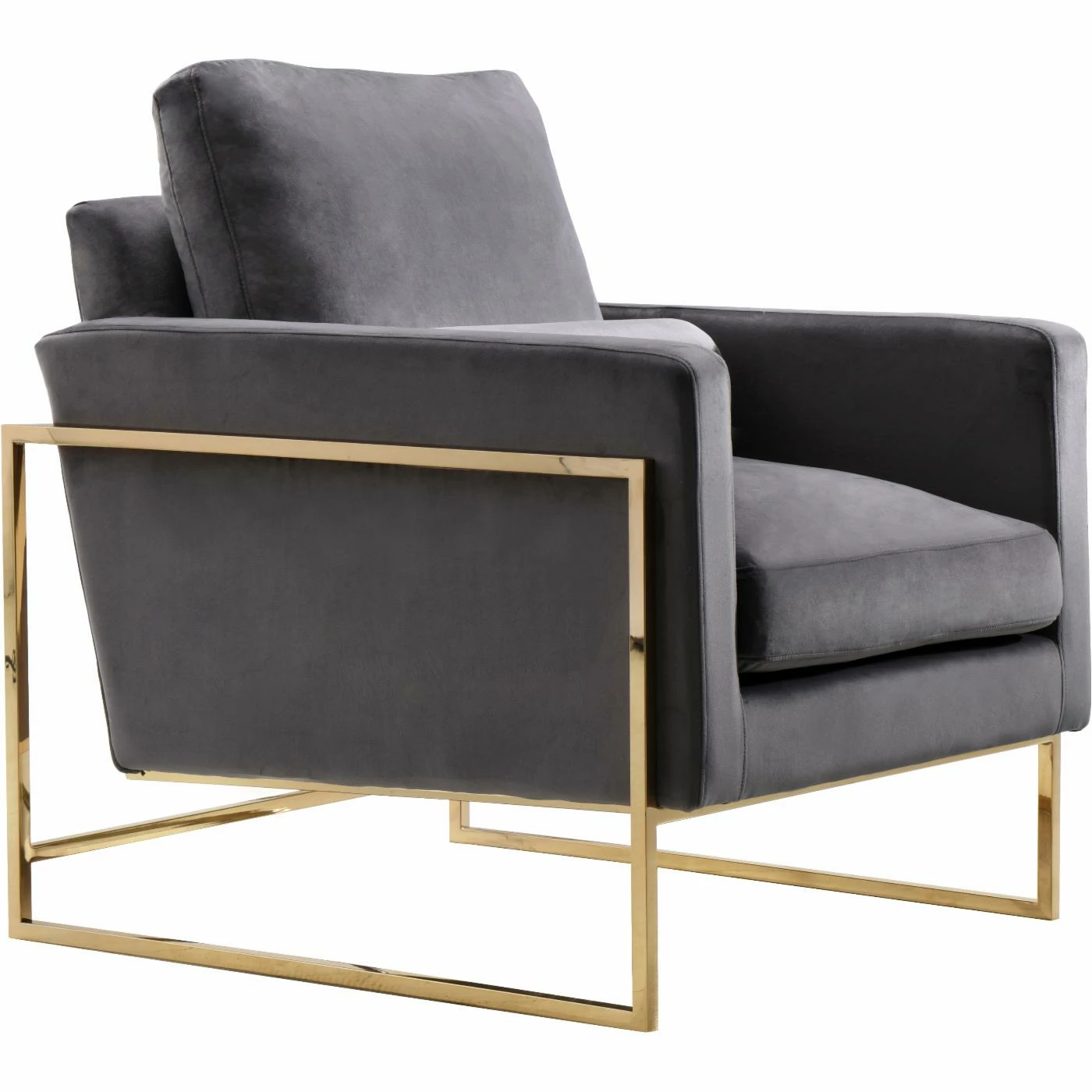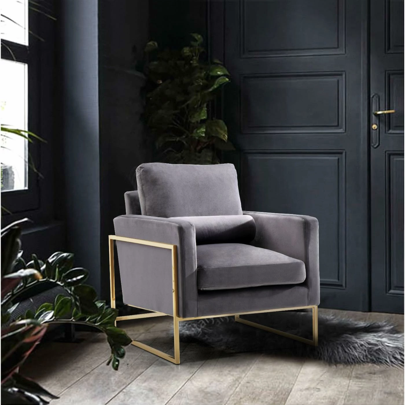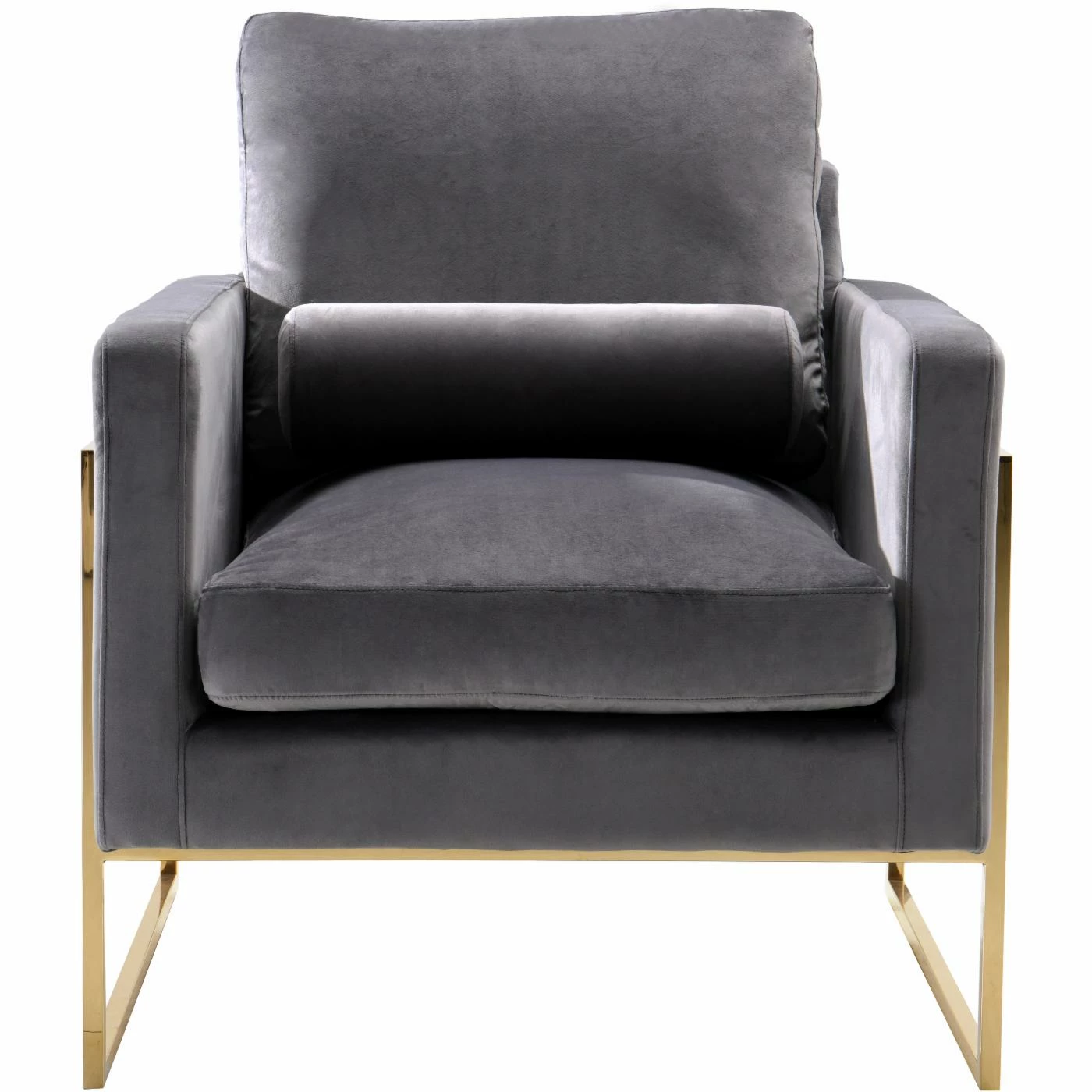 If you’re looking for a glam take on mid-mod furniture, take a glance at the Meridian Furniture Inc Mila Upholstered Arm Chair. Its open sled style stainless steel frame is finished in rich polished gold. Plush cushions and a rolled accent pillow add elegant finishing touches to this arm chair. Delight in its velvet upholstery, which is offered in your choice of available colors.
