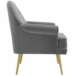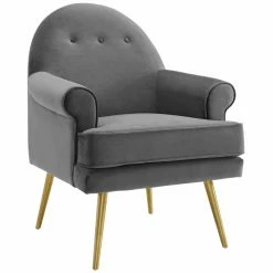 Take a relaxing seat on the Modway Revive Tufted Button Accent Performance Velvet Arm Chair and sit for hours diving into a world with your favorite characters. Three buttons sit in the middle of the demilune back for a subtle yet elegant design detail. The seat of this arm chair is foam padded for comfort. The solid wood and plywood frame is covered with stain-resistant velvet polyester upholstery in your choice of available color. Gold stainless steel, tapered legs and rolled arms add subtle elegant detail to the design of this arm chair.