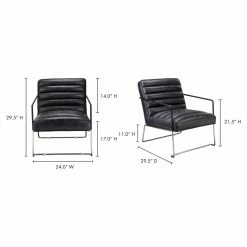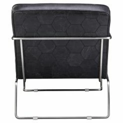 The modern industrial Moes Home Collection Desmond Arm Chair sports top grain black leather and unique horizontal tufting. Its polished stainless steel sled base becomes leather-wrapped arms. The back of this arm chair has a handsome hexagonal pattern.