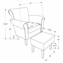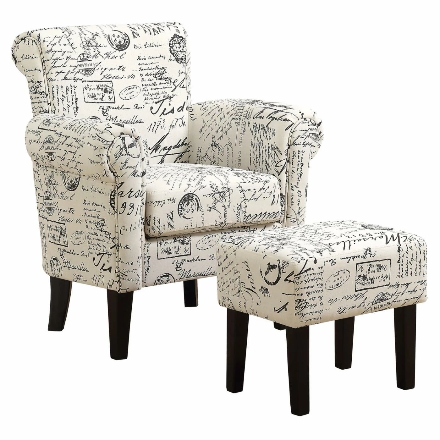 Infuse your cozy lounging with sophistication when you do it in the Monarch Specialties Vintage French Accent Chair and Ottoman. Perfect for rainy days, home-brewed coffee, and binge-watching your favorite show, this set is graced with ivory fabric covered in handwritten French sentiments and postmarks. Any corner of your home instantly feels well-traveled and intriguing. Rolled armrests are amply padded, with a tight, scrolled back and a thick removable seat cushion. The matching ottoman offers a place to set your book or laptop or to stretch out your tired feet. Tapered legs are carefully crafted of wood and wear a black finish.