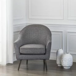 A mid-century silhouette dressed to impress in menswear-inspired century gray fabric makes the New Pacific Direct Inc Duncan Upholstered Accent Chair a dapper addition to your living room or den. To enhance its 60’s vibe, this accent chair sits on wood dowel legs in a rustic cement gray finish. Try it in a pair with a glam accent table.