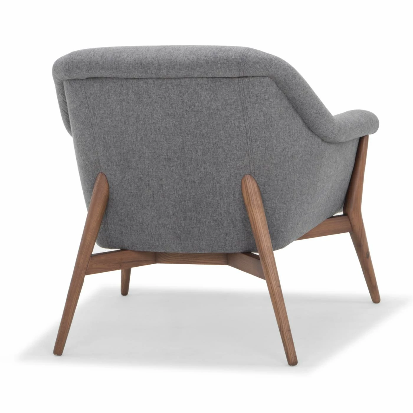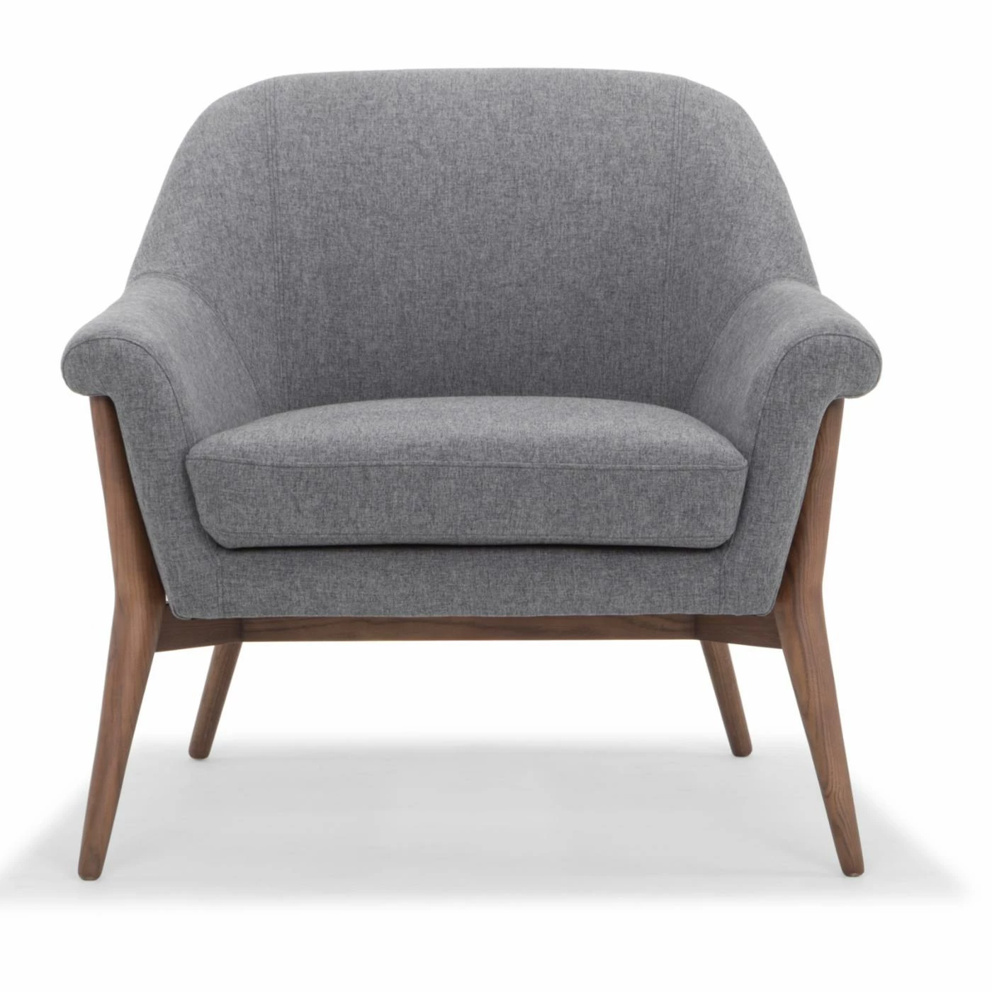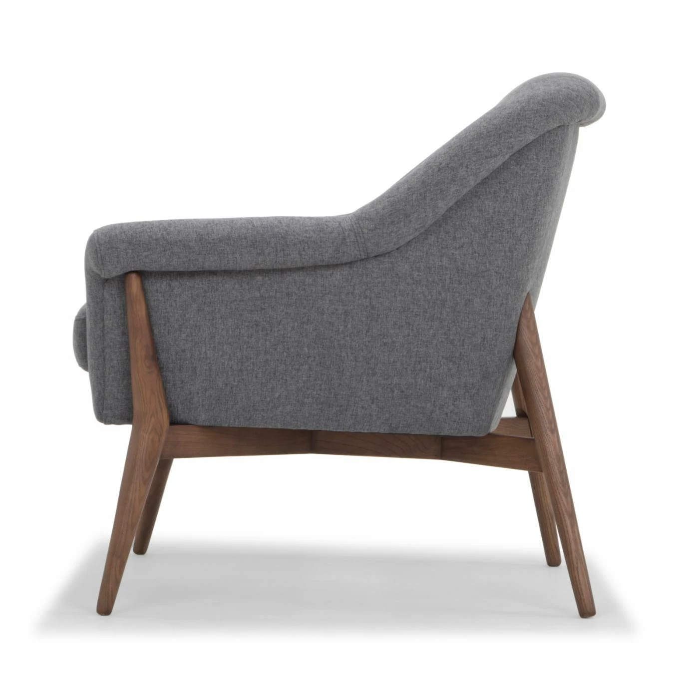 Flared, tapering wood post legs provide stylish support for the Nuevo Charlize Lounge Chair. This chic lounge chair has a mid-century look made luxurious by its generous seating. It’s upholstered in your choice of available fabric color. Design details include the dramatic framework and rolled arms.