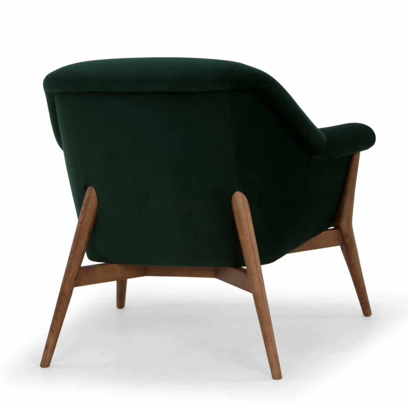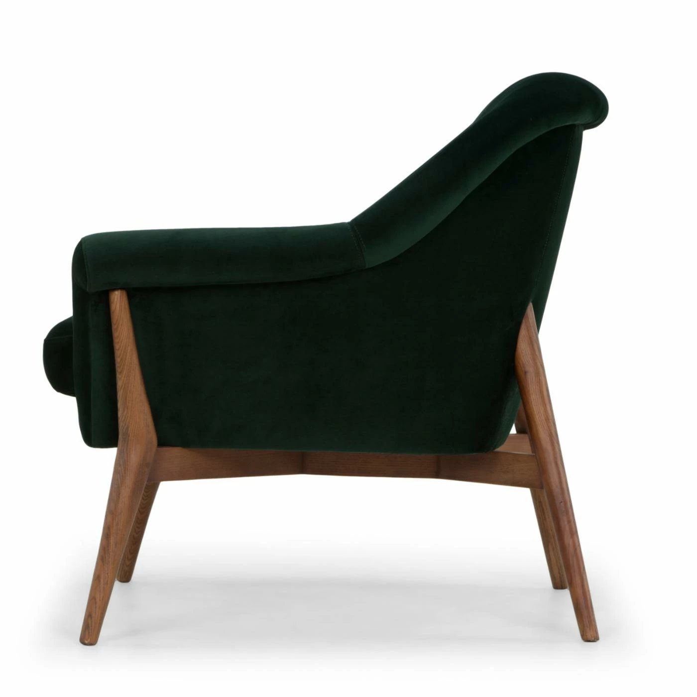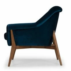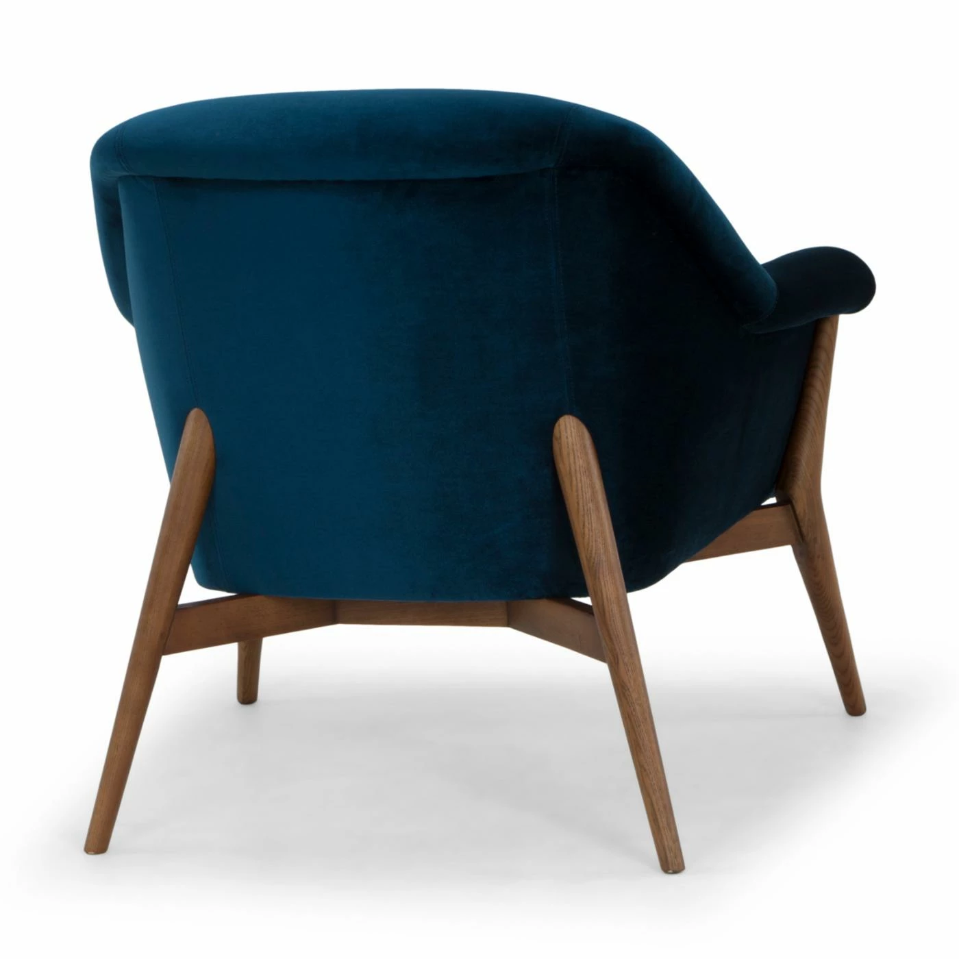 Flared, tapering wood post legs provide stylish support for the Nuevo Charlize Lounge Chair. This chic lounge chair has a mid-century look made luxurious by its generous seating. It’s upholstered in your choice of available fabric color. Design details include the dramatic framework and rolled arms.