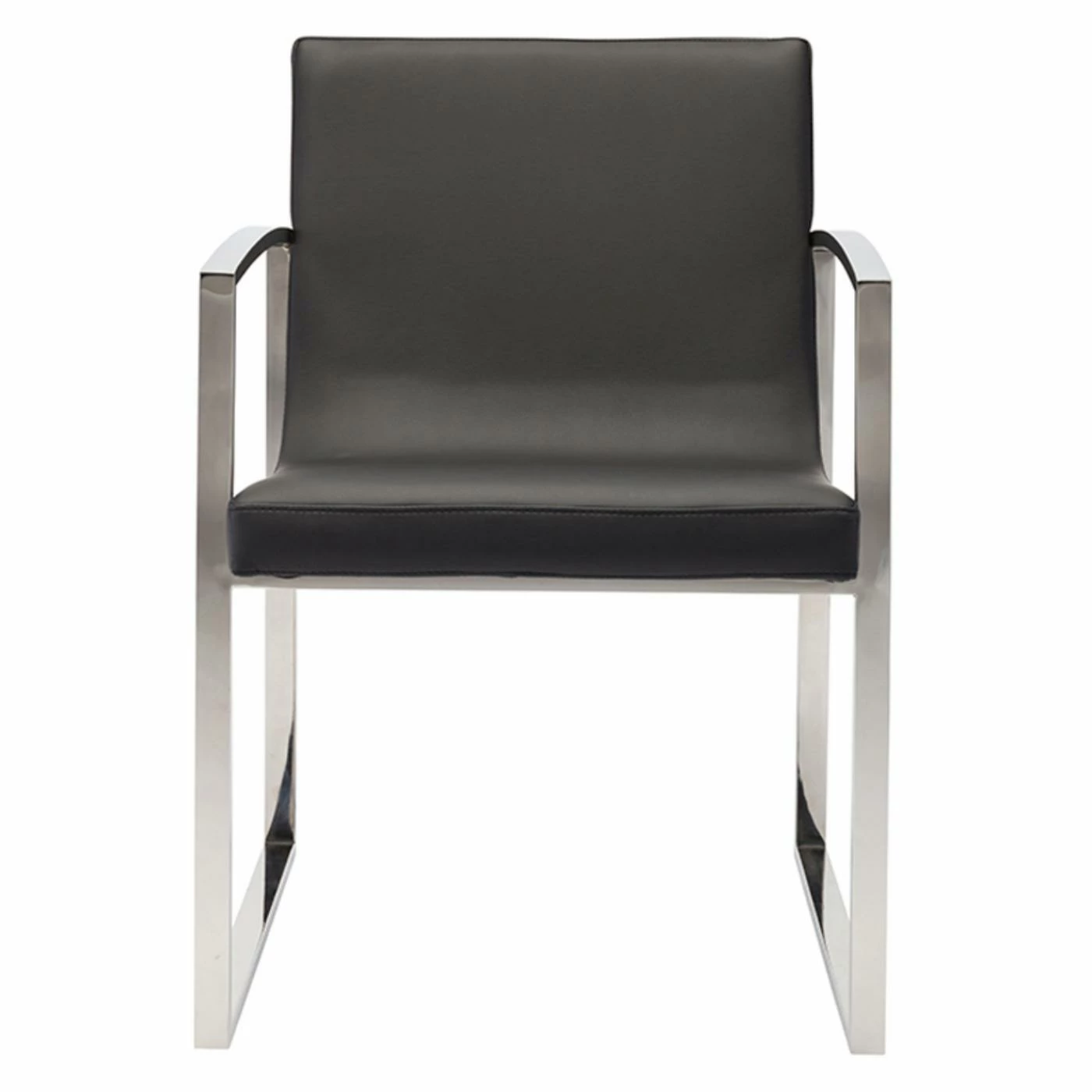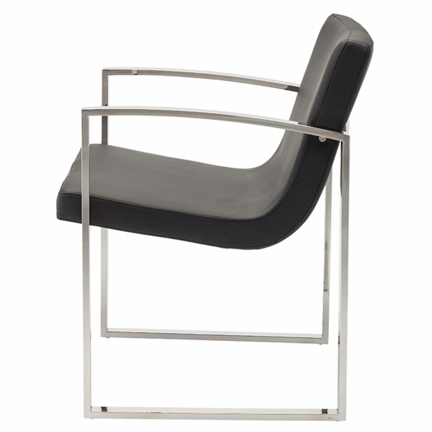 The sleek silhouette of the Nuevo Clara Accent Chair introduces a comfortable modern design element. The accent chair features a curved, one-piece seat and back rest upholstered in your choice of available faux leather colors. Chromed stainless steel sled style legs are polished to a high shine.