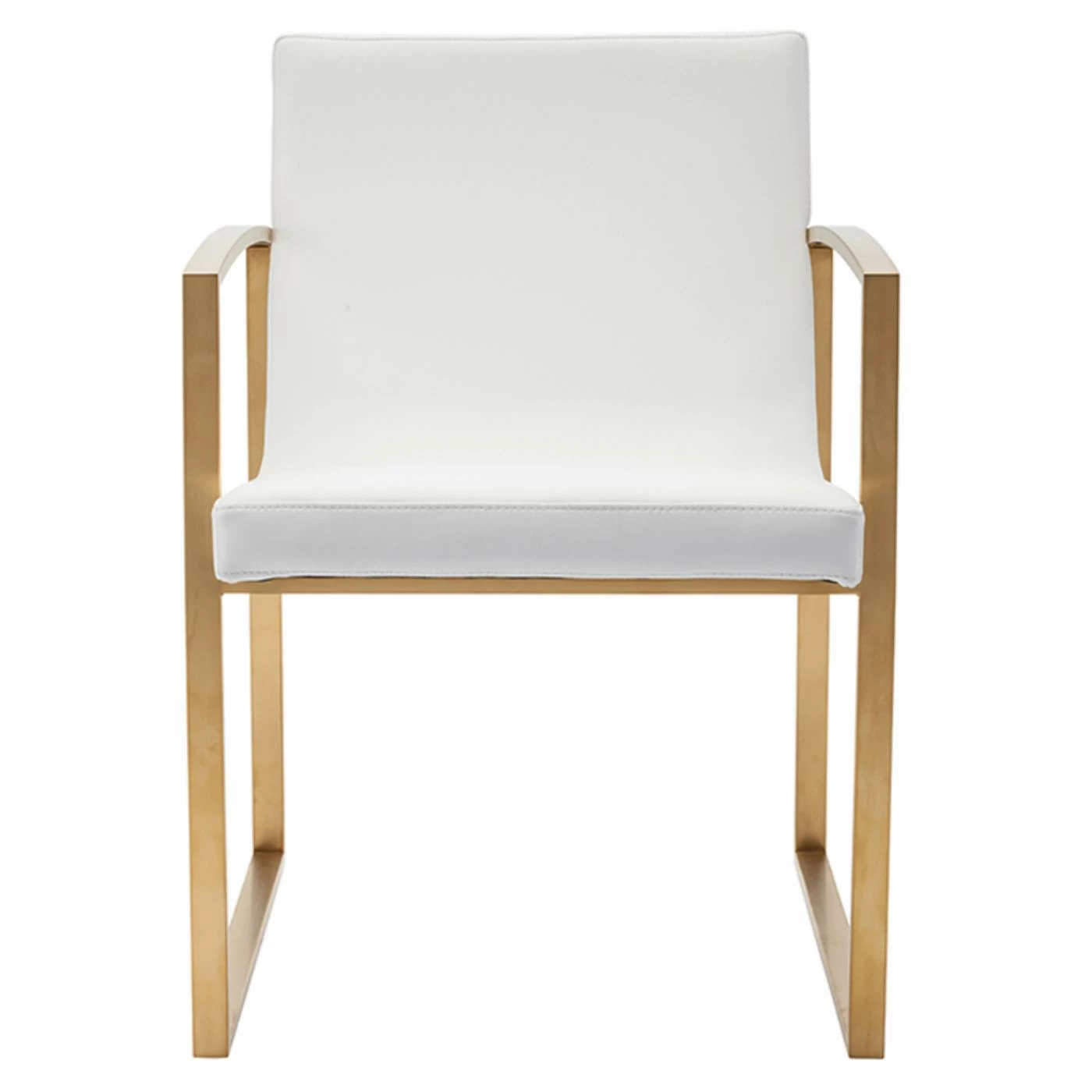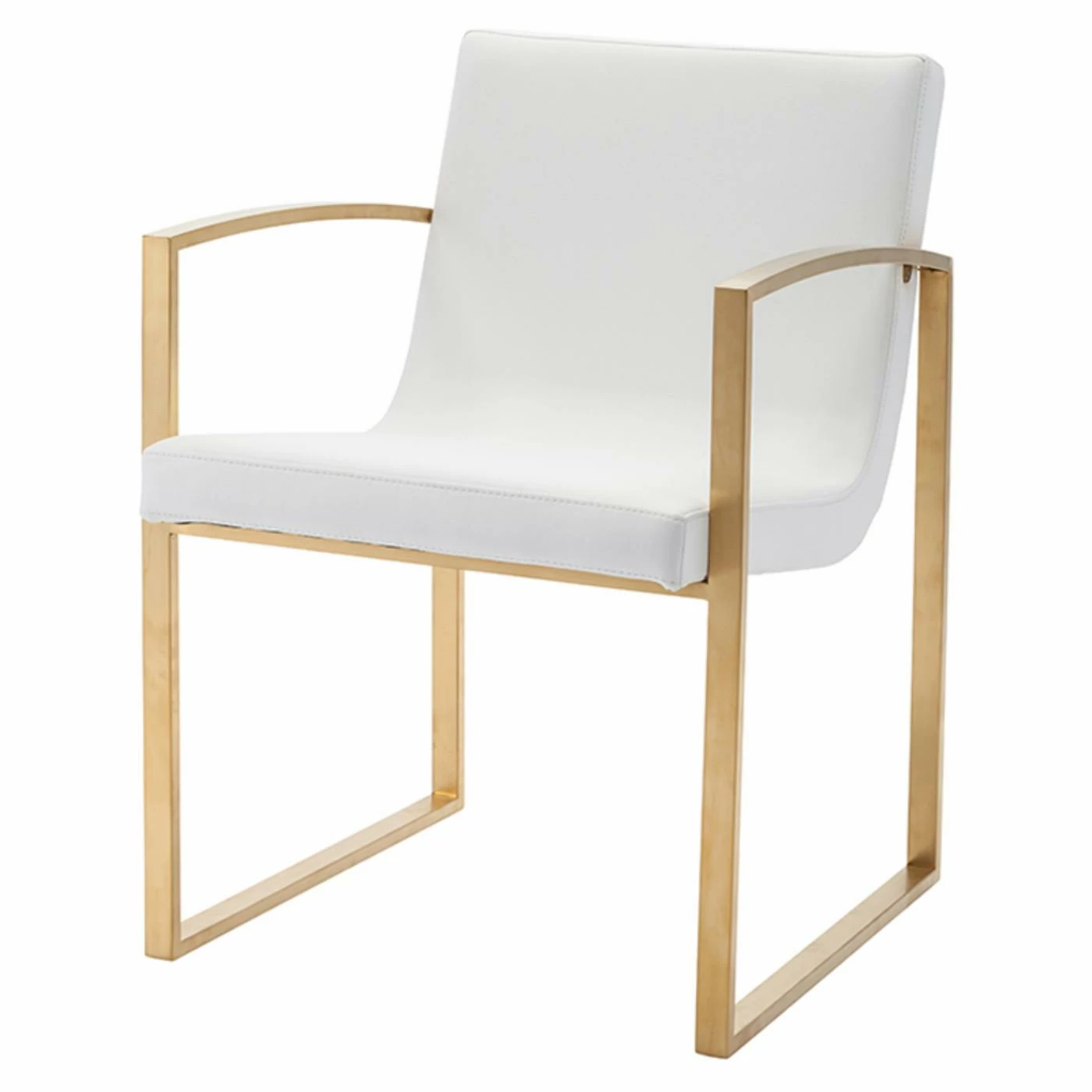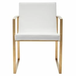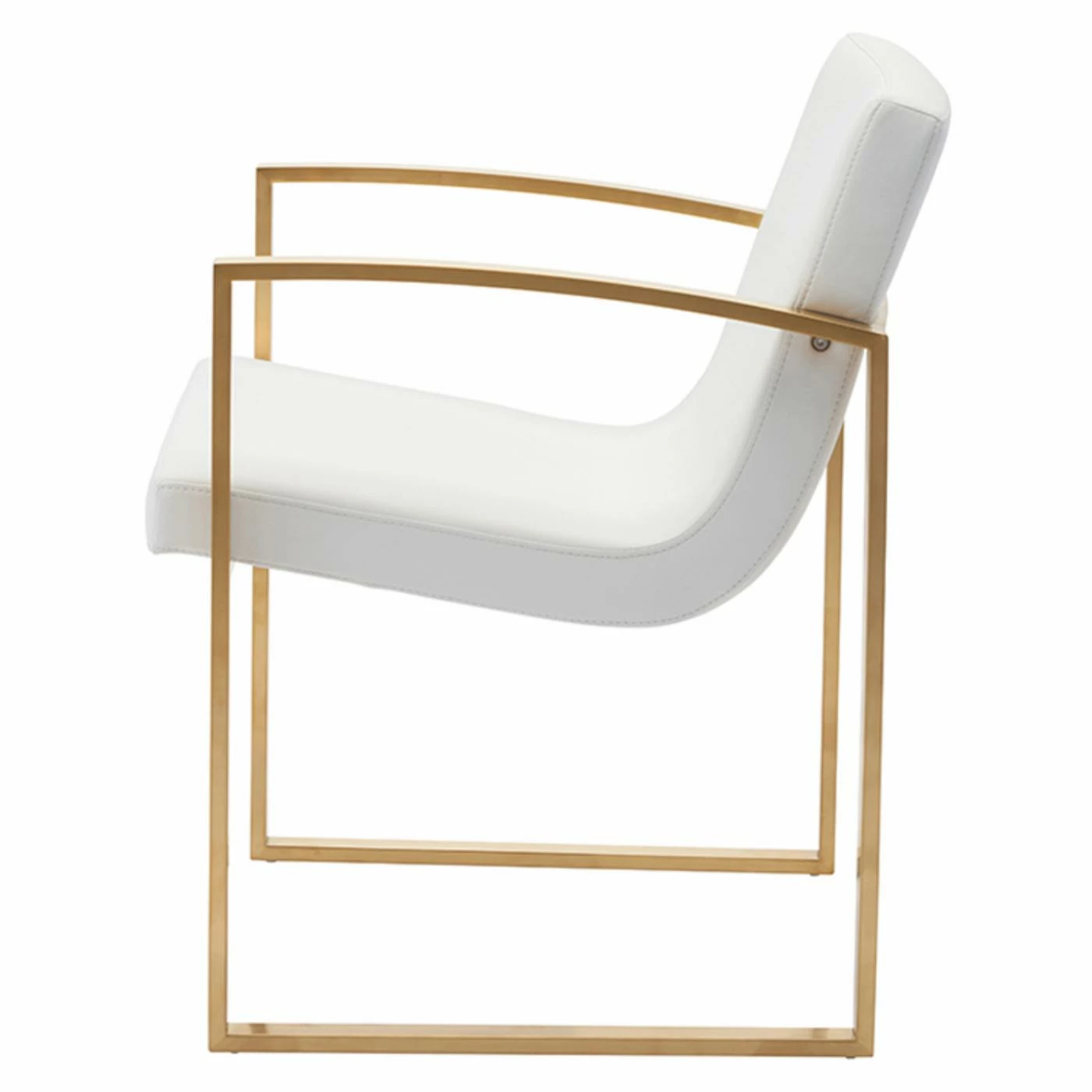 Glamorous gold-finished legs and a sleek silhouette make the Nuevo Clara Gold Accent Chair a modern luxury. This chic accent chair has a curved, one-piece seat and back rest upholstered in your choice of available faux leather colors. Stainless steel sled style legs get a luxe treatment from the brushed gold finish.