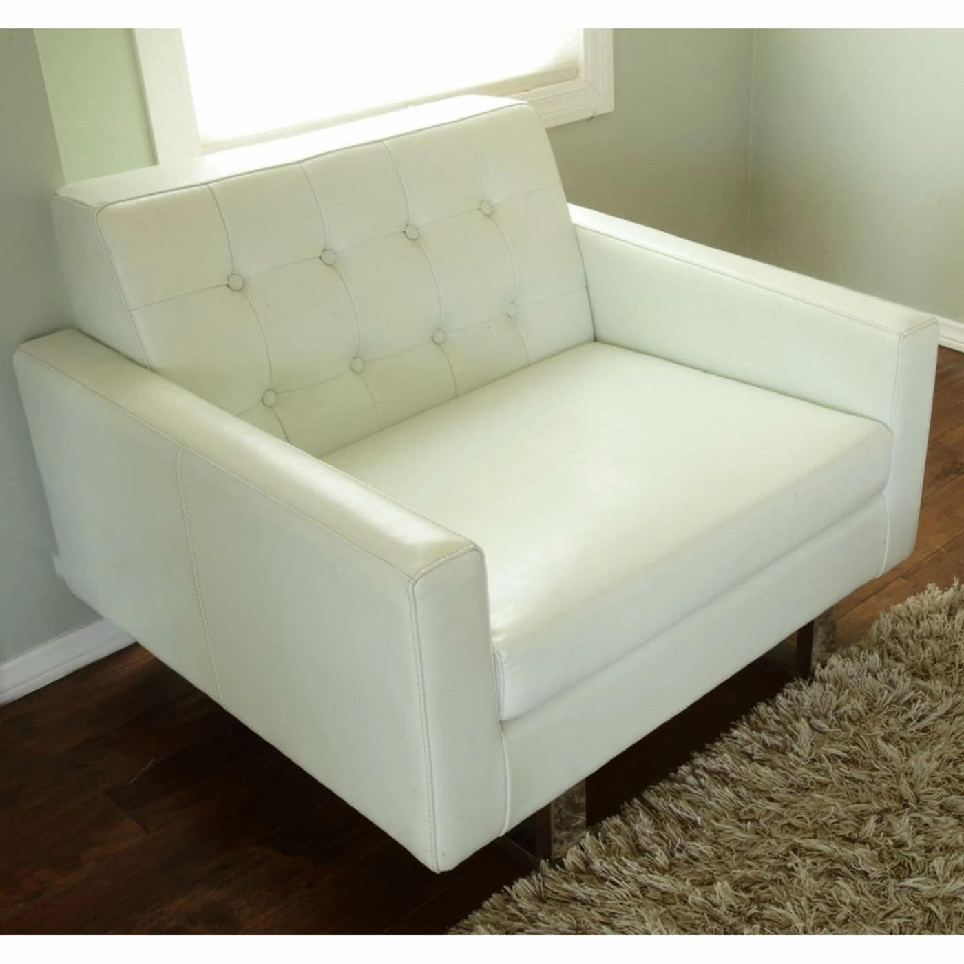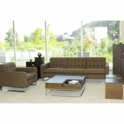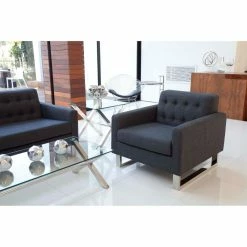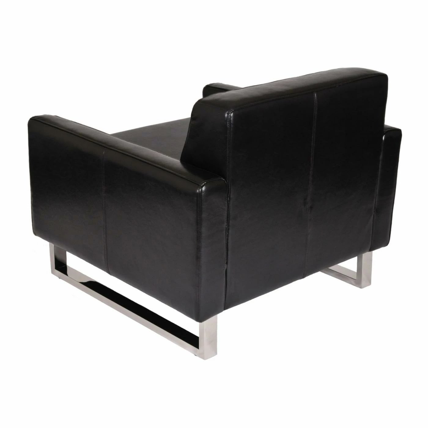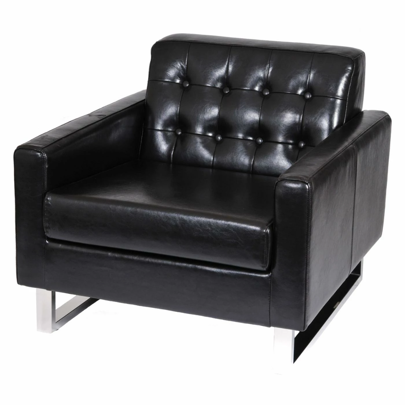 Deep and wide, the Pangea Home Nolan Sofa Chair – Faux Leather lets you settle in and relax in modern style. This boxy club chair features low track arms, a button tufted back cushion and a sleek, smooth seat, all upholstered in your choice of available faux leather or fabric options. Gleaming stainless steel feet elevate and support the chair.