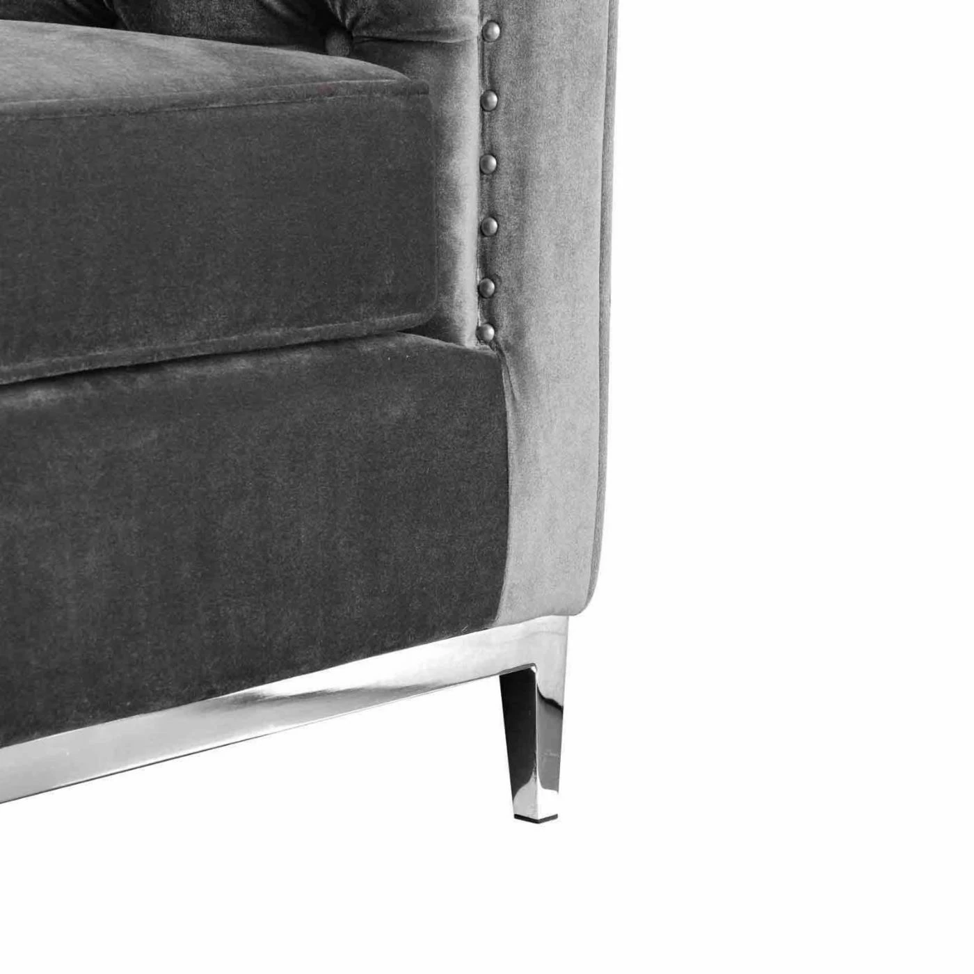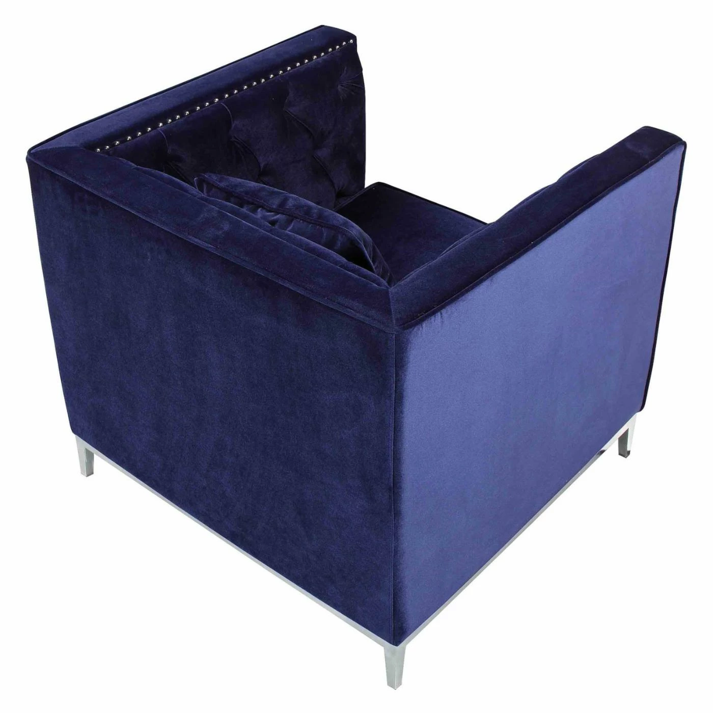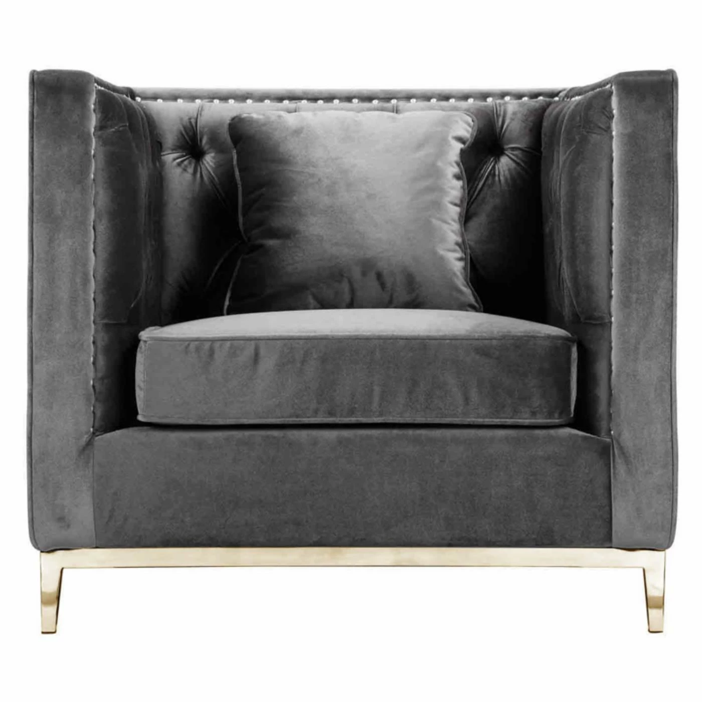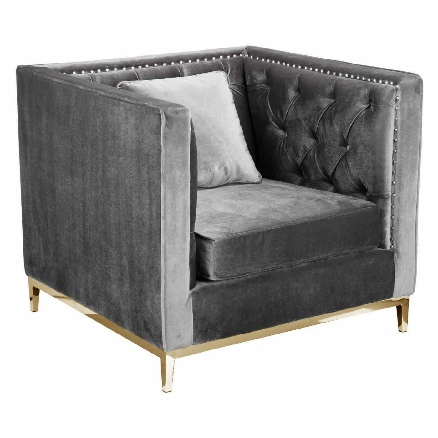 The Pangea Home Vivienne Sofa Chair offers a classic tuxedo chair silhouette with soft, sensuous velvet upholstery. Nail head trim outlines the inner arms and runs along the clean edge of the backrest. A shimmering metal base provides support and shine.