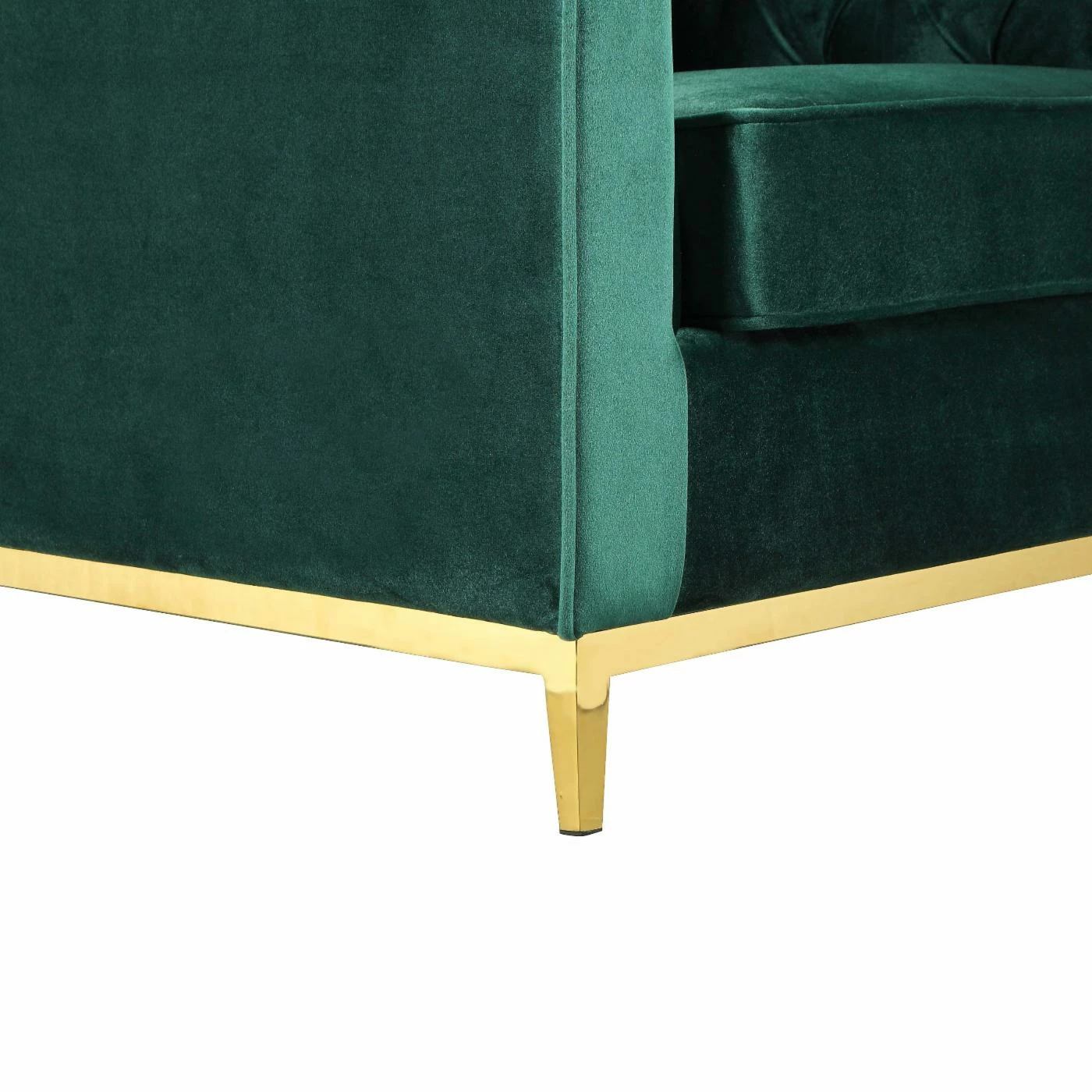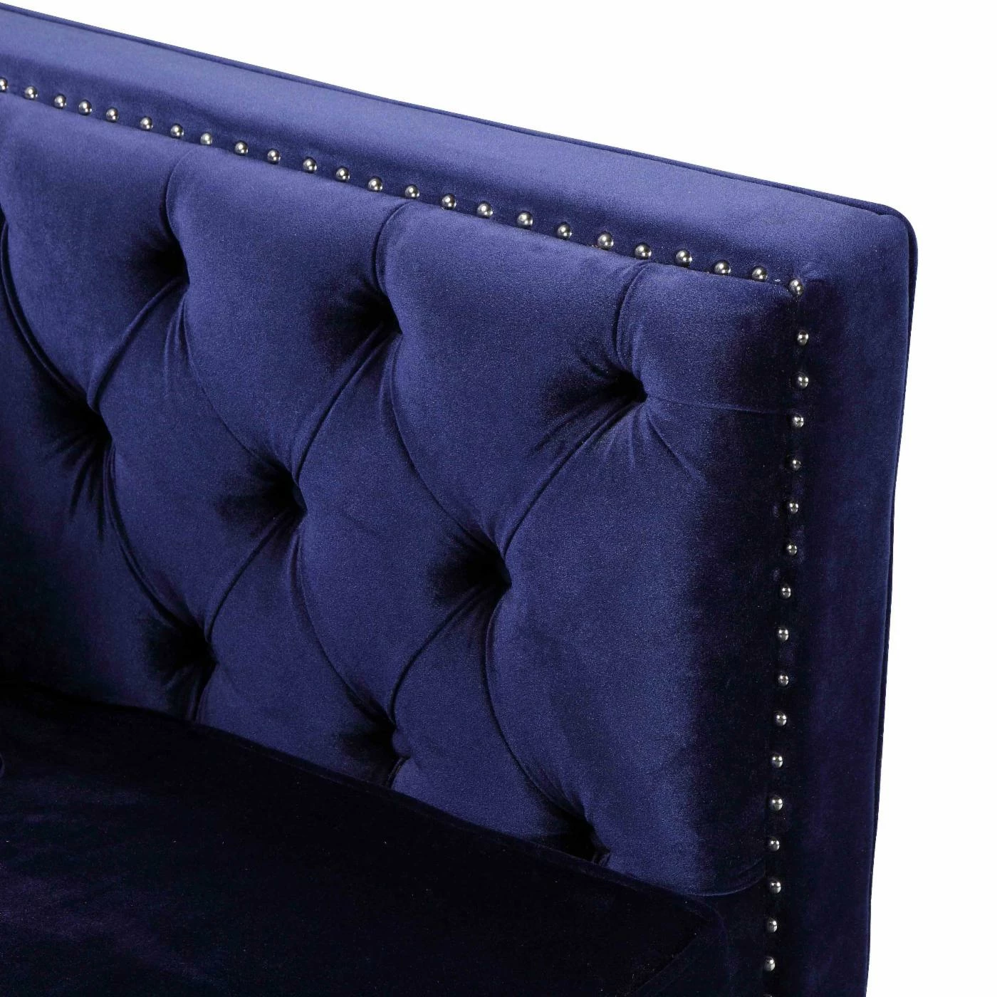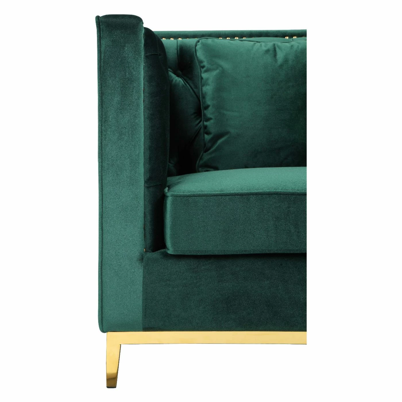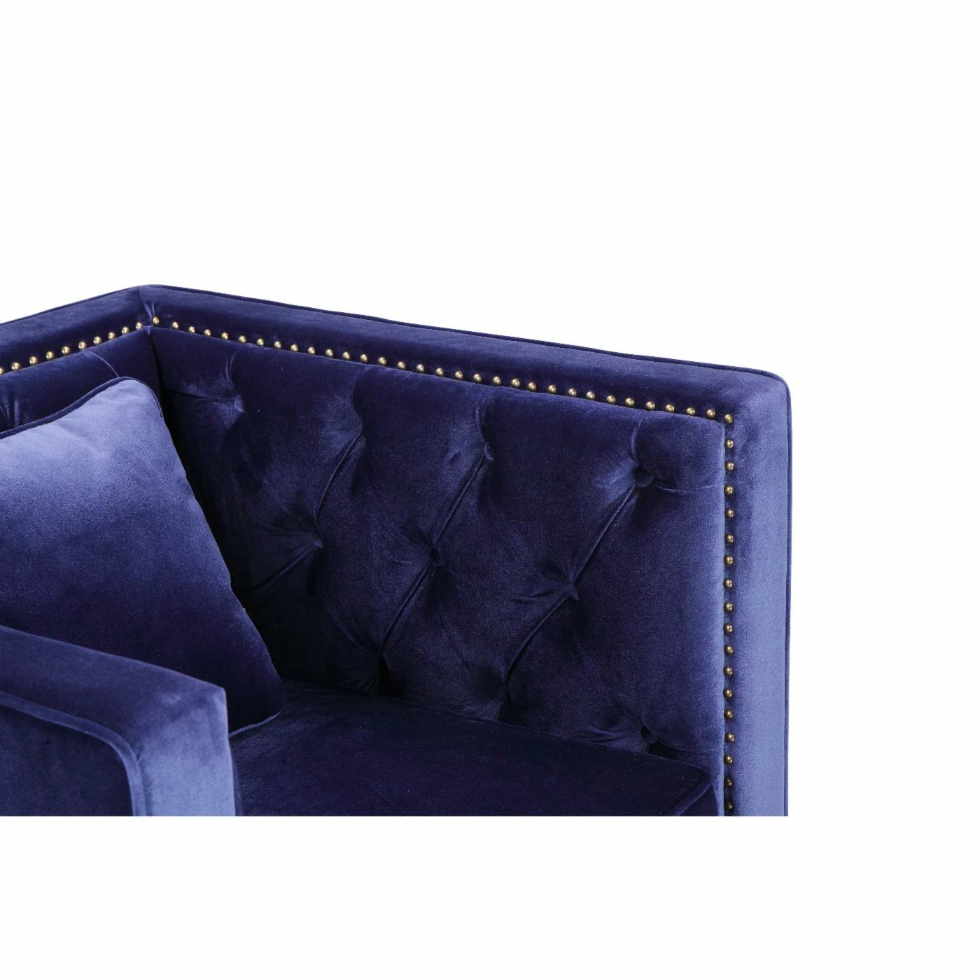 The Pangea Home Vivienne Sofa Chair offers a classic tuxedo chair silhouette with soft, sensuous velvet upholstery. Nail head trim outlines the inner arms and runs along the clean edge of the backrest. A shimmering metal base provides support and shine.