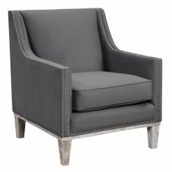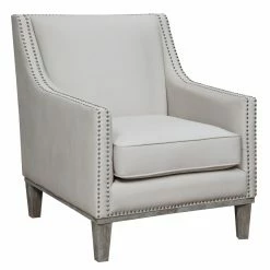 The Picket House Furnishings Aster Accent Chair offers your living space sleek design with a touch of textural contrast. The frame is made from sturdy and reliable pine and plywood. Foam upholstery with S-springs and coil springs give your body the best comfort and support. Choose from available fabrics to match your living room decor. The distressed legs and nail head trim give the chair added dimension and texture. The transitional look of the accent chair makes it work in a variety of decorative styles.
