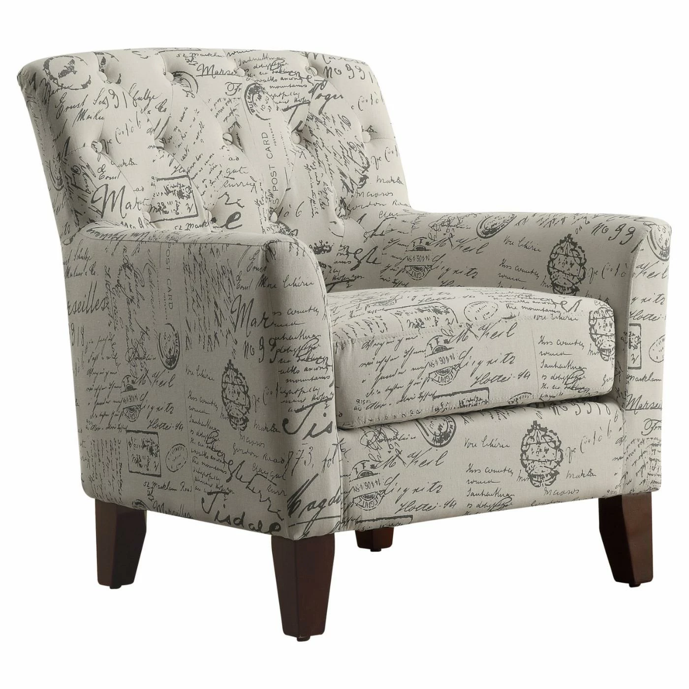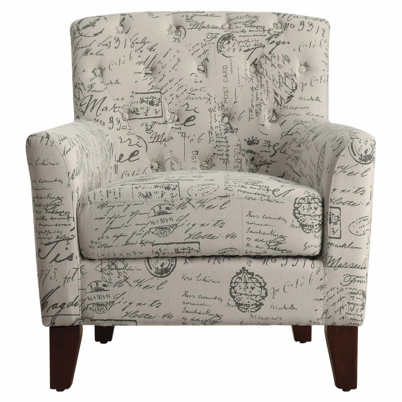 Postcard-inspired script on linen upholstery adds an elegant, worldly touch to the Rosevera Paula Script Armchair. This armchair is a tasteful mix of modern and more traditional elements. Diamond button tufting and slant arms and back add a little more classic appeal, while the square shape and tapered legs bring a contemporary feel. The dark espresso finish on the legs perfectly contrasts with the light beige of the fabric. Put this chair in a secluded corner or add as part of your main seating in your living room.