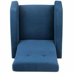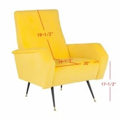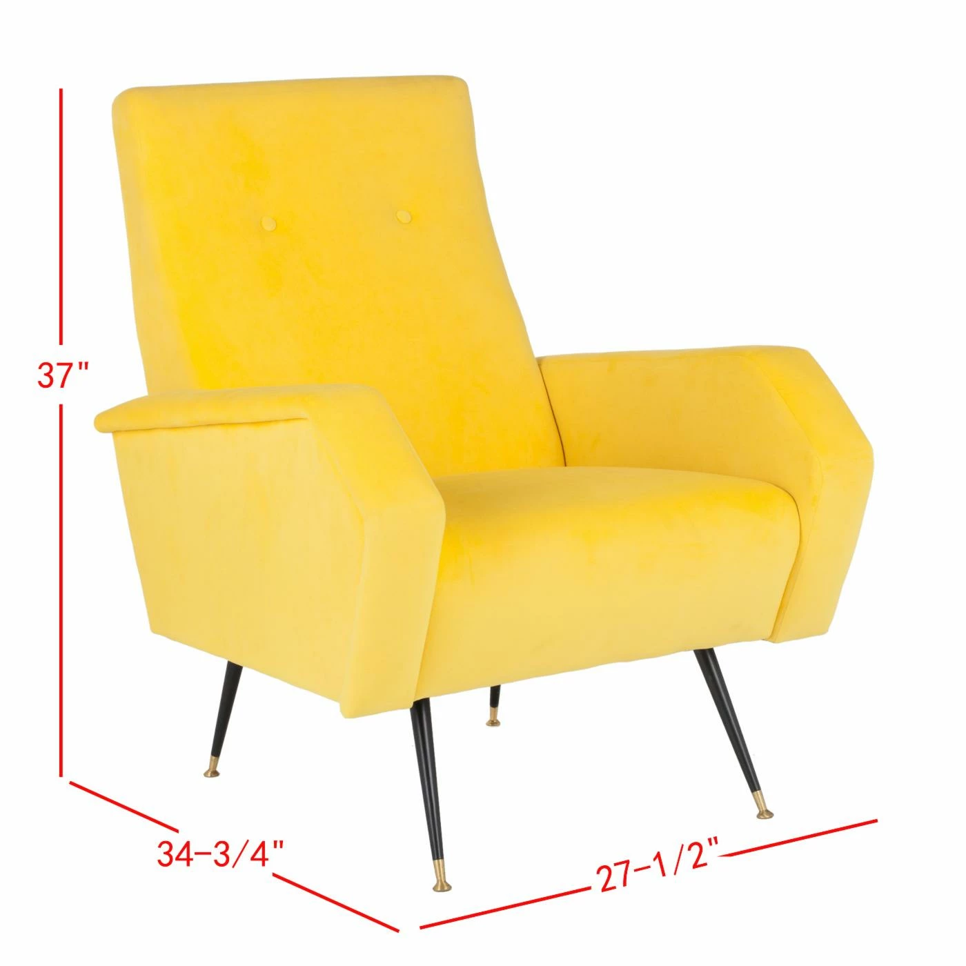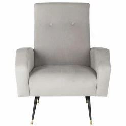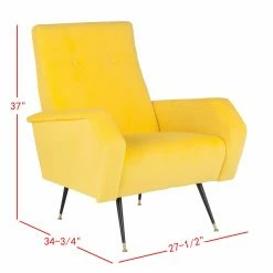 The Safavieh Aida Accent Chair evokes a sense of balance and composure. Mod geometry creates a streamlined feel. The 120-degree bends in the armrests add up to a half-hexagon. A touch of button tufting defines the sleek, ergonomically pleasing backrest. Black-finished metal legs are almost impossibly slender, with gold feet and ferrules.