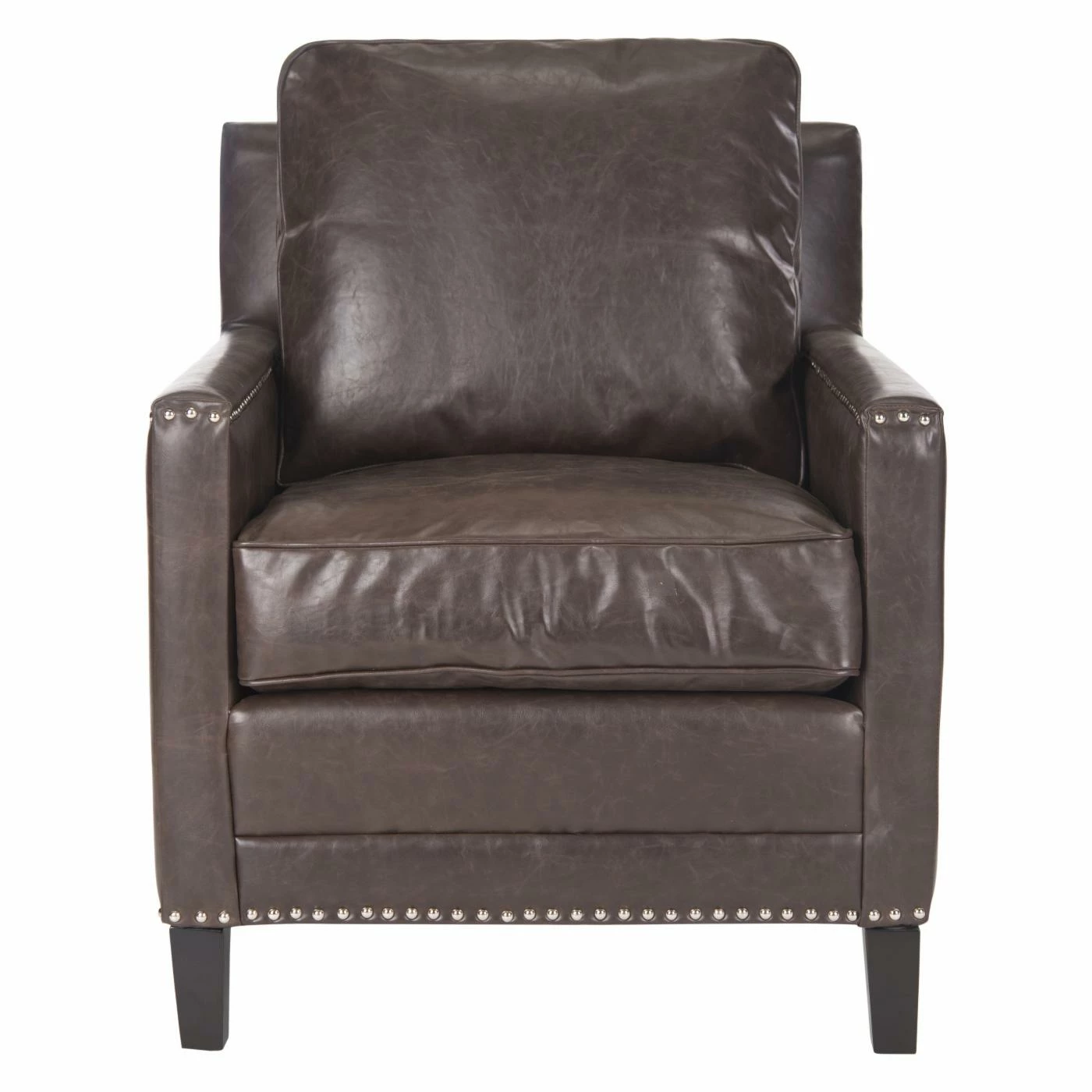 The Safavieh Buckler Leather Club Chair makes relaxing a luxurious experience thanks to the supple faux leather upholstery in a warm antique brown color. This comfortable club chair features thick cushions on the seat and back with silver nailhead trim around the armrest and base for a sophisticated look. The durable legs are constructed of birch wood and feature a deep espresso finish.