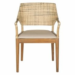 A sophisticated blend of neutrals are woven into the rattan back on the Safavieh Carlo Arm Chair. This decidedly upscale, yet casual, chair features a neutral upholstered seat cushion that makes it ideal for the dining room or living area. It sits on tapering, mahogany post legs in a honey finish.