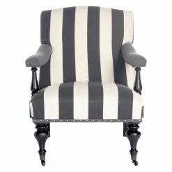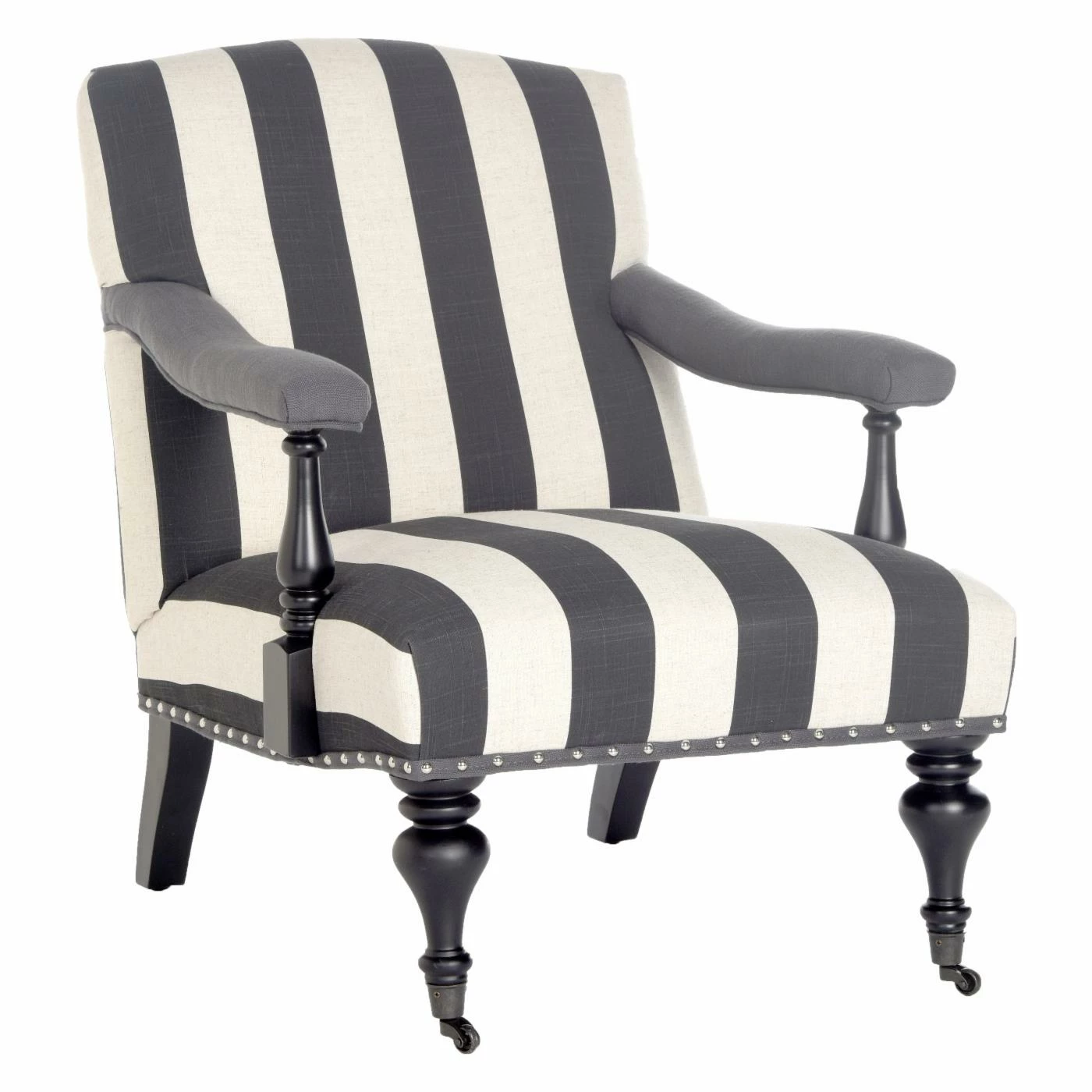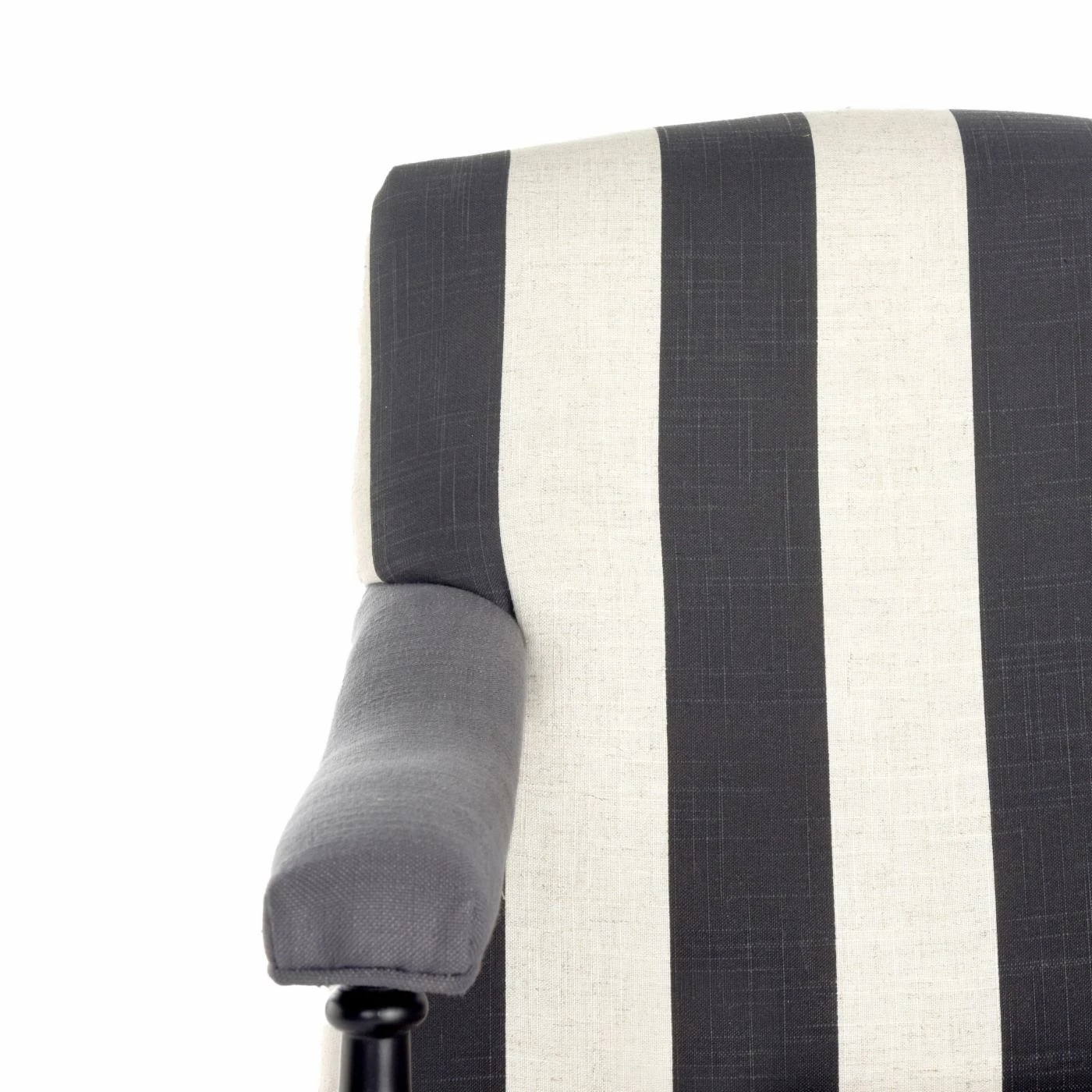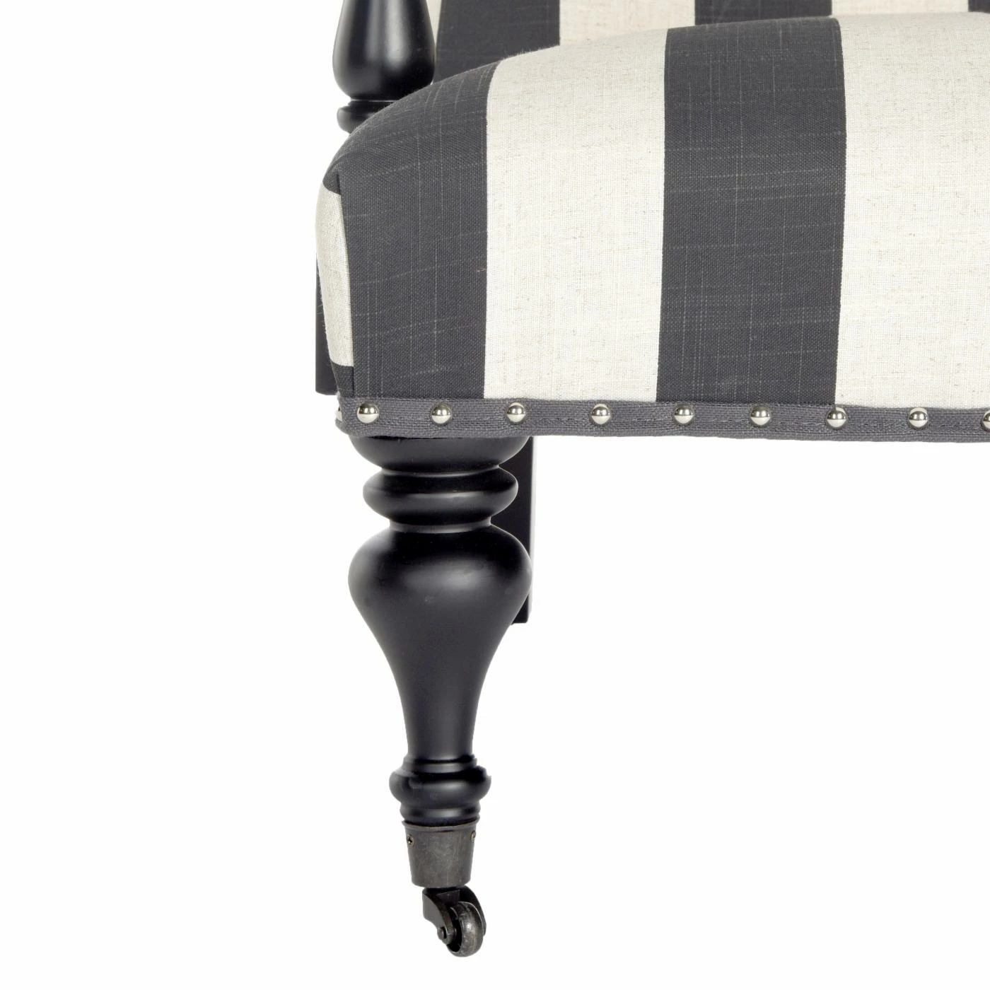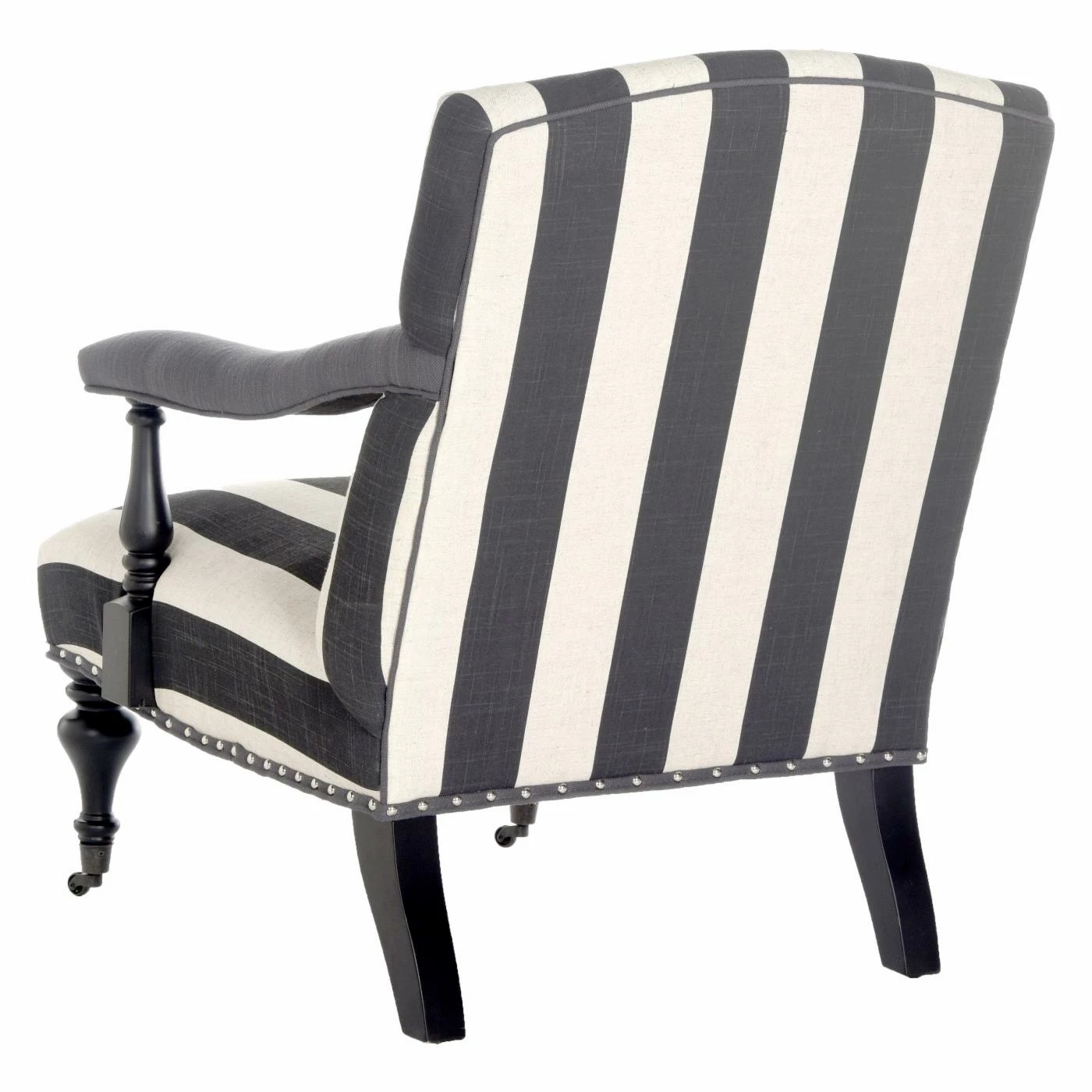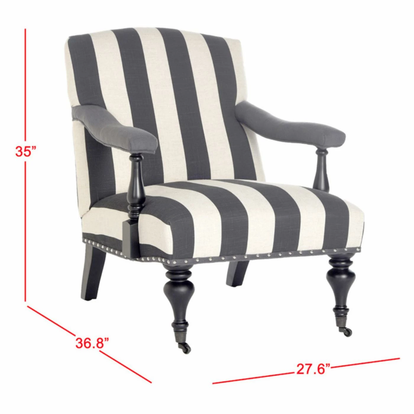 Wide charcoal and white stripes and spindle supports ensure the Safavieh Devona Awning Stripe Arm Chair with Silver Nail Heads will be your new living room centerpiece. Also striking in the boudoir or library, this arm chair is built for comfort and style. It features a tight back and seat as well as solid charcoal-upholstered arms. As a finishing touch, the chair sits on turned wood front legs that end in metal casters.
