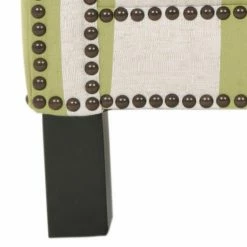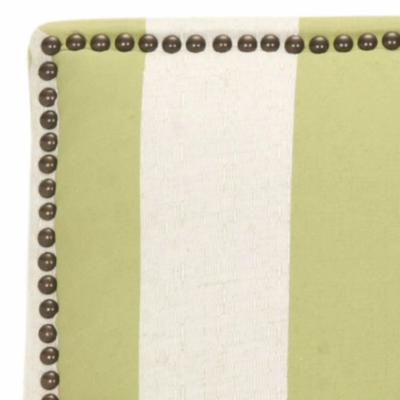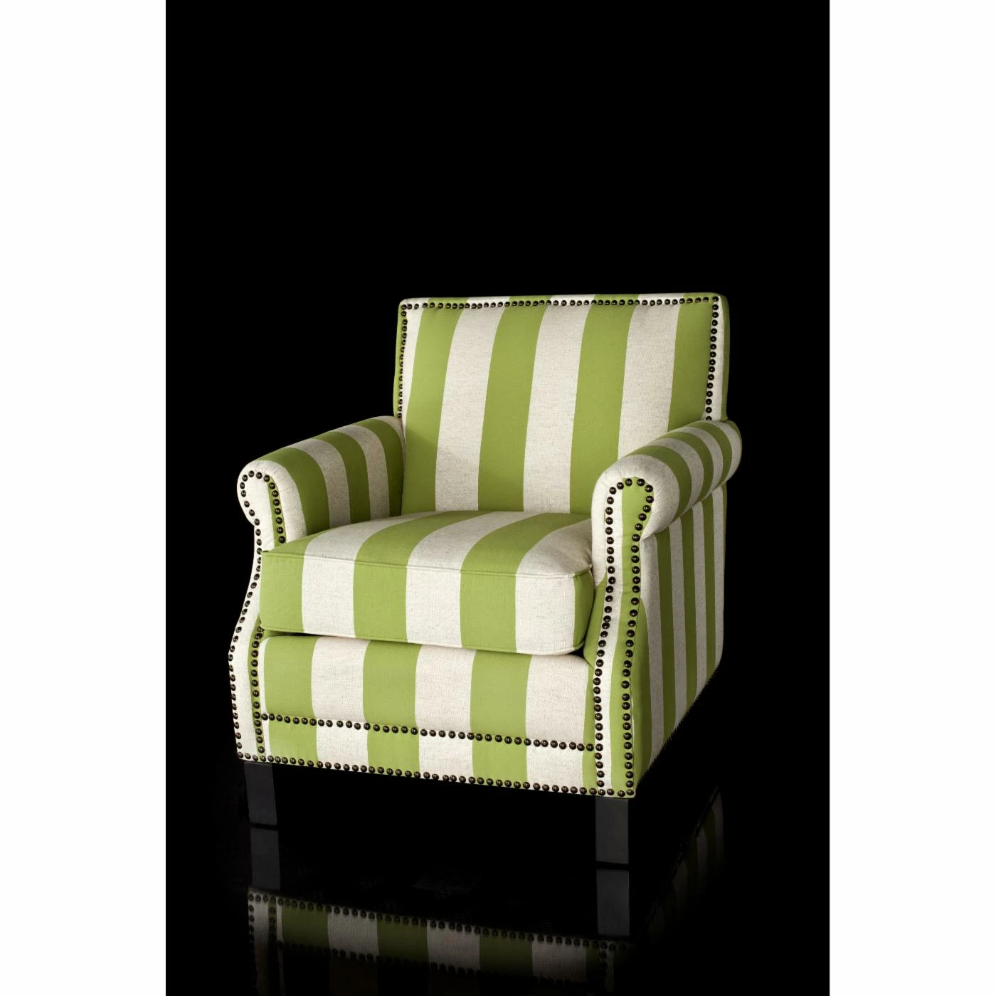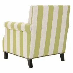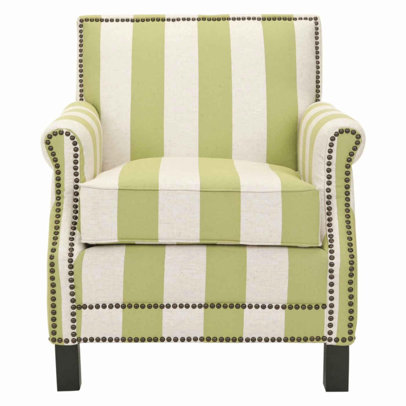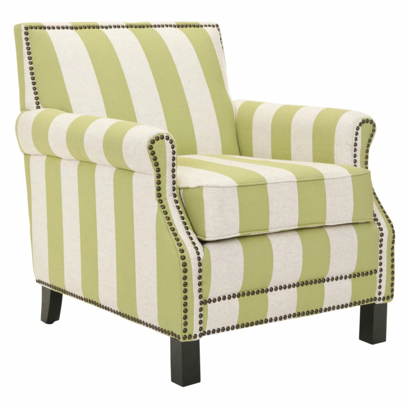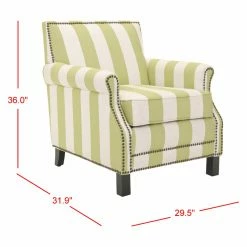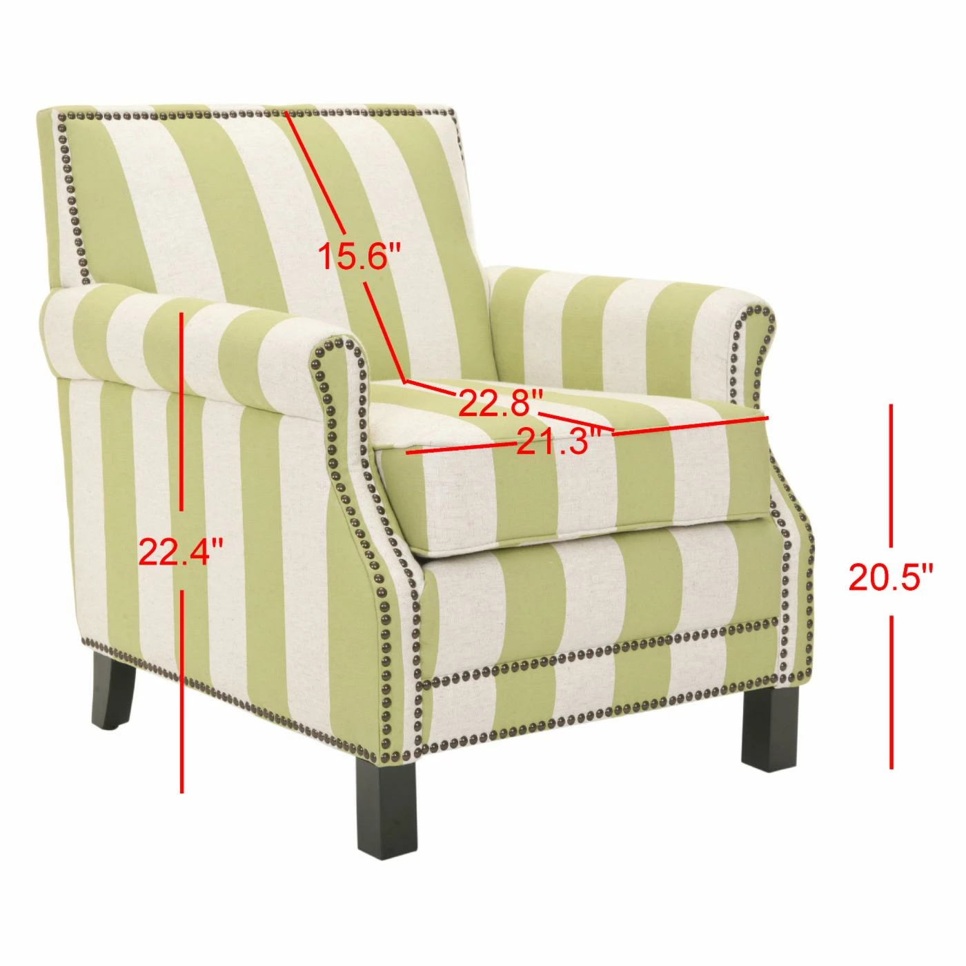 Wide green and white stripes ensure the Safavieh Easton Club Chair with Stripes with Brass Nail Heads will spruce up any room in your home. Sure to be the centerpiece of your den, living room, or boudoir, this bold club chair boasts dignified details such as rolled arms, a tight back, and a welted box seat cushion. Extra drama comes from its brass-finished nail head trim.