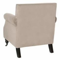 Who says casual can’t be elegant – the Safavieh Karsen Club Chair – Taupe lets you have it all. This handsome club chair has beautifully detailed design, found in such elements as its sloped arm fronts, lovely silver nail head trim, and turned front legs, making it a sophisticated showpiece perfect for entertaining friends and family. On the other hand, the pure cotton fabric and plump seat and back cushions make it a comfortable everyday chair in the style of rolled arm smoking chairs. The combination of soft mushroom taupe upholstery and espresso-finished legs complements any decor nicely. And the durable cotton upholstery and birch wood constructed frame create a beautiful and sturdy piece that will stay looking nice for years to come.