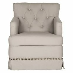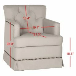 Classic lines and a swivel base make the Safavieh Millicent Swivel Accent Chair with Brass Nail Heads your new favorite living room essential. The traditional look includes a button tufted back, track arms, and a skirted base. Nail head trim in brass adds chic appeal to this accent chair. It’s upholstered in a neutral taupe linen fabric that matches many different patterns and color schemes.