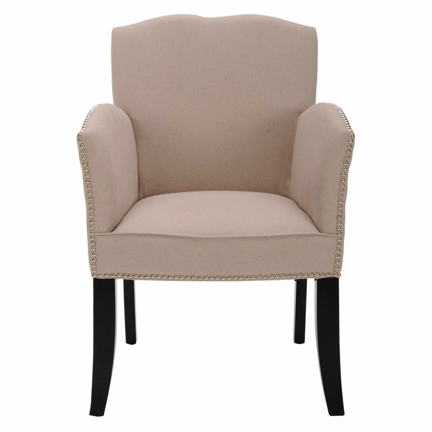 The Safavieh Rachel Arm Chair exudes feminine style with its chic curved arms and wavy-shaped backrest for a little extra glam. The soft linen upholstery is presented in a versatile, neutral taupe hue. Dramatically curved slender legs crafted from birch wood are finished in black to lend it a bold contrast and a daring look.