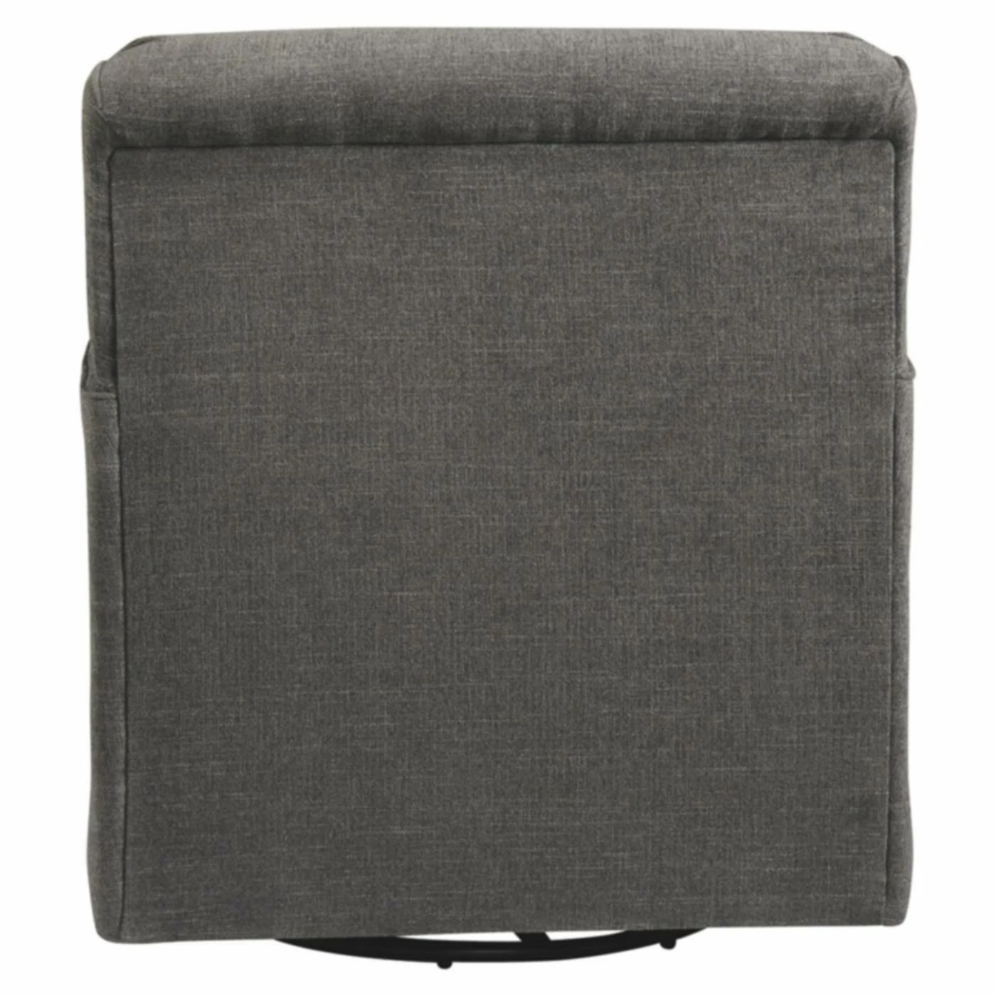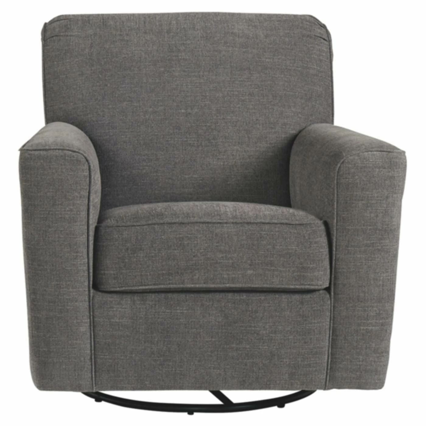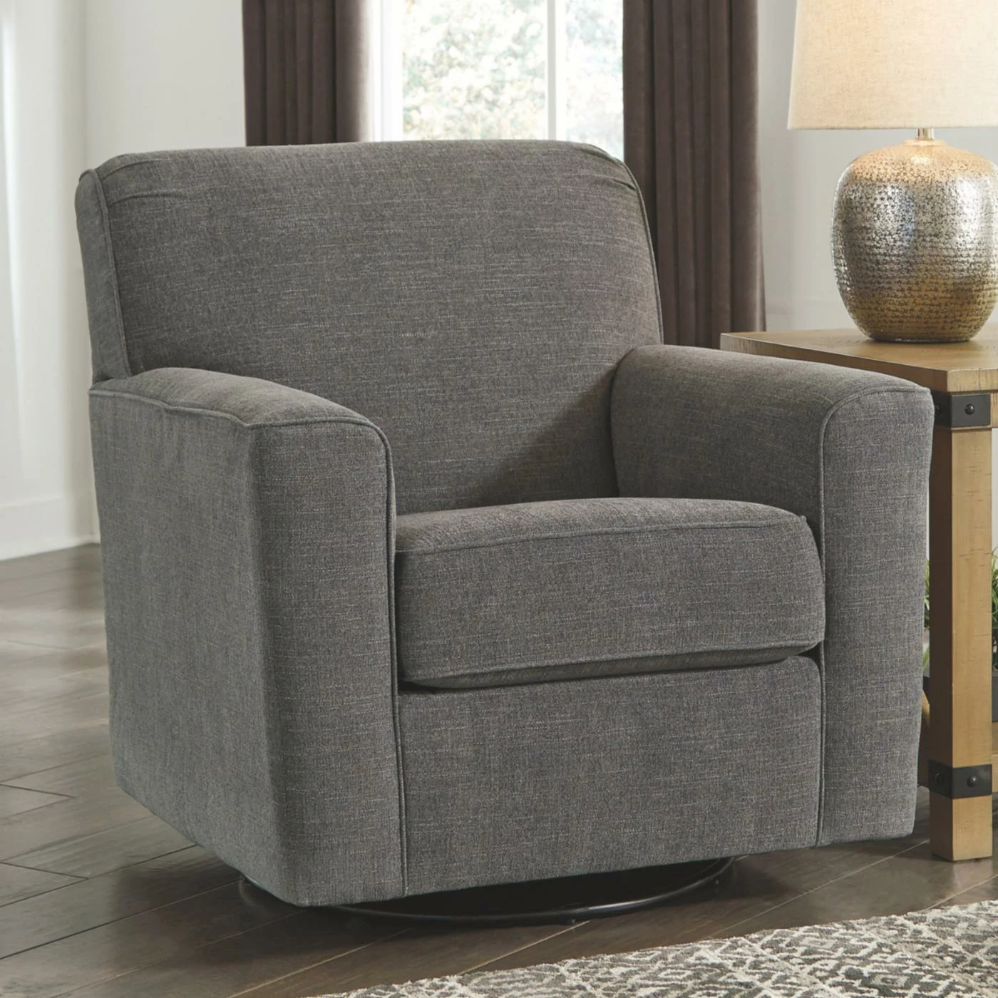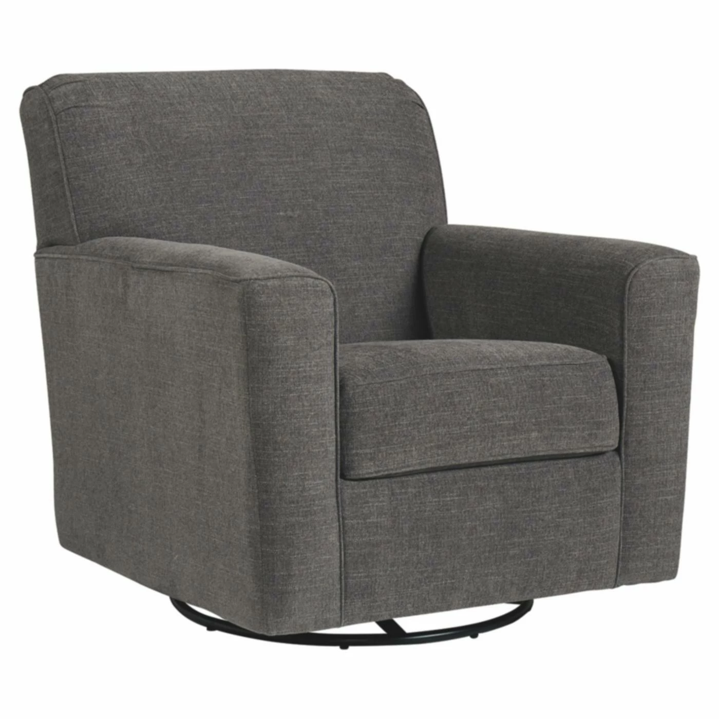 Enjoy the relaxing gliding and swivel motion of the Signature Design by Ashley Alcona Accent Club Chair. This classic club chair features a tailored look upholstered in a deep gray polyester fabric. A thick seat cushion with high-resiliency foam ensures lasting support and comfort.