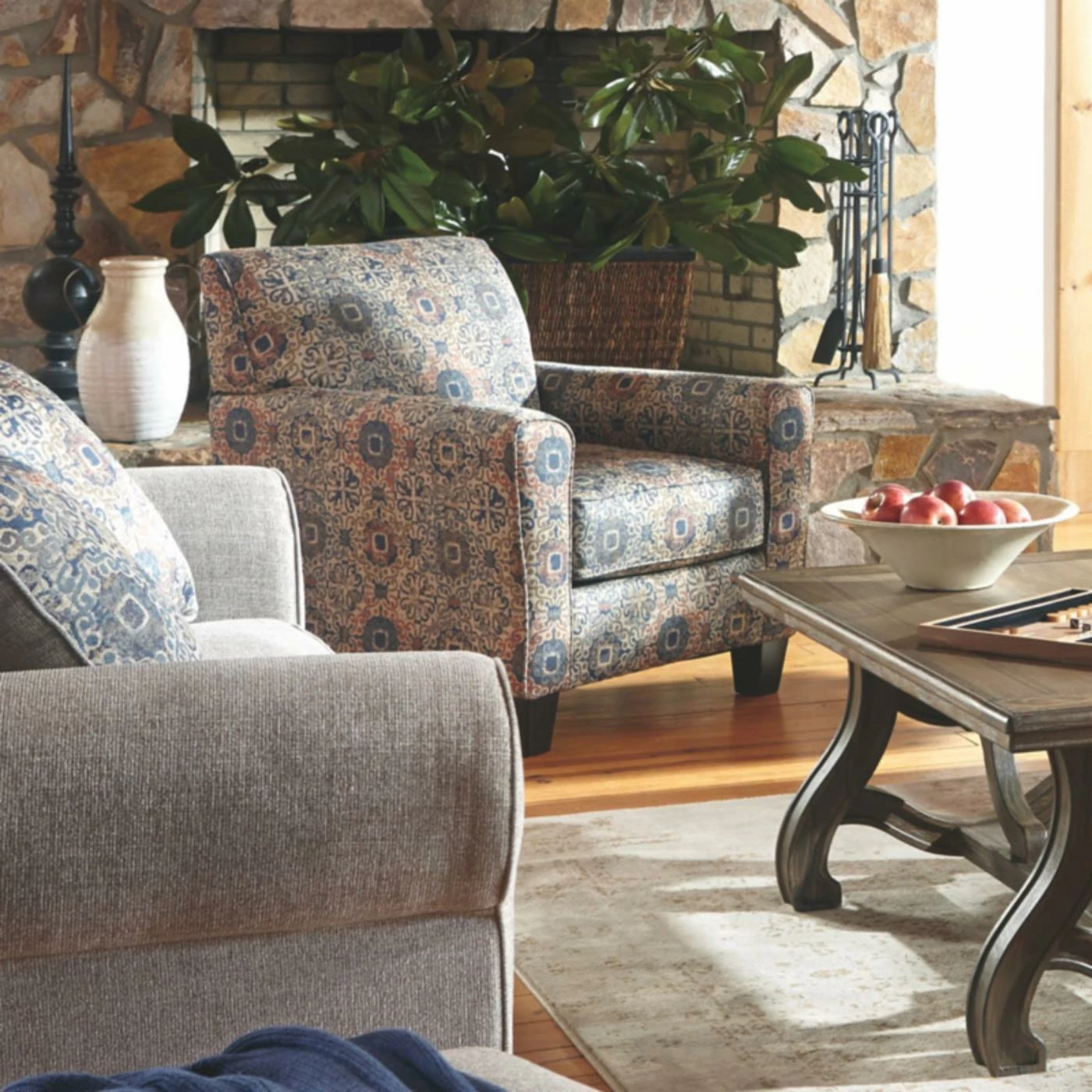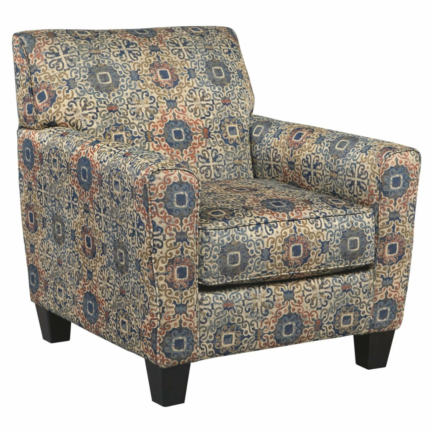 Add visual appeal to your living room with the Signature Design by Ashley Belcampo Accent Club Chair. This club chair features clean lines and tailored details. A bold medallion polyester fabric gives the chair a warm and inviting look. Wood-finish legs elevate the piece and help to lighten the look of the traditional styling.