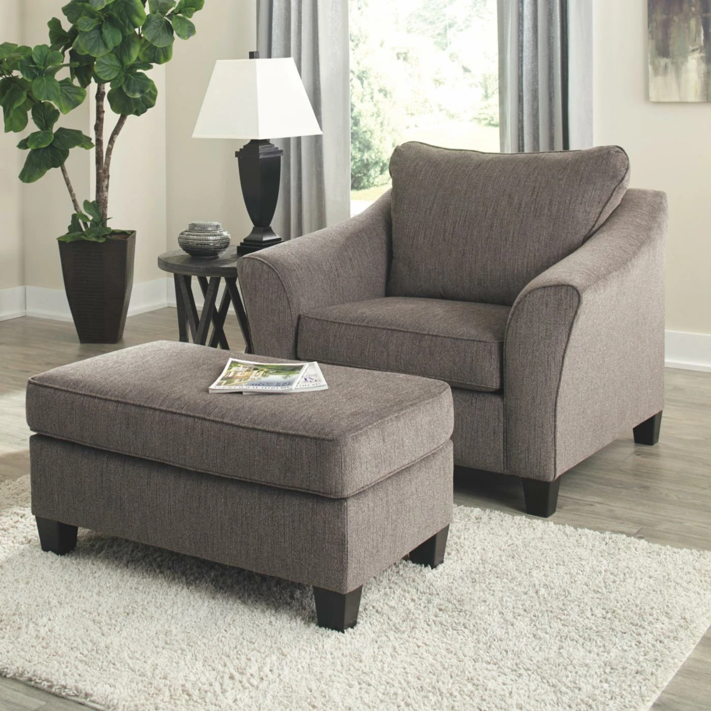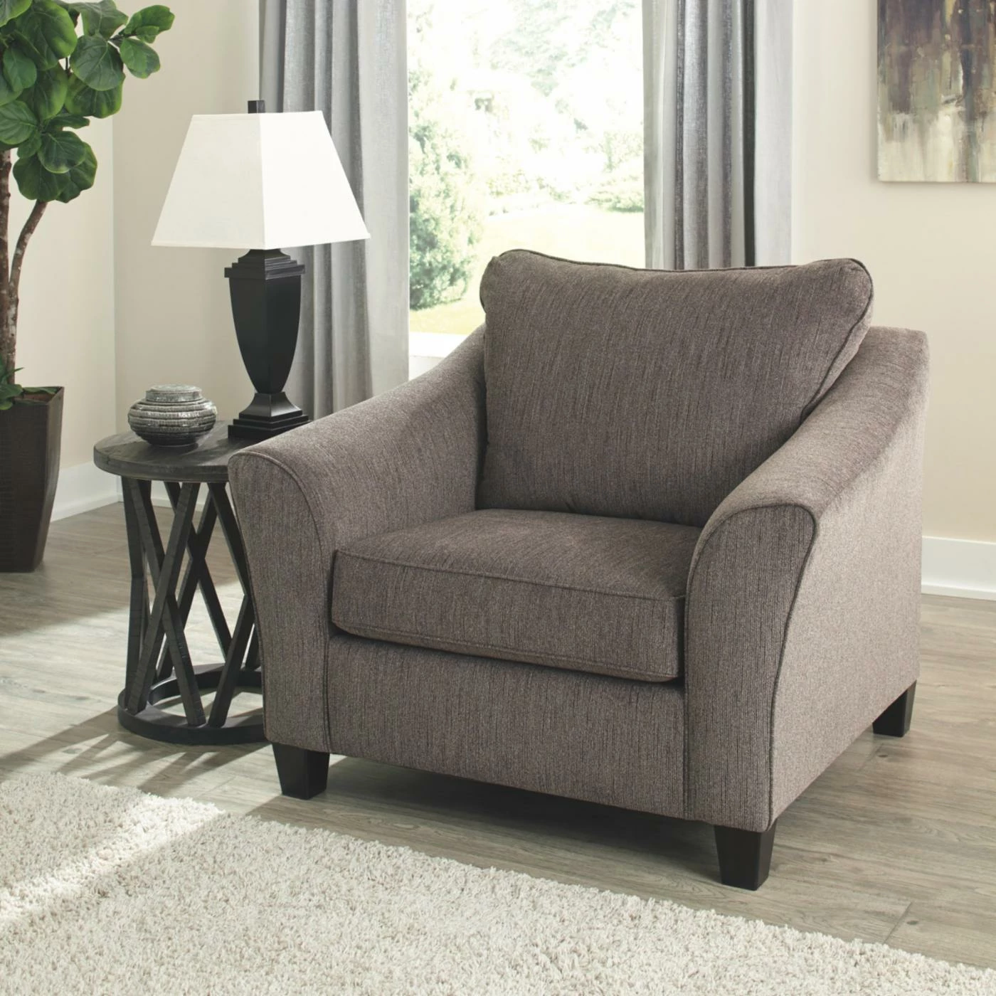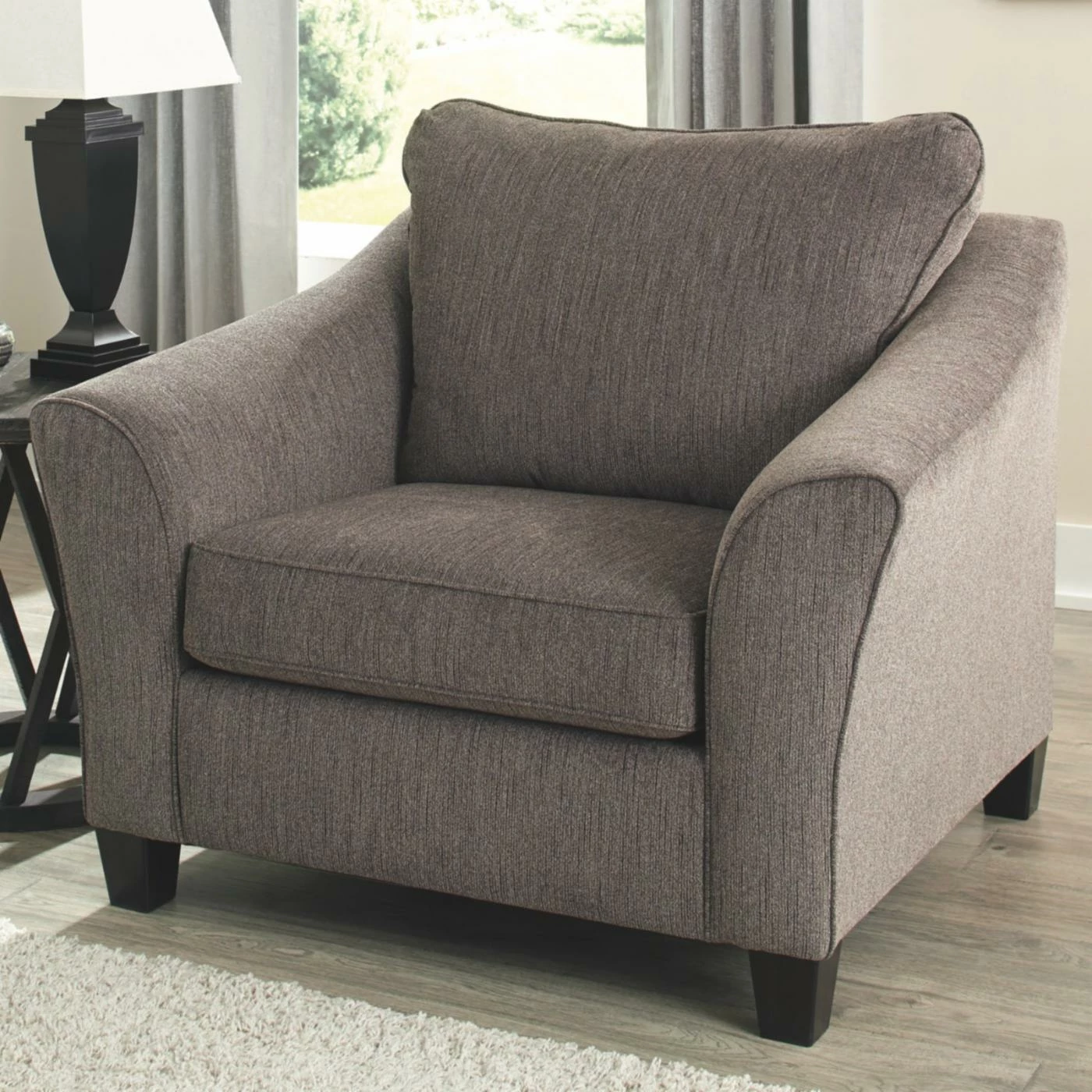 Promote conversation by decorating your living room with the Signature Design by Ashley Nemoli Oversized Chair. This oversized chair offers plenty of room to curl up after a long day. The loose back and seat cushions boast a foam core for comfort. The warm gray tone of the fabric makes it easy to pair with any existing interior furnishings.