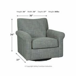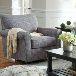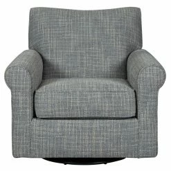 Sporting a tantalizing tweed weave fabric in such a soothing ash gray hue, the Signature Design by Ashley Renley Swivel Glider Accent Chair gives the classic roll arm chair a modern twist. Smooth, 360-degree swivel caters to your comfortβand your viewing pleasure. Gentle glider feature is designed to rock your cares away.