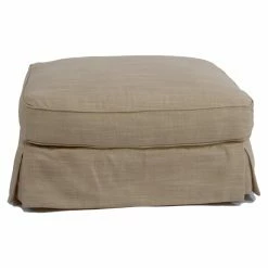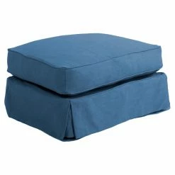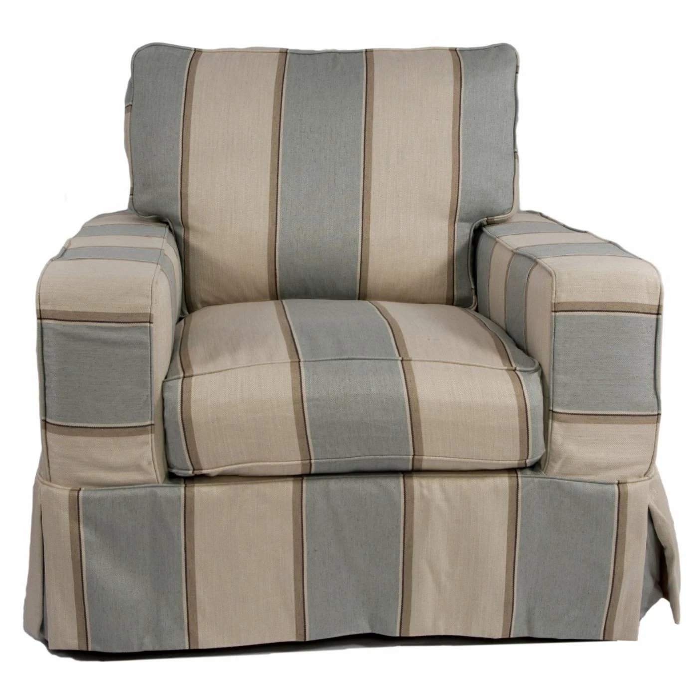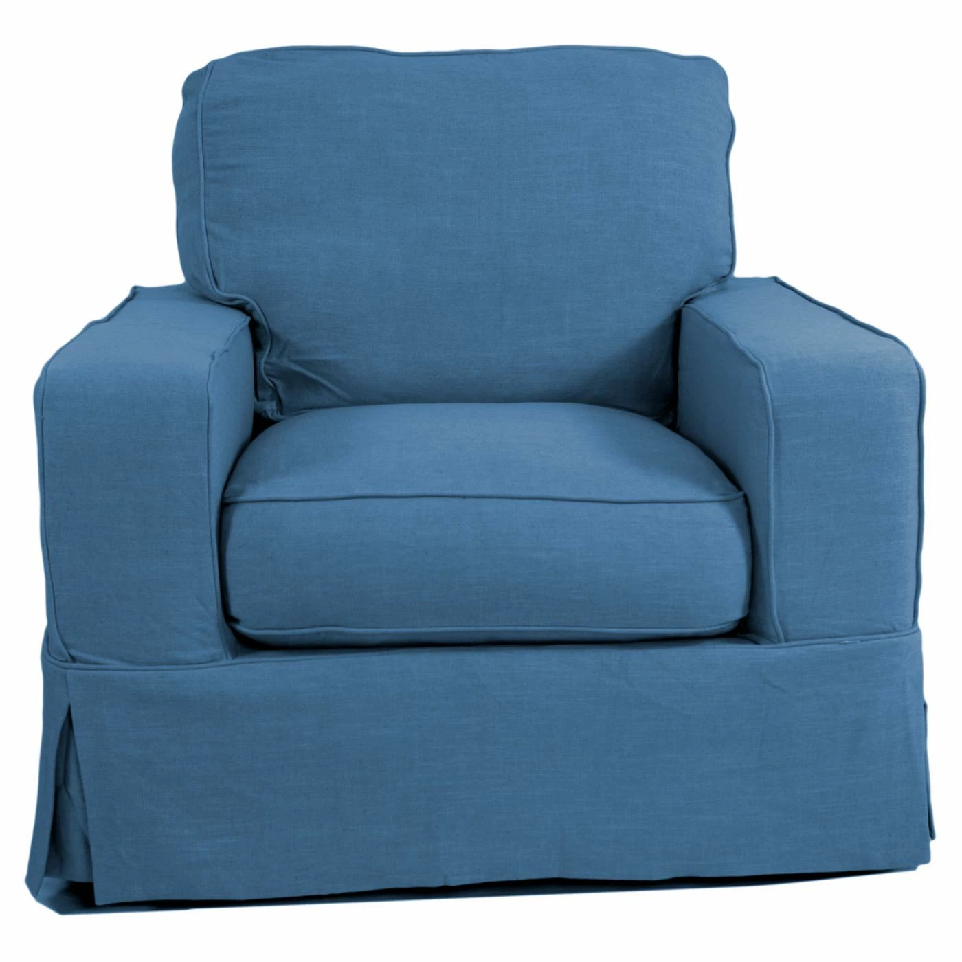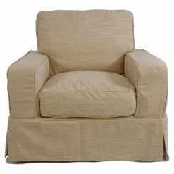 The Sunset Trading Americana Slipcovered Arm Chair and Ottoman gives you a cushioned seat wrapped in clean, tailored style. This set features kiln-dried hardwood frames and polyester blend slipcover upholstery. Choose from the available upholstery colors to best coordinate with your space. A feather-down blend back cushion is paired with a dense foam seat cushion that’s wrapped with Dacron batting. Double-stitched slipcovers, pleated skirt corners, and welt cord details give this chair and ottoman a traditional look. For easy care, the stain-resistant fabric can be spot cleaned with a mild soap and water solution.